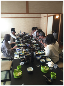 在香湯楼井川,我就趕快入住,由於家庭湯屋要預約,由於去太晚,所以只能預約早上的時段,而且離吃飯時間很近,所以就放一下行李就吃飯了,吃飯是將一個家庭安排在一間榻榻米上吃飯,很有日式風格,另外小朋友若吃完,可以在這邊跑動,不會吵到其他家庭吃飯。而早餐也是一樣的方式。