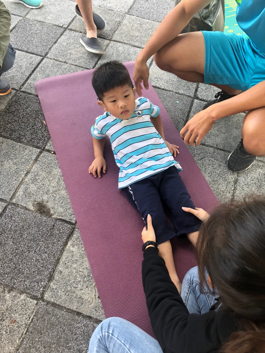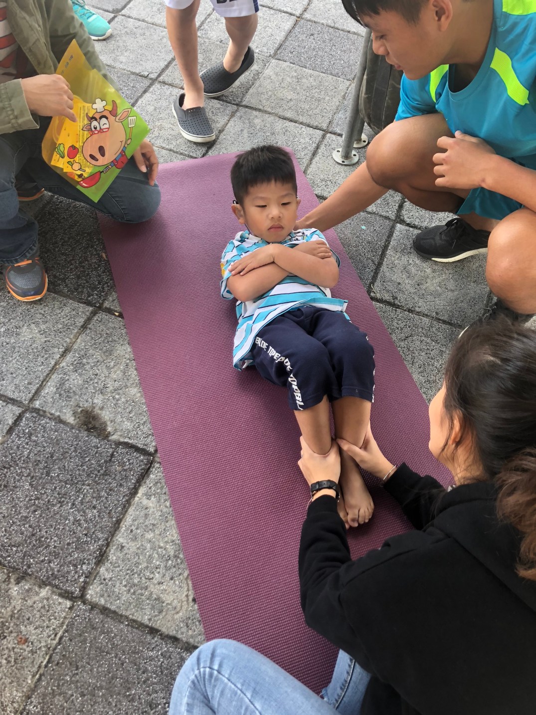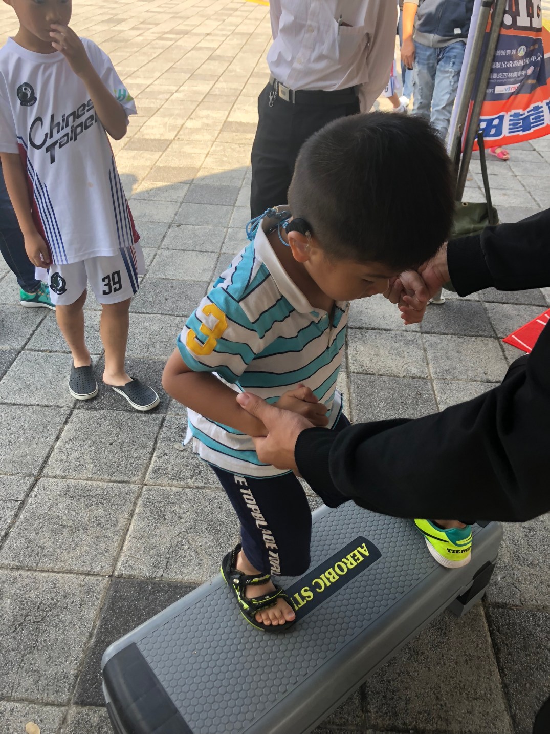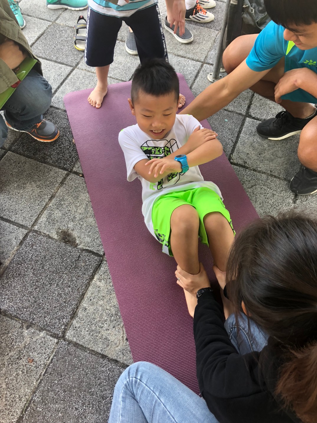 早上游泳過後,簡單吃過午餐之後,下午本來想在圓山站旁的花博場地參觀萬聖節活動,結果小孩被旁邊的足球比賽吸引,就去看比賽,順便玩起闖關活動,最後一關是體適能,所以大小沐沐量了身高體重後,開始做仰臥起坐、上下樓梯等,感覺好累喔!