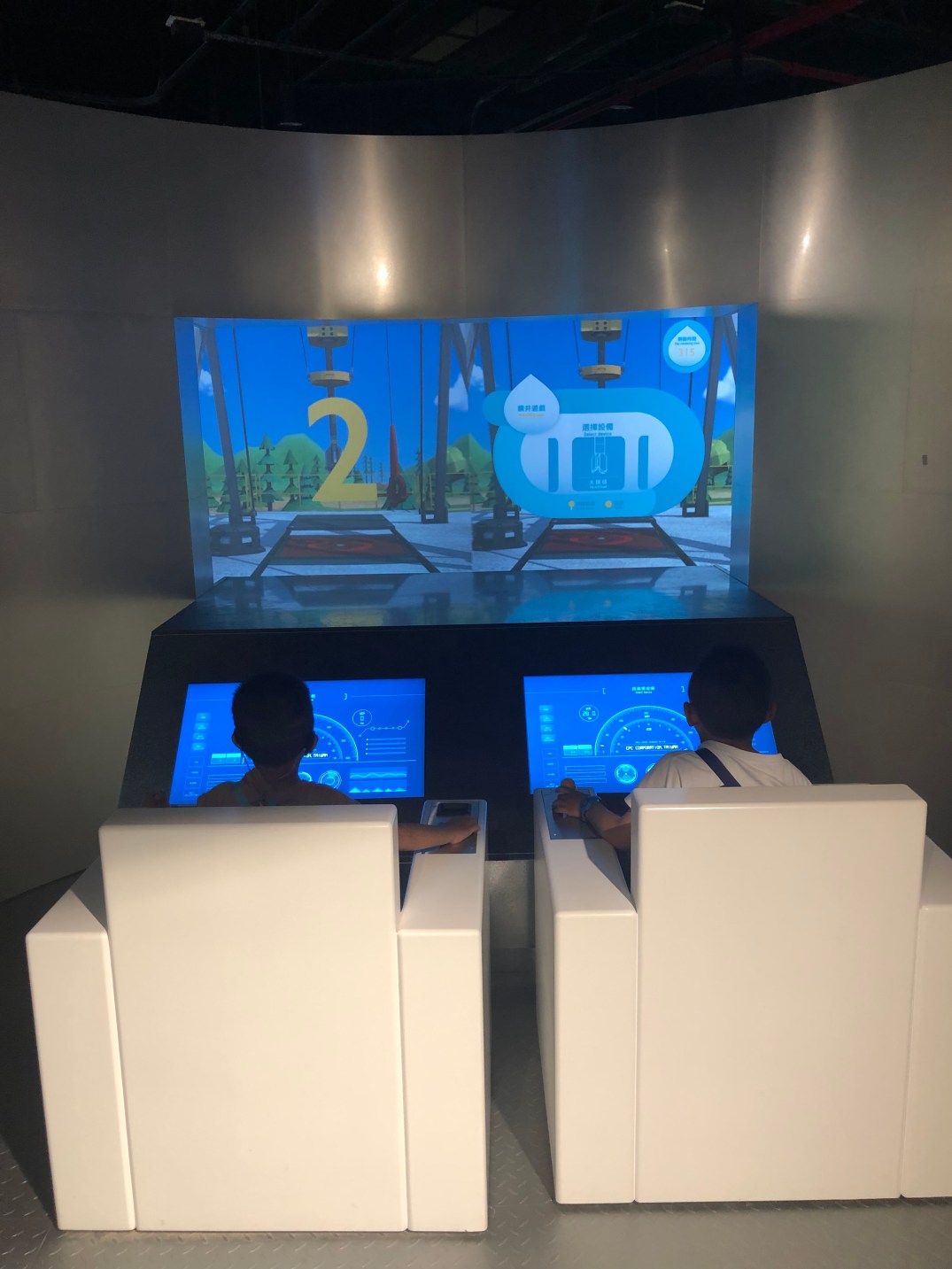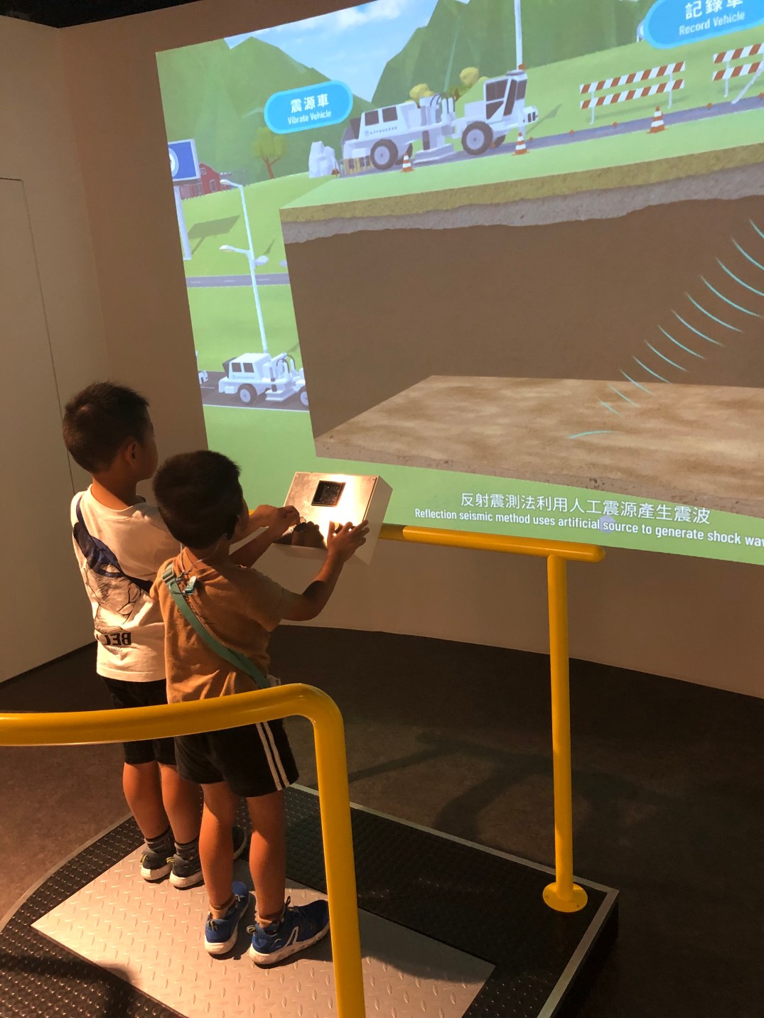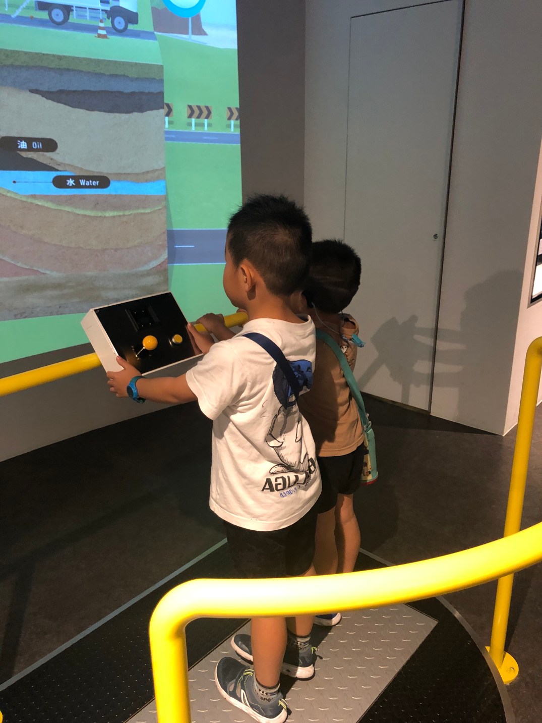 第一個體驗是探勘石油,透過動畫,跟時間搖桿操作,了解如何探勘石油,在玩的時候,地板會動,其實還蠻引起小孩注意。