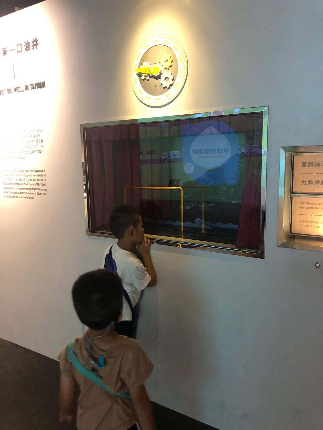 接下來有一個台灣開採石油的歷史介紹,原來苗栗以前也是油井,透過敘述與人偶場景介紹,讓人深刻了解,不過大小沐沐似乎沒有在聽。