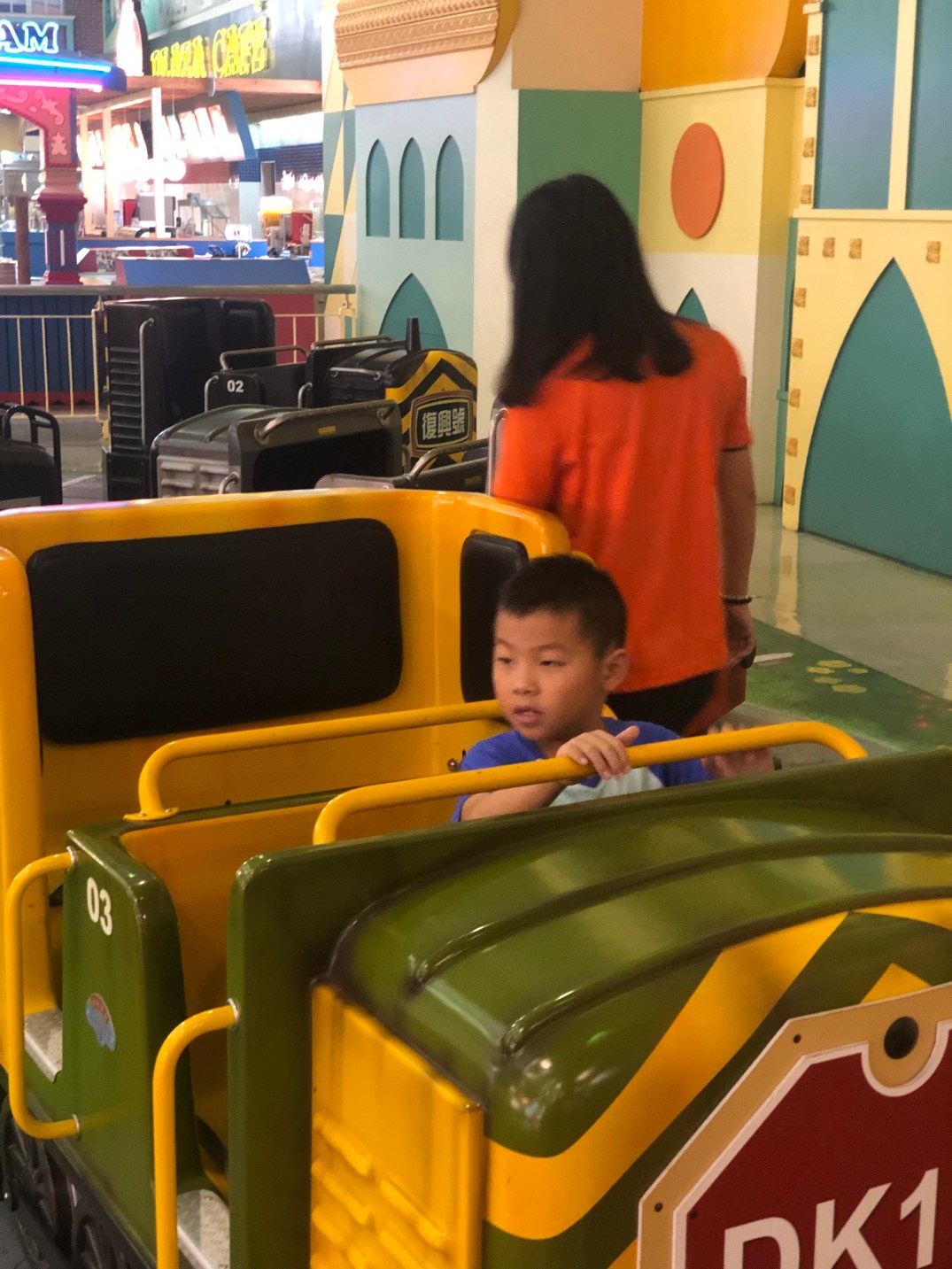 接下來玩太空山,小沐沐身高不夠不可以玩,大沐沐有去玩,沐爸都很用力夾著他,好怕他飛(掉)出去,這時候小沐沐跟沐媽去「侏羅紀探險」,設施比較溫和,看到很多恐龍,所以是輕鬆愉快,沐爸跟大沐沐在大空山結束後,也有去玩一趟。