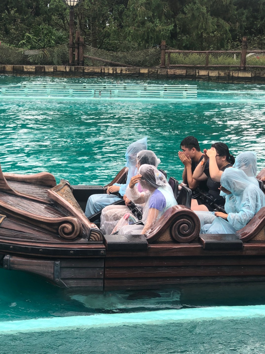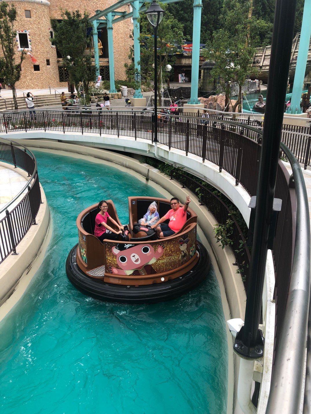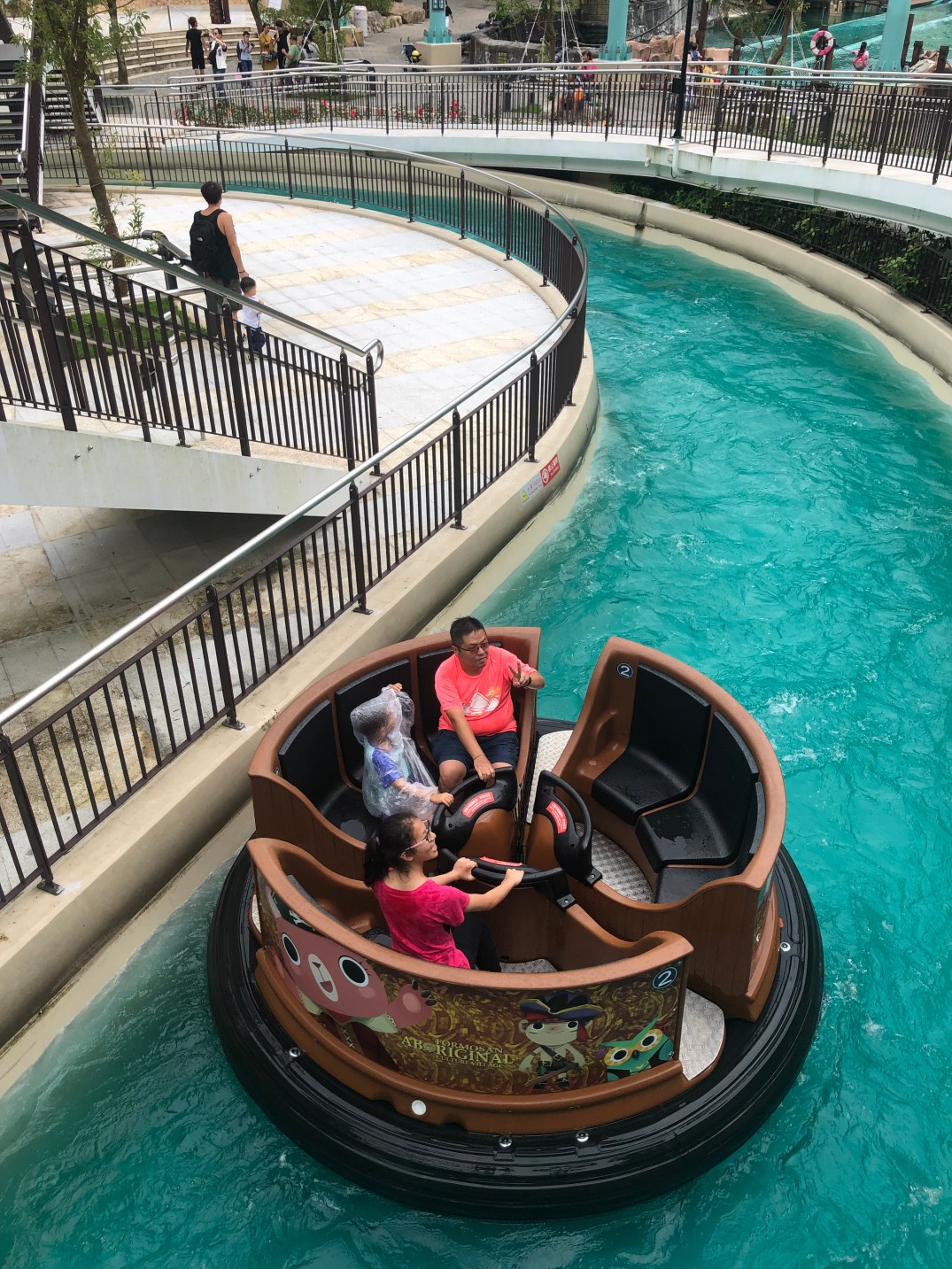 因為水上設施「西班牙海岸」都要快10點才開始,我們玩的差不多就上去玩水上設施,由於沒有帶雨衣所以買了幾件給大家穿,沐爸覺得還好,就沒有穿,首先玩「無敵艦隊」,沐沐一家坐第二排,大小沐沐在中間,沐爸沐媽在外側,結果從高點到低點的時候,我前半部都濕了,其他三人因為有雨衣都沒有事。接下來有榴彈攻擊,所以也是避不掉,還是會濕掉,所以雨衣很重要。沐爸努力讓自己不濕掉後半部。