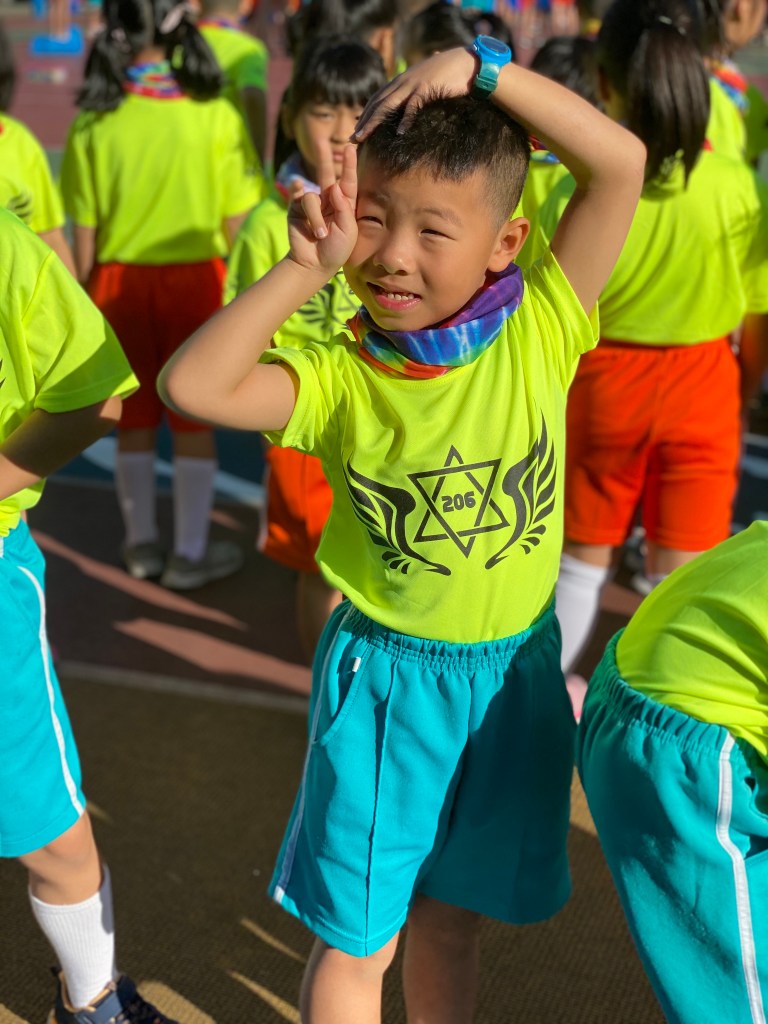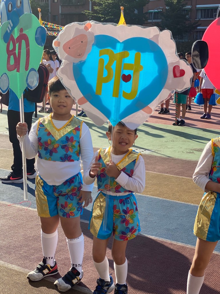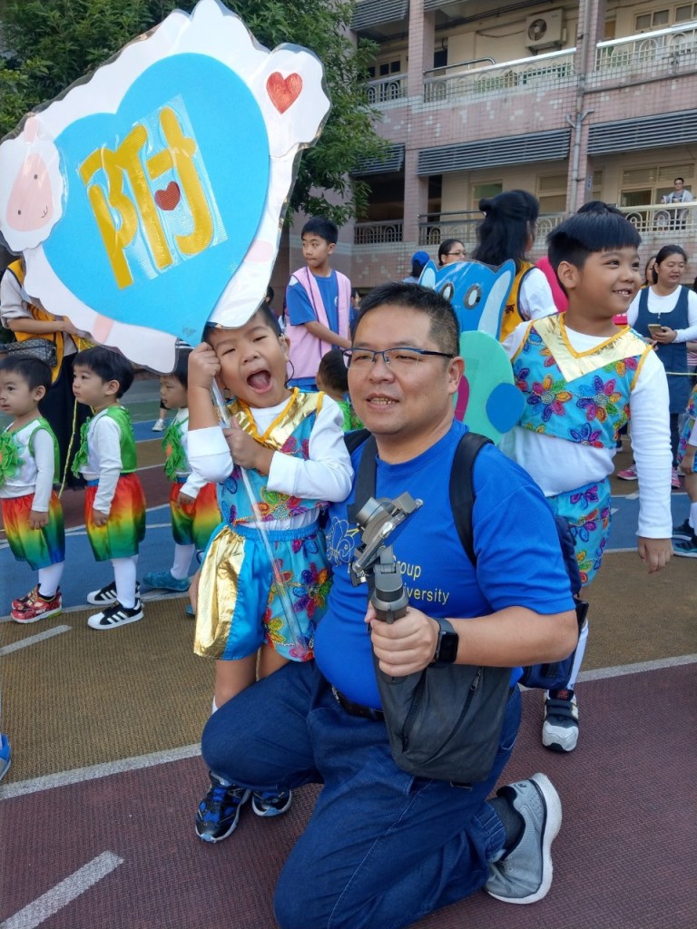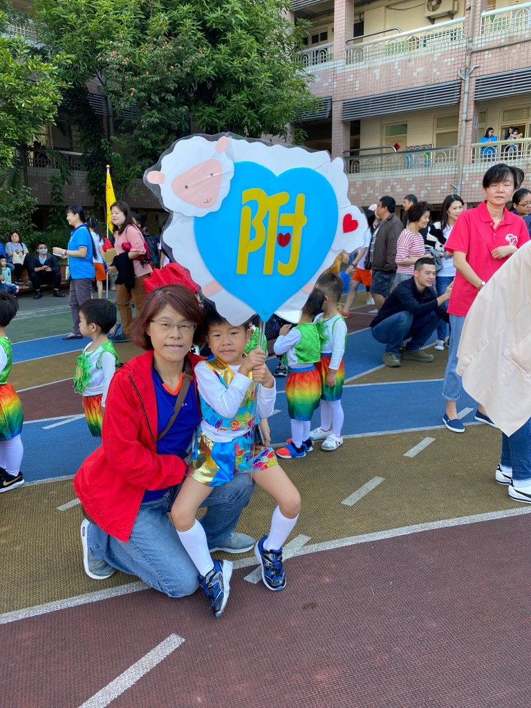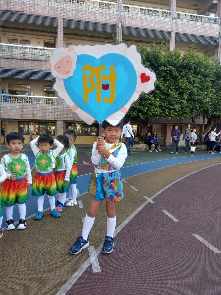 接下來排程都跟大小沐沐無關,但看到高年級的大隊接力,還是很緊張刺激的。等待出場的時間,我們跟小沐沐在幼兒園拍照,直到出場。