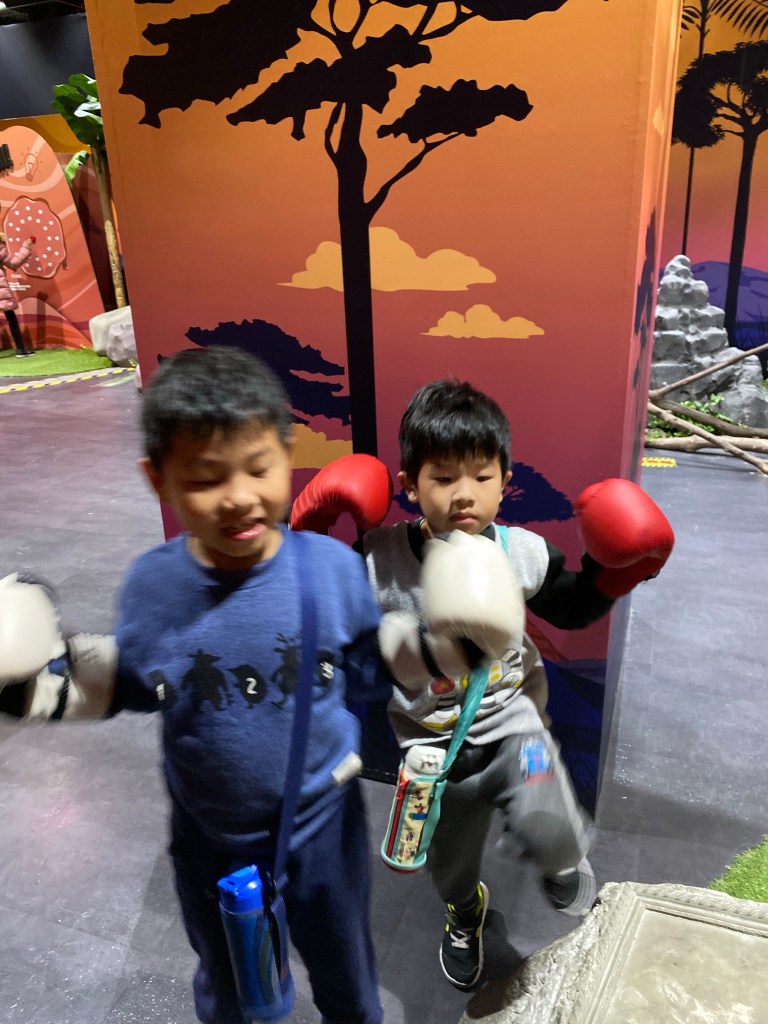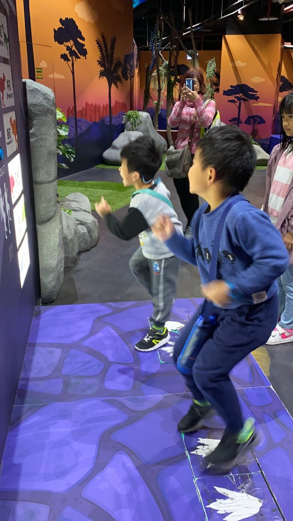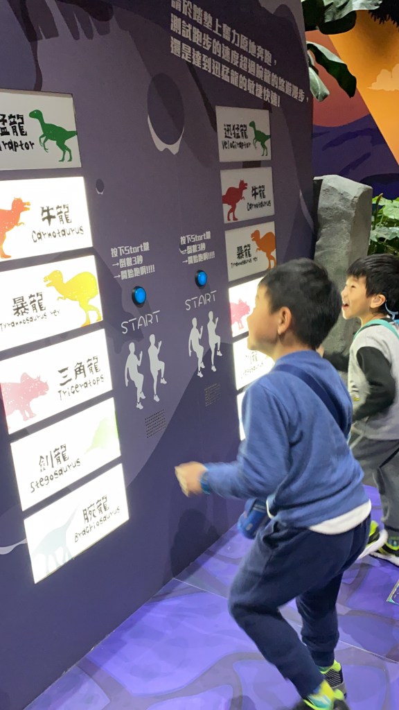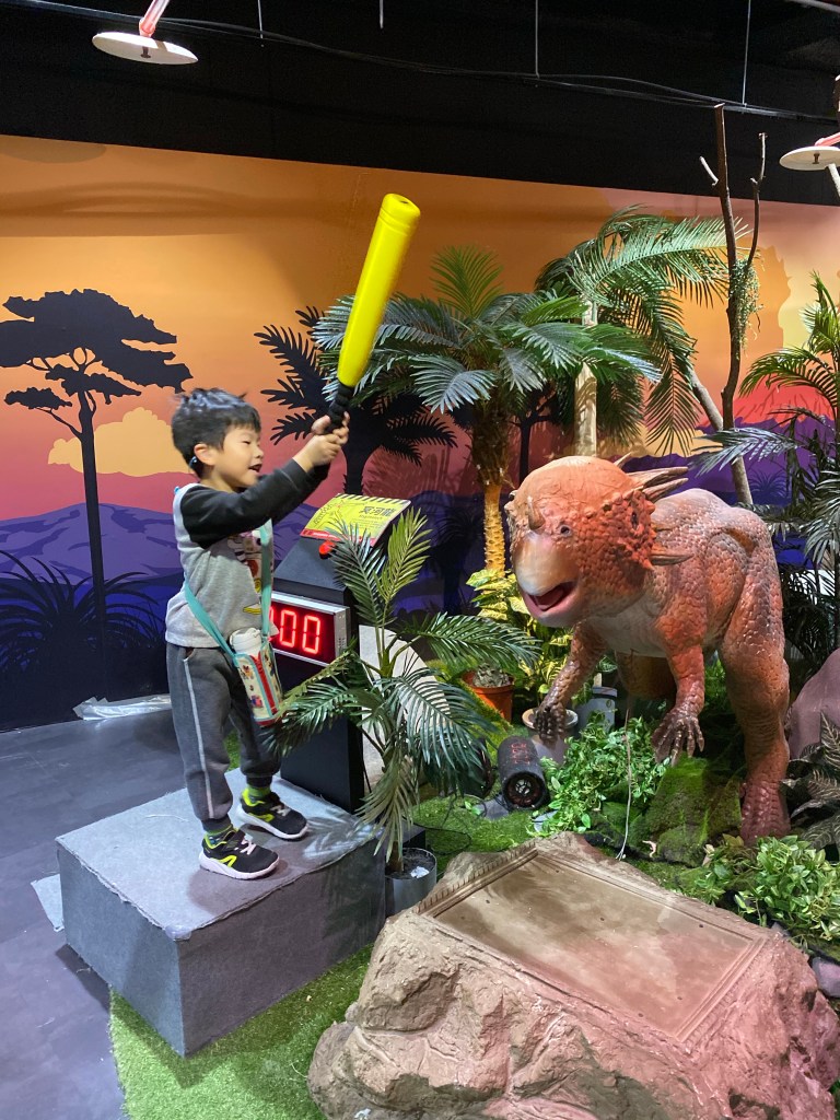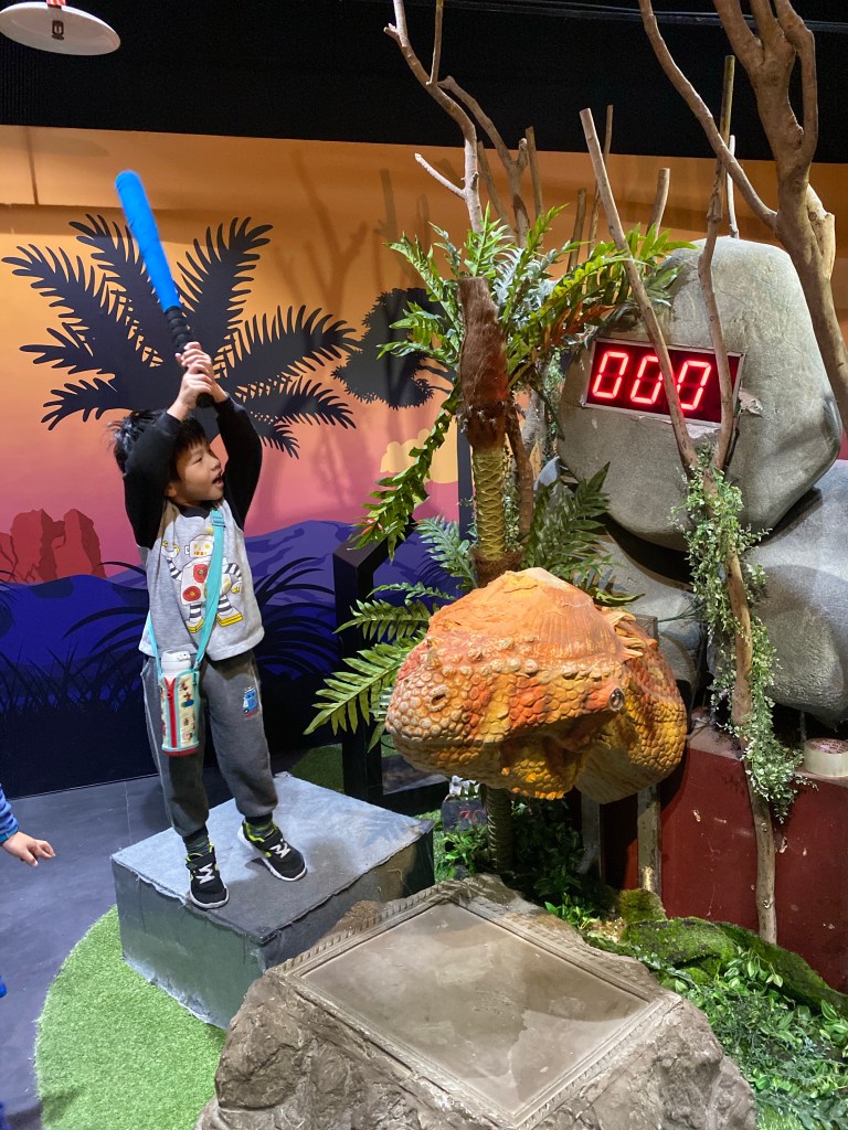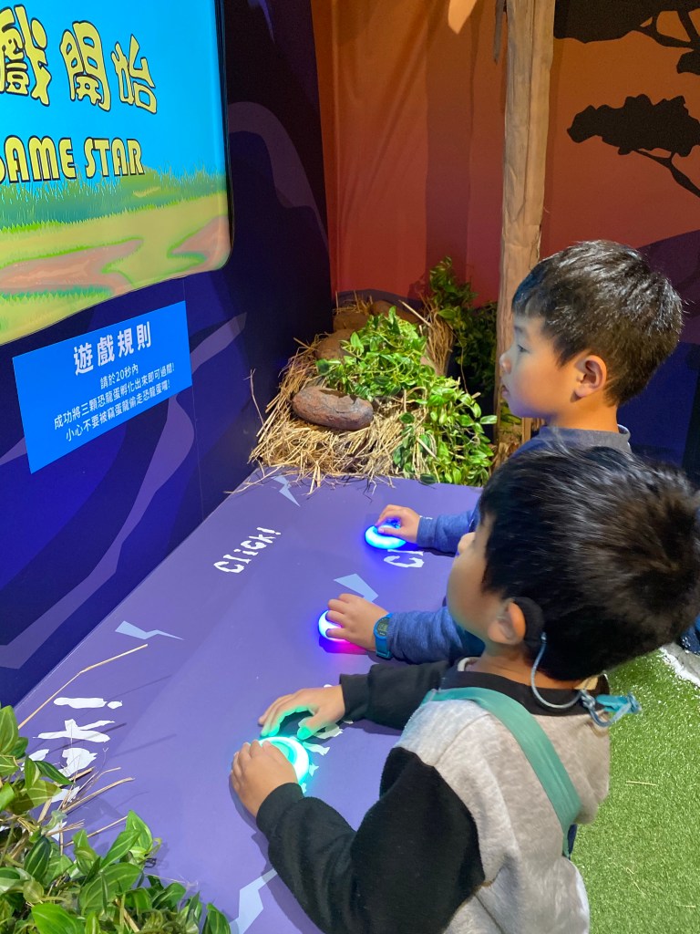 互動區的第一站就是跑步,透過跑步速度來決定你是哪一種恐龍奔跑的速度;第二站,就是跟恐龍拔河,原則上小朋友+大人的力量就可以獲勝;第三站,打擊力道,這邊有蠻多機台的,有用棍子、拳擊手套,打擊恐龍,他會顯示力道是多少;第四站,套圈圈,使用圈圈套住恐龍;第五站,搶救恐龍蛋,透過快速按按鈕,讓恐龍蛋孵出小恐龍,避免蛋被偷走;第六站,手眼反應速度,就是兩個亮燈的圓圈在同一個位置時,按下按鈕,一般小朋友不太理解這一個玩法,所以他們都覺得無聊;第七站,這一個是猜蛀牙,手放入恐龍的嘴巴,猜錯會被咬住,這一個小朋友也不太知道怎麼玩,大人也是看了一兩次才懂玩法,互動區域還真的很有創意。