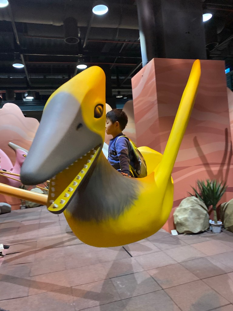 另外一區為乘坐翼龍的遊樂設施,小小六個座艙飛起來約1公尺高,小朋友都會非常開心。大小沐沐就玩了三次,因為一大早沒有什麼人,就玩第一次,然後去逛其他設施,然後又回到這邊完第二次,接著玩第三次,人才漸漸變多,開始有人在排隊了。