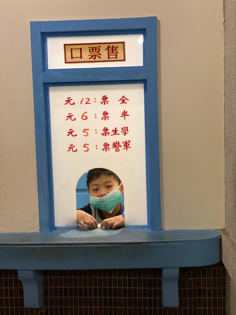 吃飽之後,大小沐沐開始玩角色扮演的活動,要當電影院售票員、工廠外的保全等等,就大概走一圈。