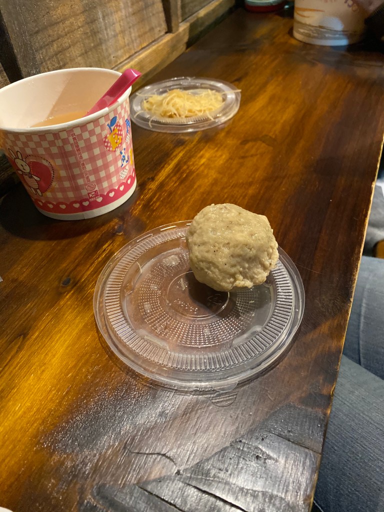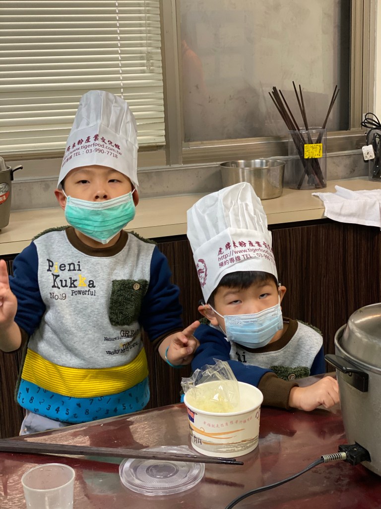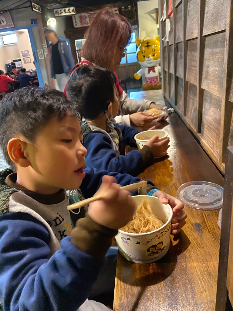 完成後,就是吃自己做的米粉,然後這邊也有提供免費的米粉可以吃,味道兩個不太一樣,我們又買了這邊的大魚丸吃,所以沐沐一家吃的津津有味。