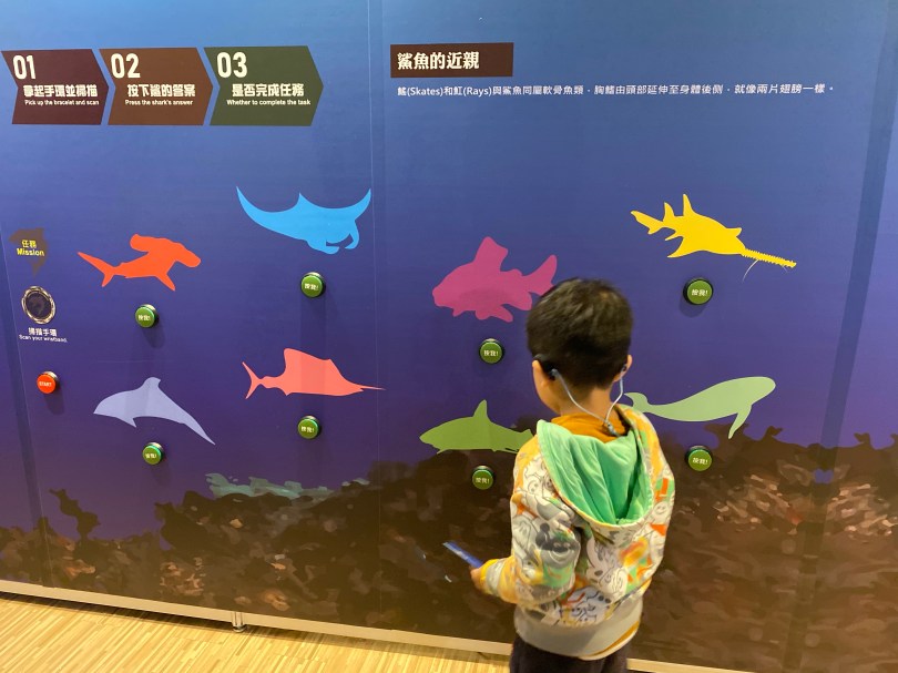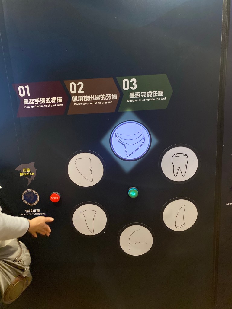 進去之前要拿一個手錶,手錶上有有一個IC,可以感應裡面的相關遊戲,讓後會做一些紀錄,裡面有很多遊戲可以讓你對於鯊魚有一定的認識。