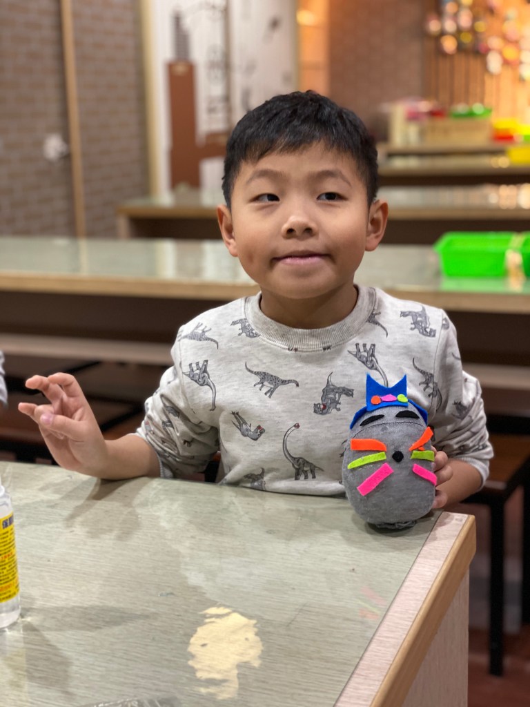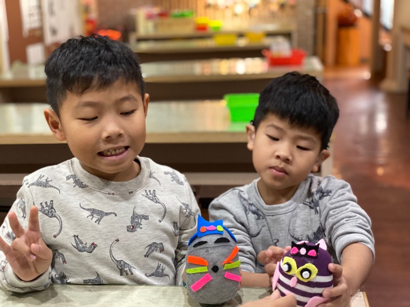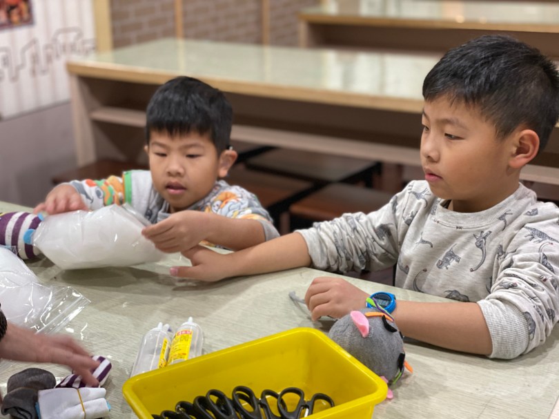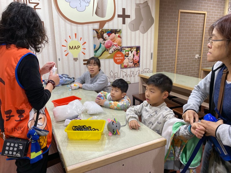 因為很早來,我們就購買DIY產品來製作,用襪子做一些裝飾品,這邊都是配好相關材料,材料為襪子、棉花、棉布,然後開始製作,至於黏合方面用保麗龍膠,所以不用等太久,可以牢固。