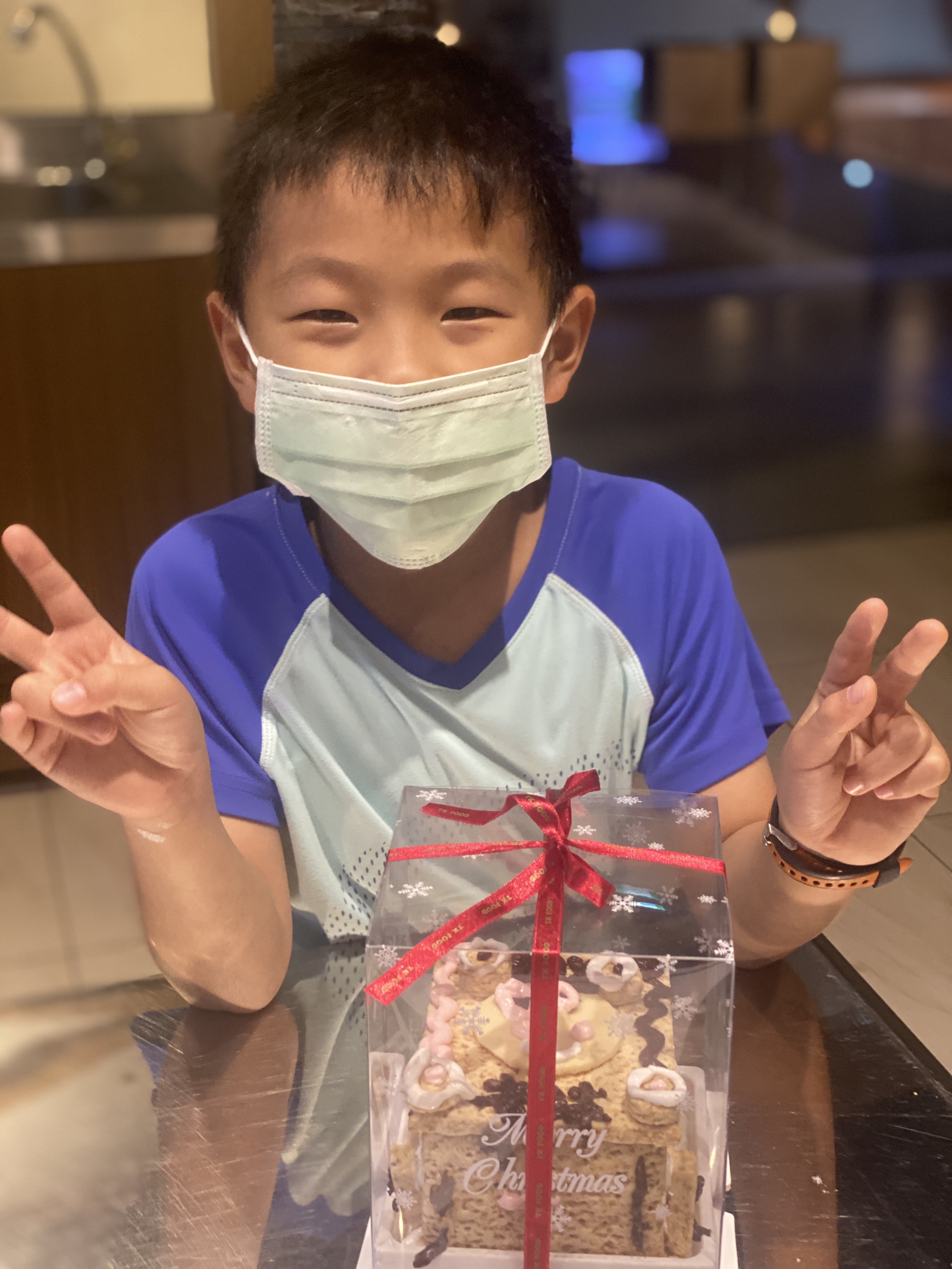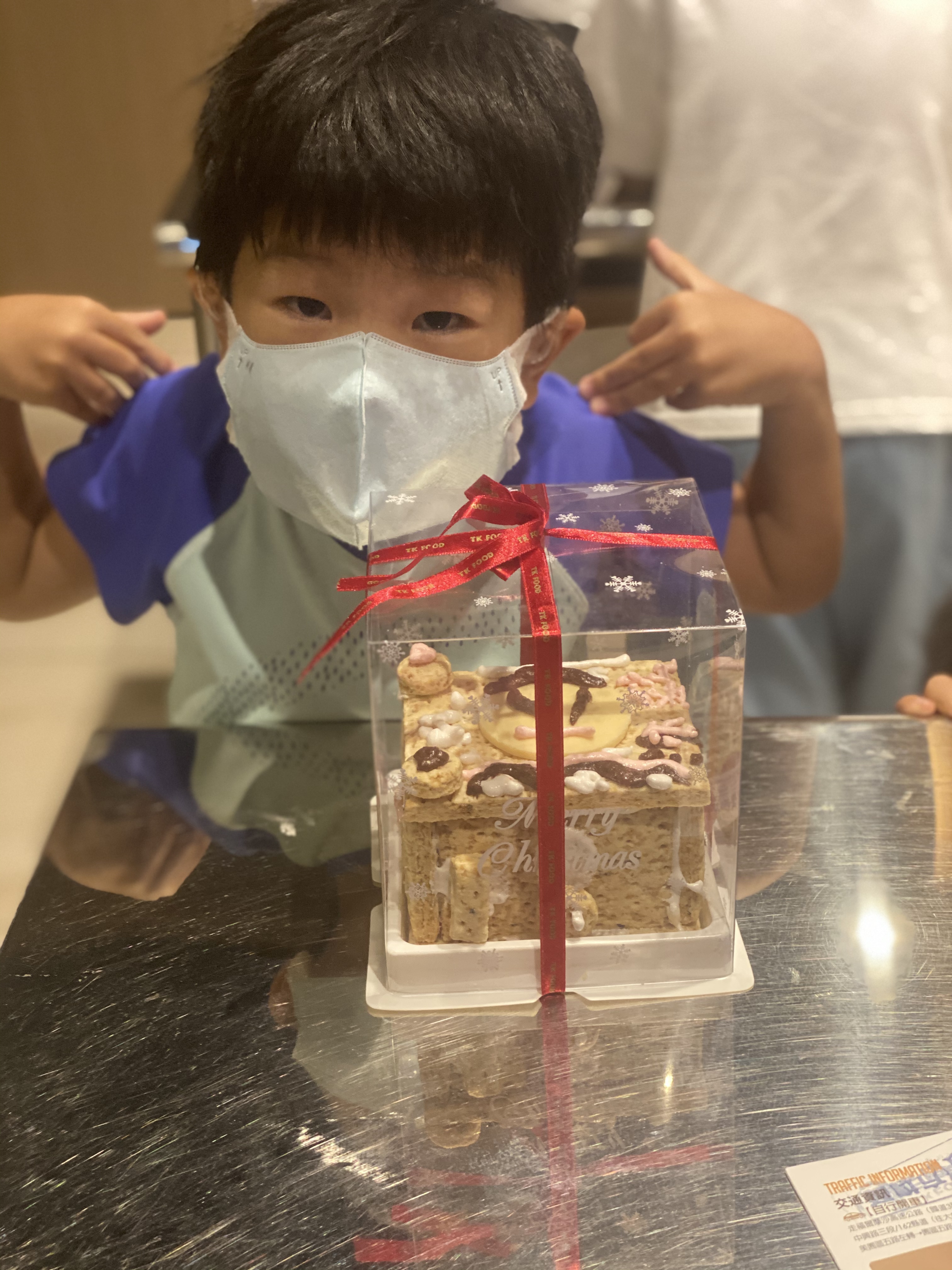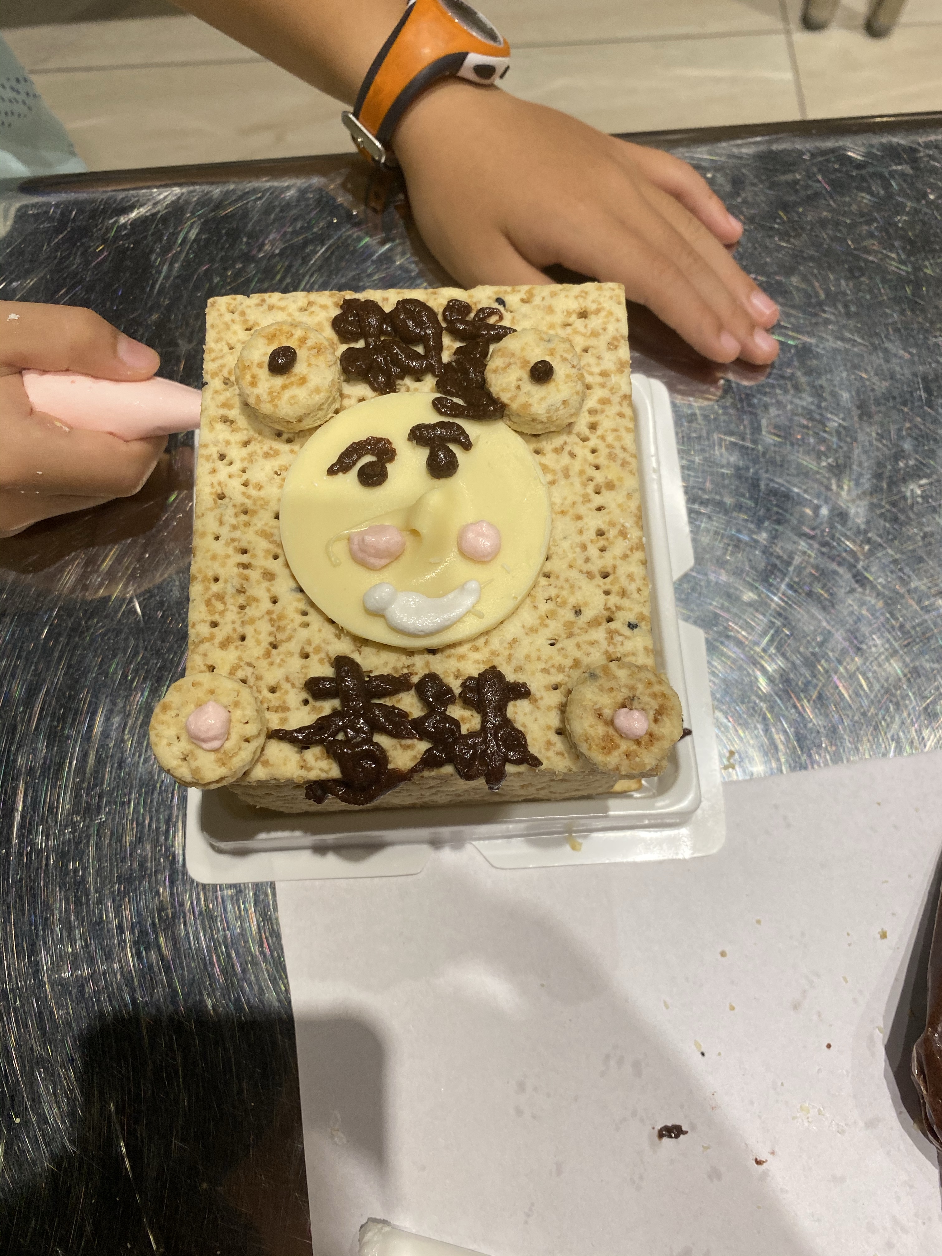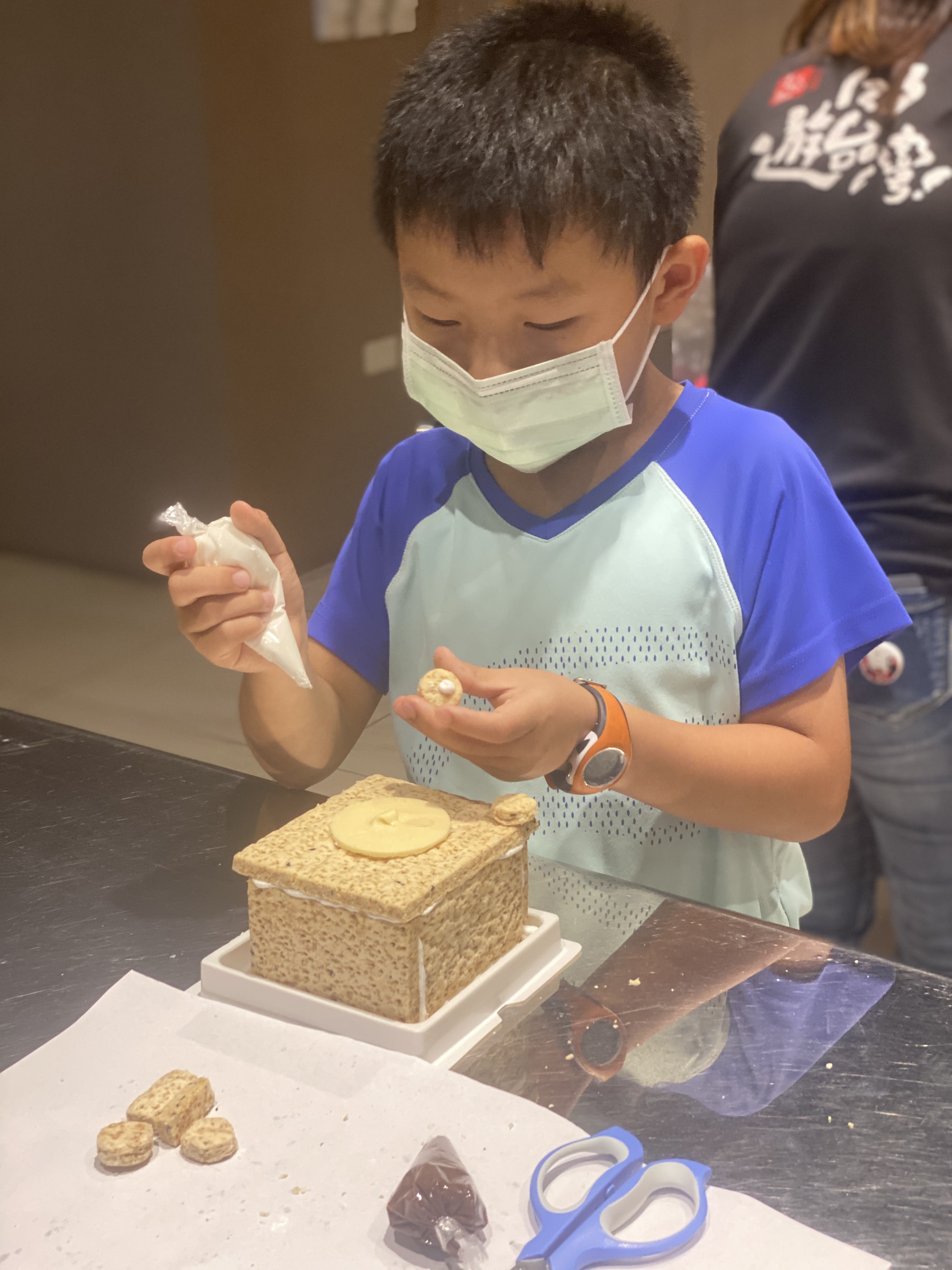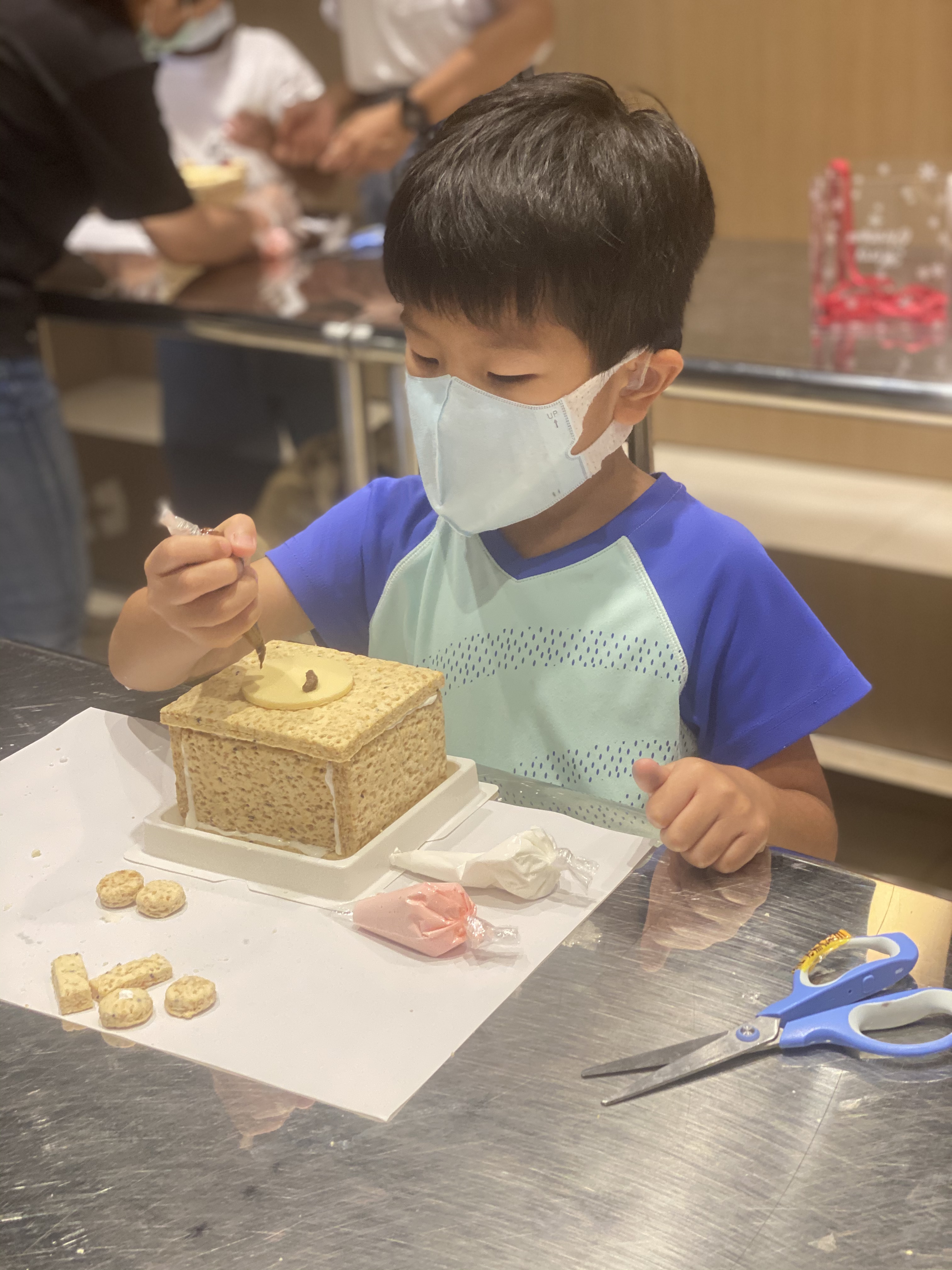 上下的DIY的產品不同,原則上不難,就是方塊酥用不同顏色糖漿黏一黏,然後用糖漿畫不一樣的圖形, 大小沐沐都有不同想法,所以製作的成果有一些不同。(一個DIY方塊酥,在晚上當消夜吃掉了)