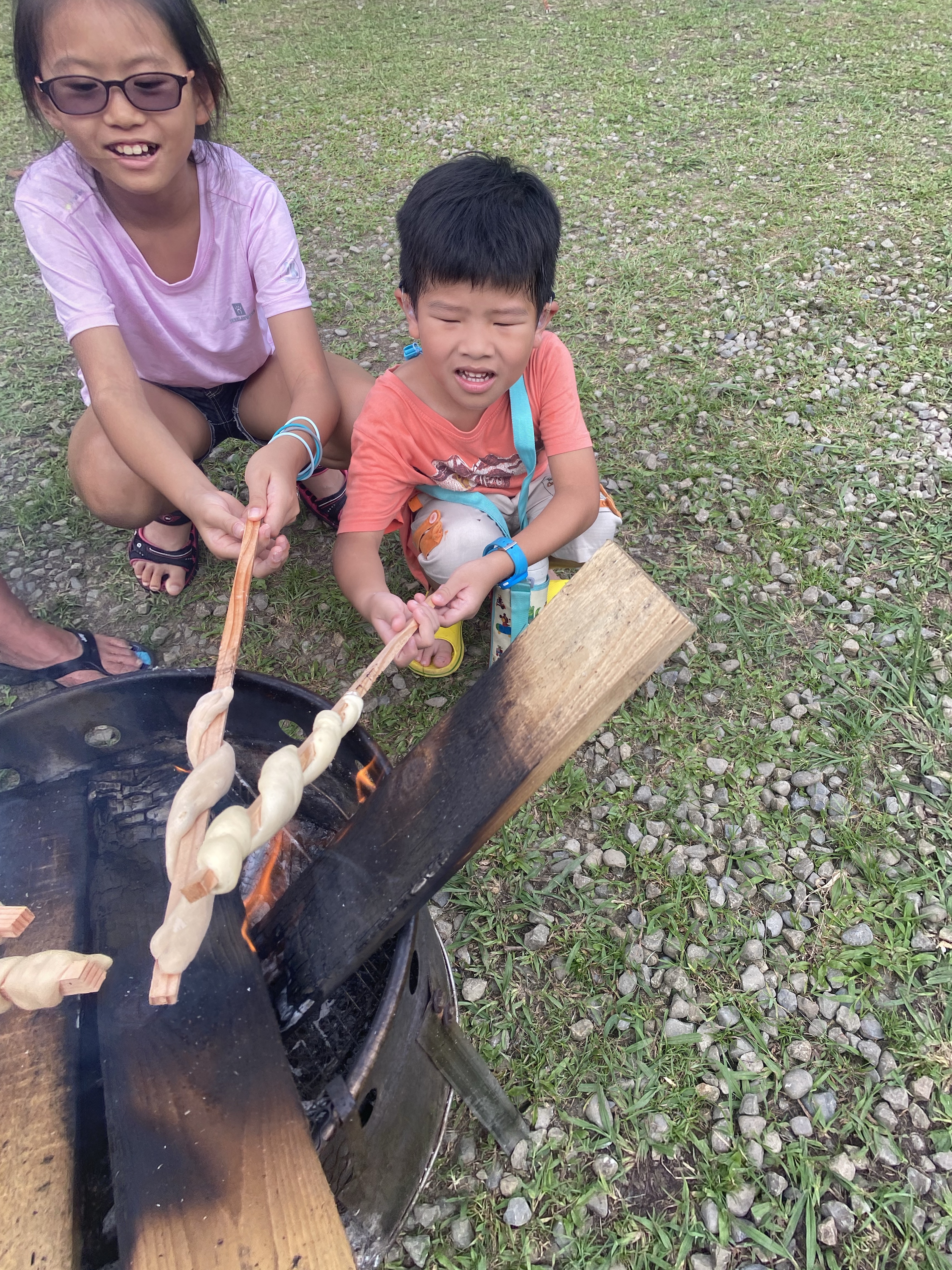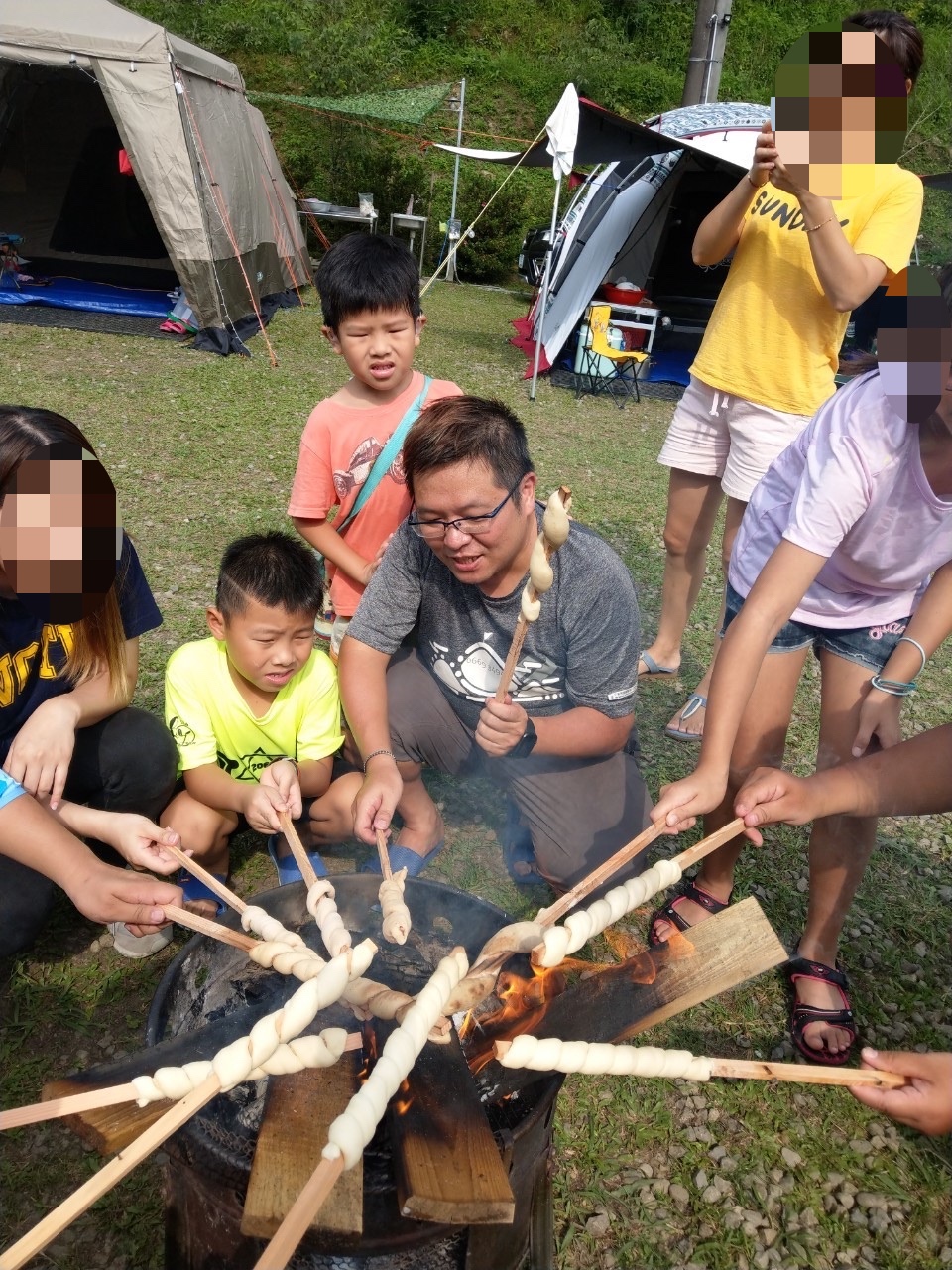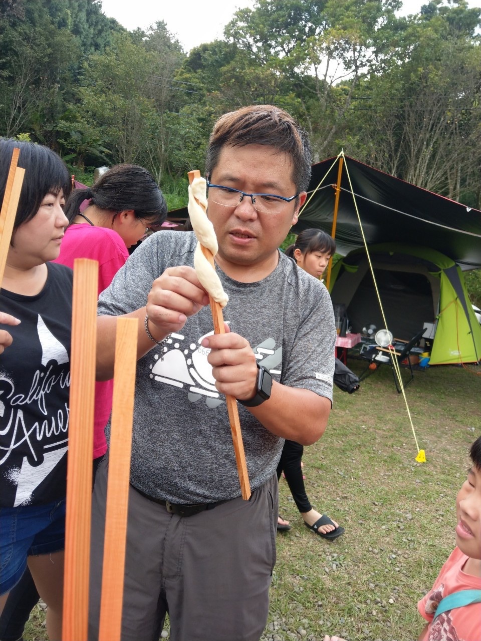 這次活動安排有四個,一開始的玩潑水遊戲,大小沐沐沒有興趣,所以就沒有參加。接下來有簡單的下午茶,喝仙草冰,結果只有沐爸沐媽喝。第二個活動是烤蛇餅,很早以前沐爸就玩過,這次看主辦者的準備食材的部份,唯一不同是用木材代替竹材,烤出來的蛇餅一樣好吃。