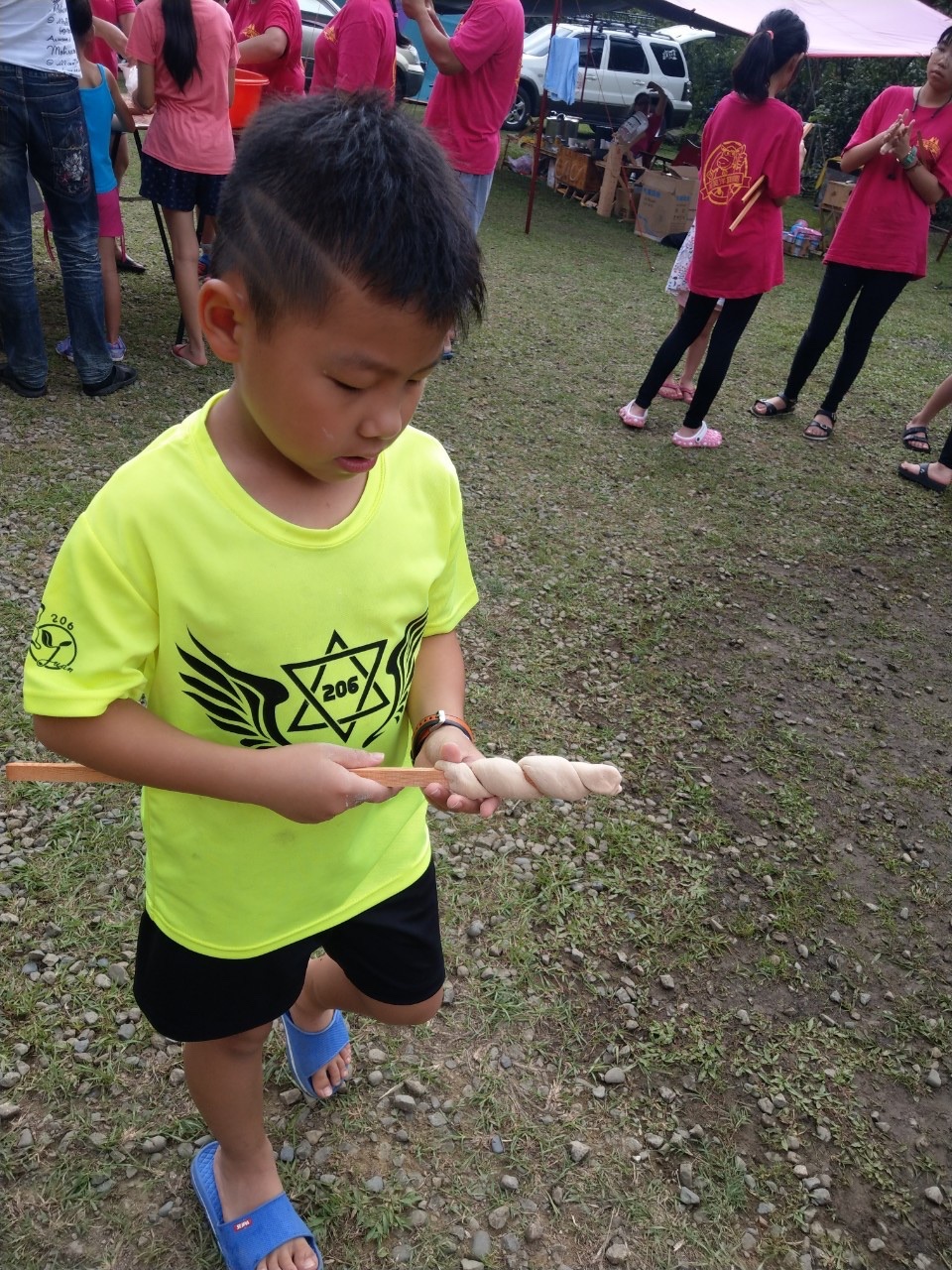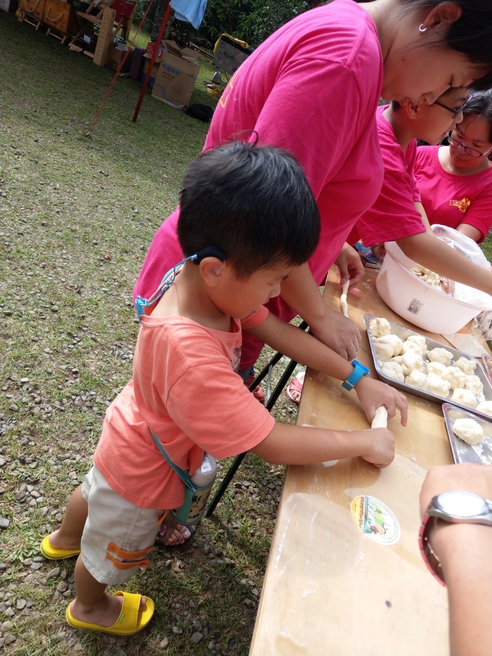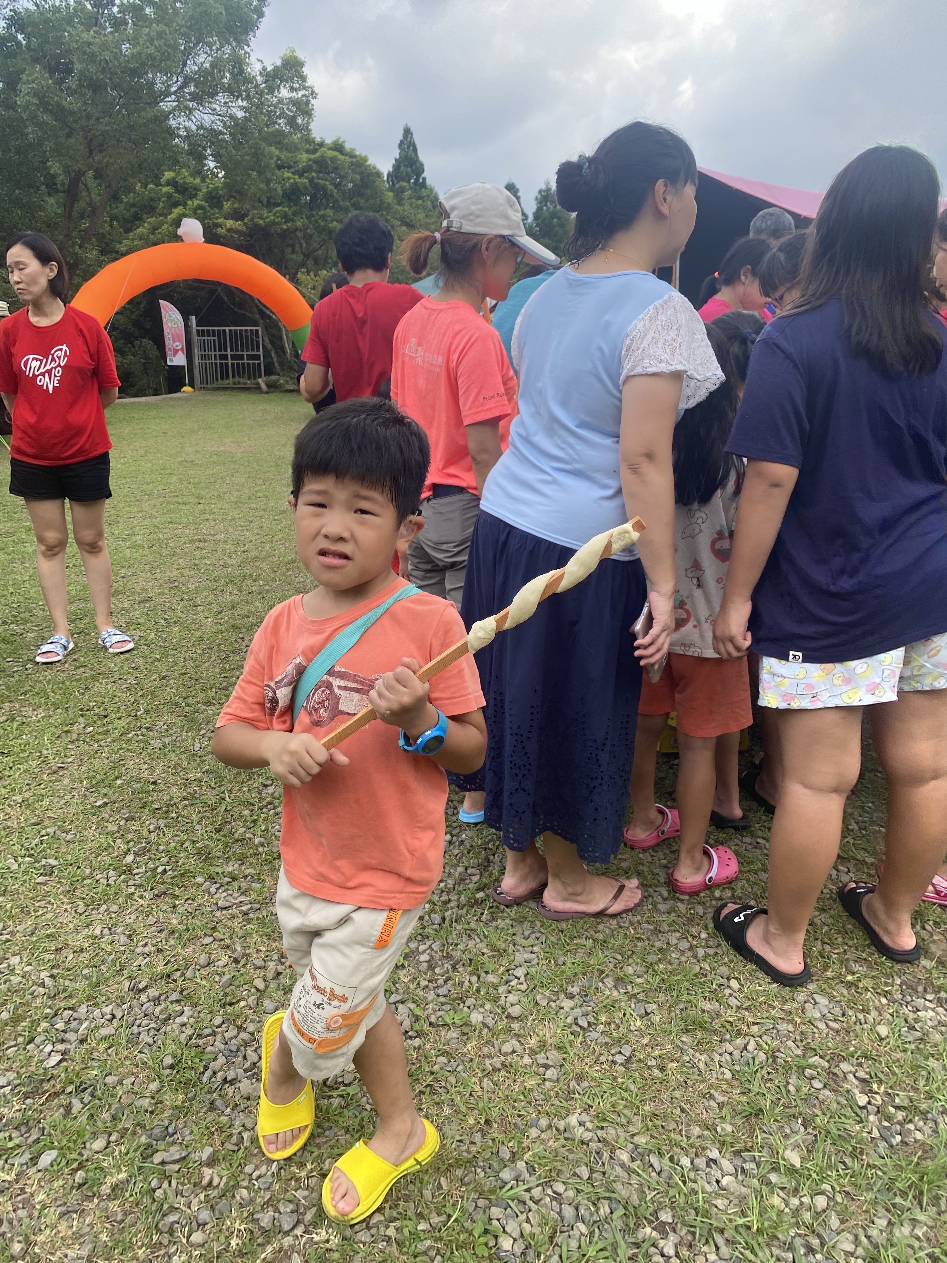 這次活動安排有四個,一開始的玩潑水遊戲,大小沐沐沒有興趣,所以就沒有參加。接下來有簡單的下午茶,喝仙草冰,結果只有沐爸沐媽喝。第二個活動是烤蛇餅,很早以前沐爸就玩過,這次看主辦者的準備食材的部份,唯一不同是用木材代替竹材,烤出來的蛇餅一樣好吃。