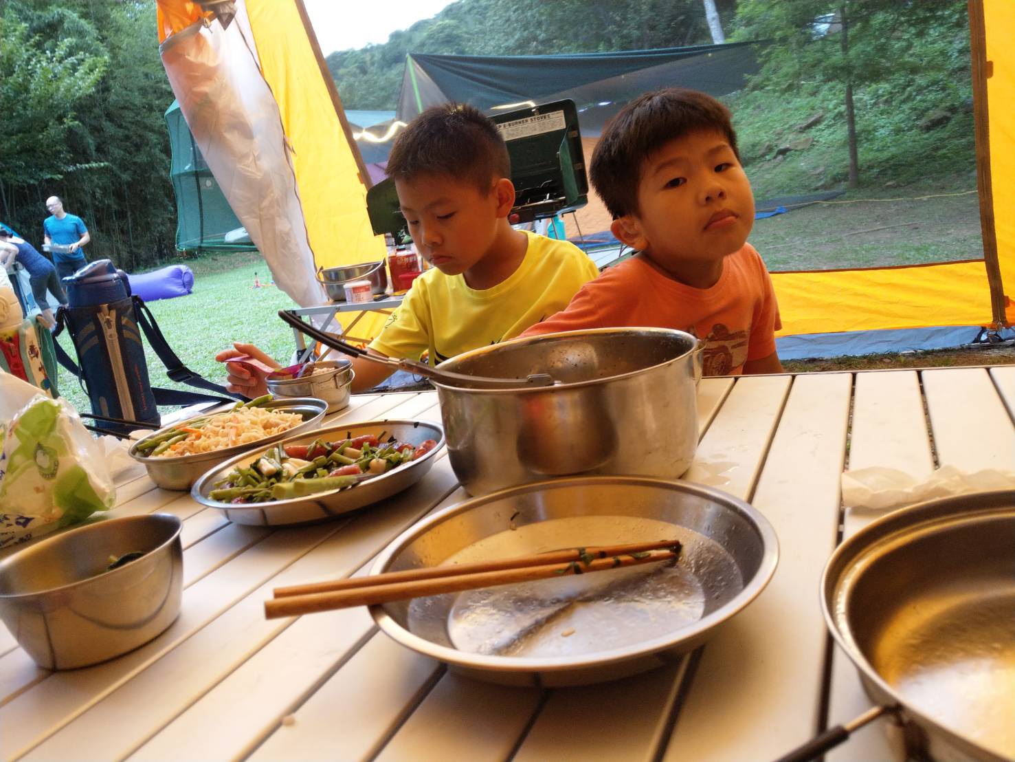 這次決定一早就來到營地,所以跟以往準備晚餐跟早餐不同,多準備了一餐中餐,在幾次活動下,我們家逐漸養成一個主食、一個湯、一個青菜、一個配菜等方式準備餐點,似乎份量上也足夠,準備起來也輕鬆。
