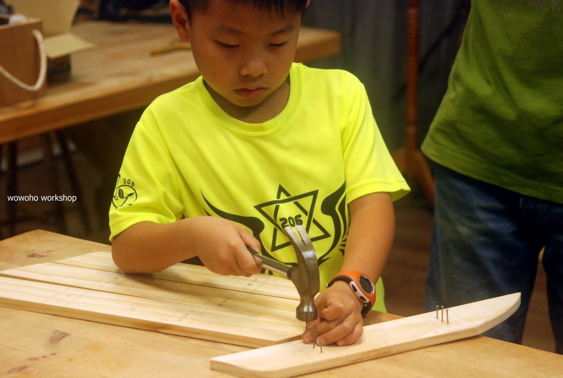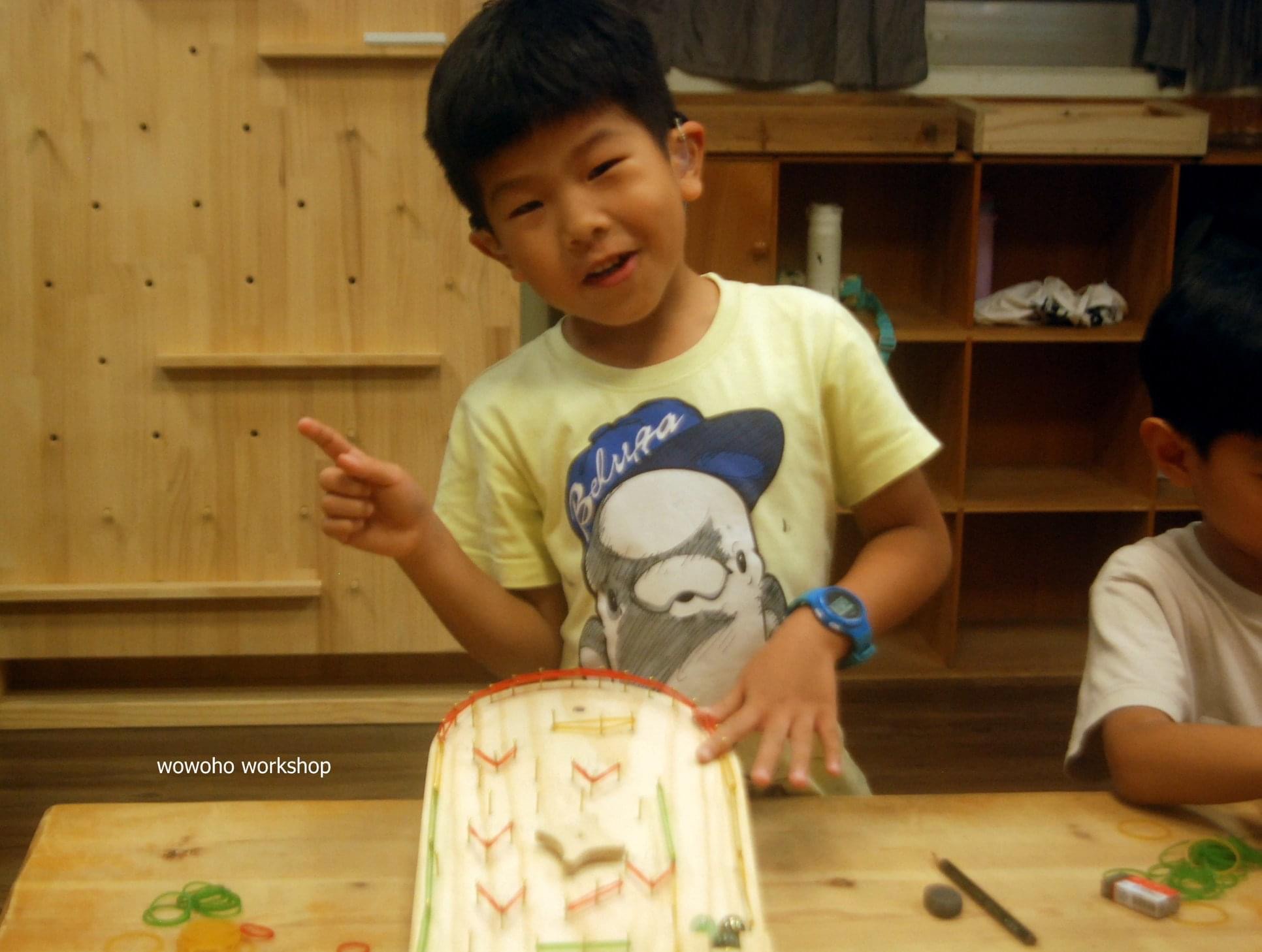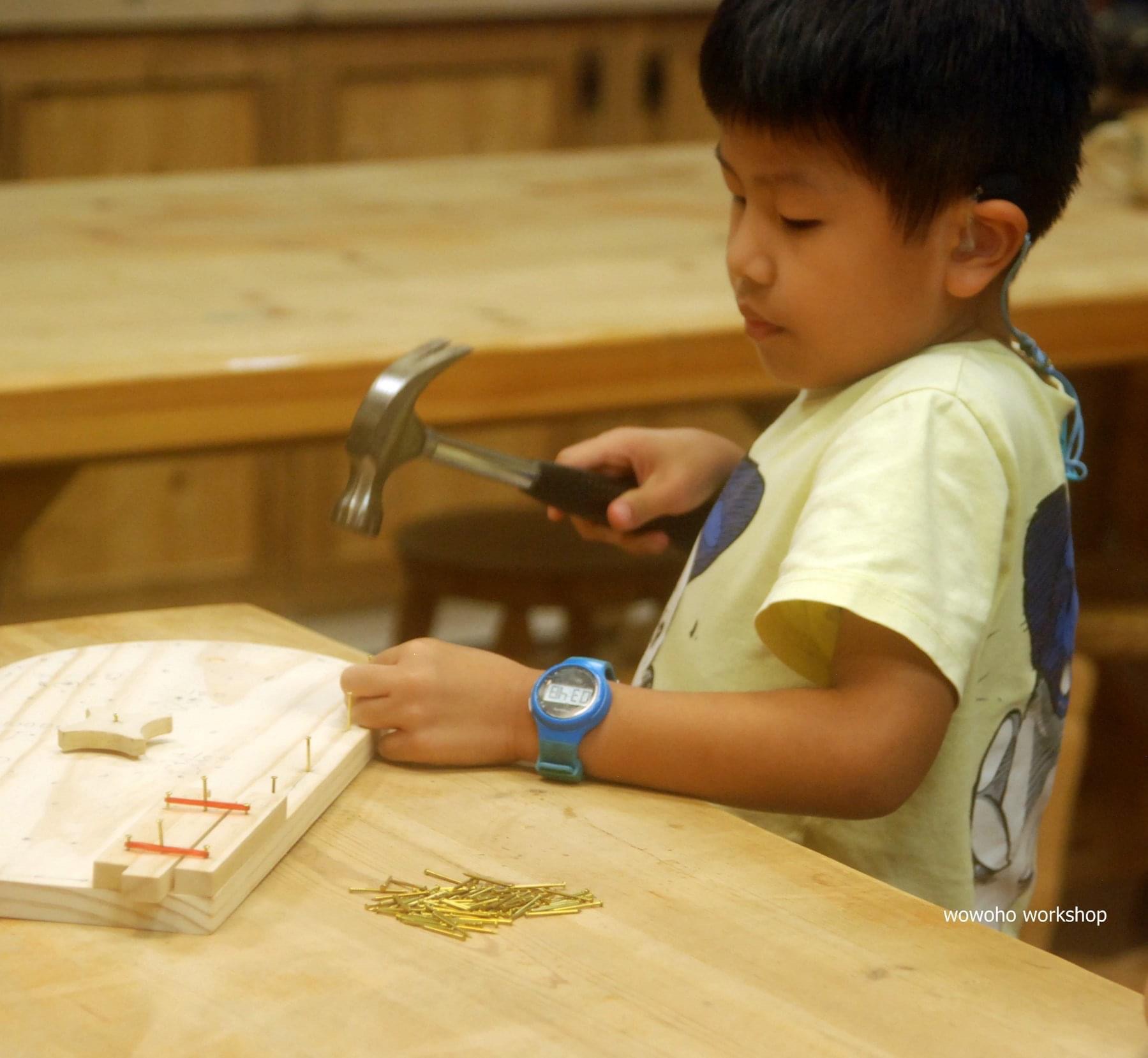 小沐沐製作彈珠台,根據木工老師在課後跟我們描述上課狀況,小沐沐在用鐵鎚敲打釘子仍有些不夠力,所以需要老師協助,這次要敲打的釘子很多,從一開始的偏移打不太到,後面就越來越準確了!