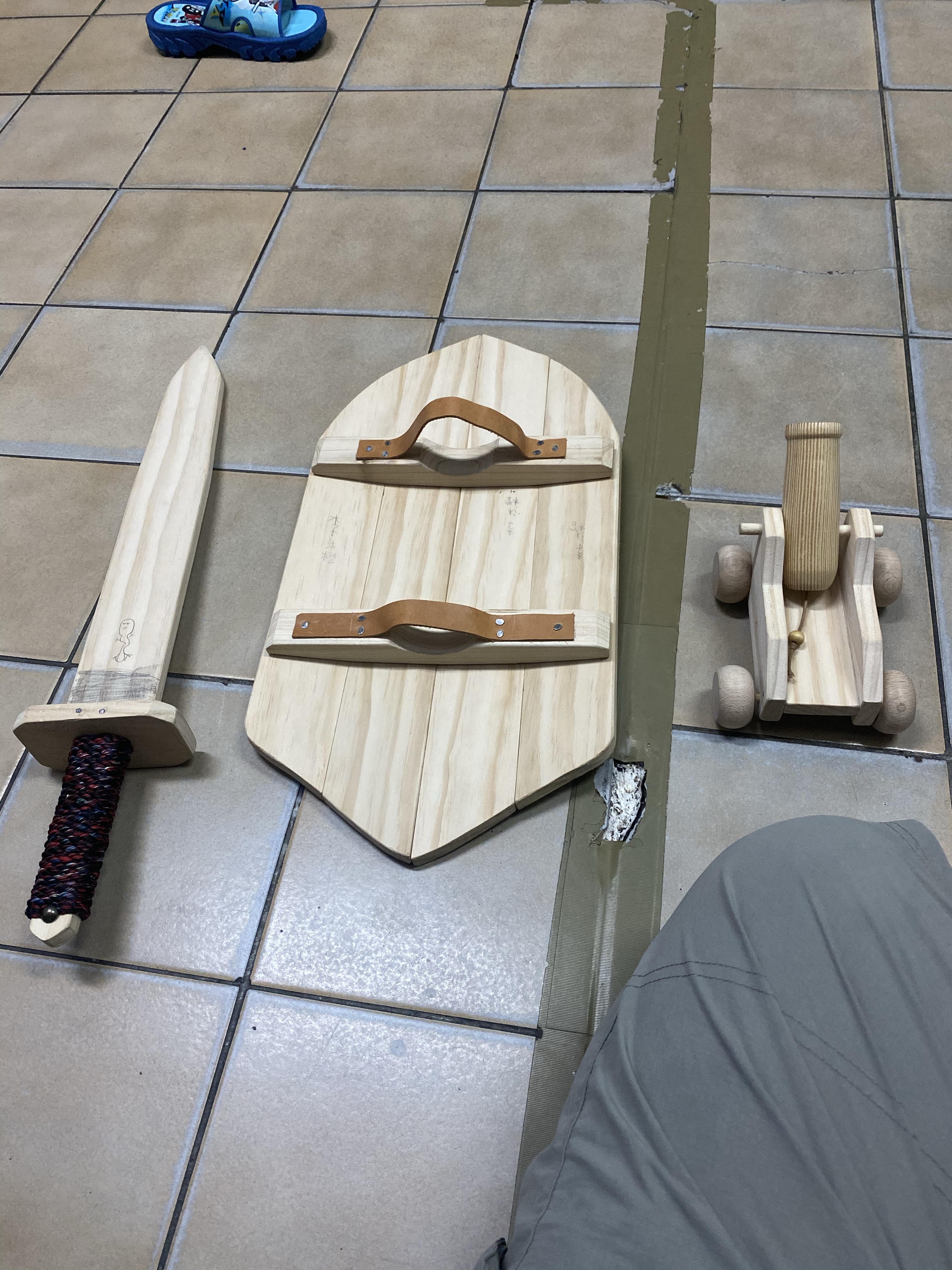 大沐沐參加的行程一共是三天的下午,分別做三樣東西,大沐沐只有第二天覺得很累,可能是因為前一天音樂課,還有今天製作盾需要比較多木工吧!第二天做完時,我看到劍盾,簡直就是古羅馬人的配備,真的很有意思。第三天,製作攻炮車,也很有趣,回到家兩兄弟輪流玩攻炮車,比遠比準的玩。