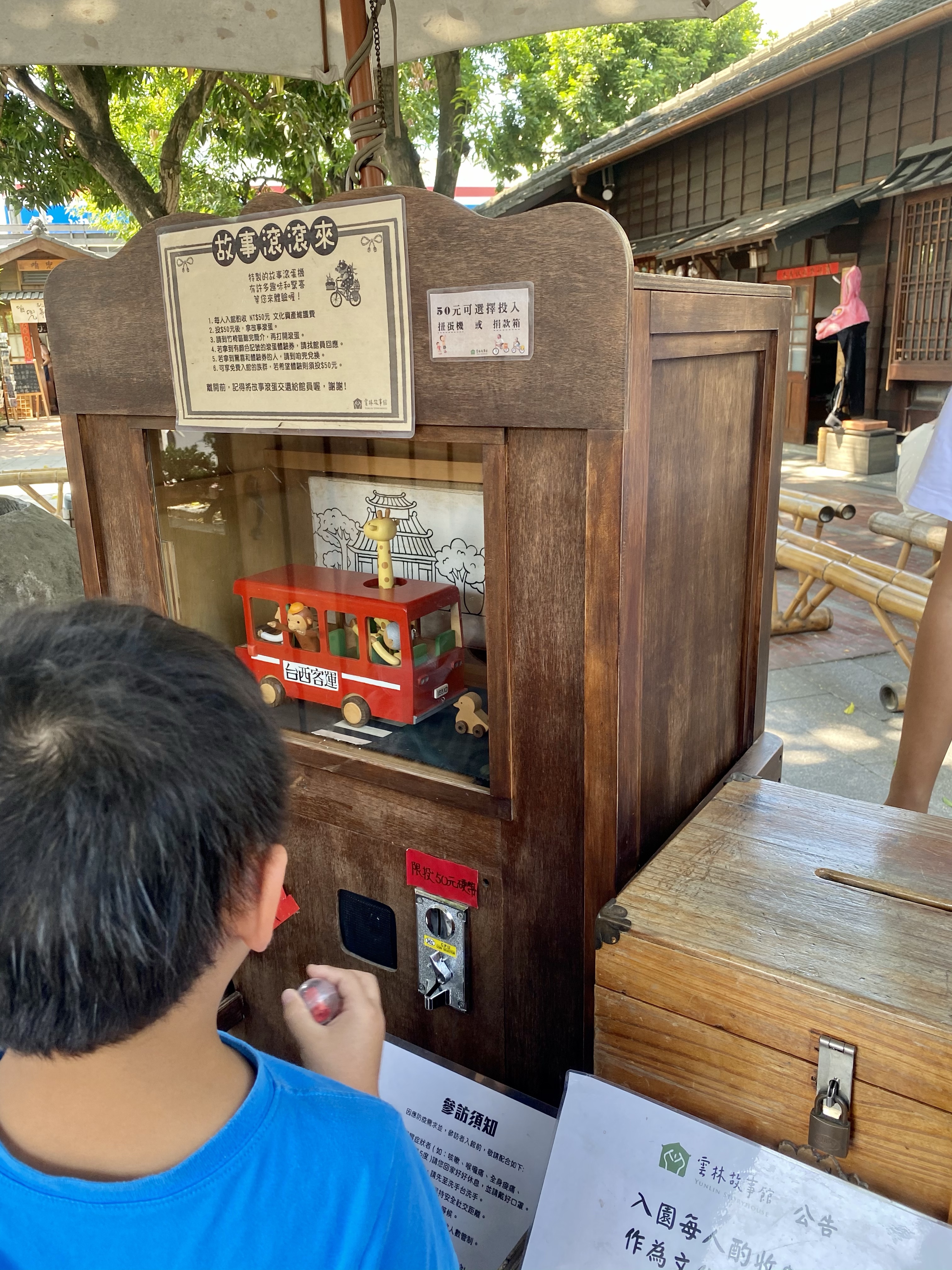 雲林故事館,也是一個很偶然地進去,因為距離吃飯還有一些時間,旁邊有一個古老的建築,也就進去看看,看這邊有什麼特殊的地方,進去需要50元,這50元可以轉扭蛋答問題,或者直接捐出去,然後12歲以下不用錢,所以就是兩個成人費用,兩個人都轉扭蛋,小沐沐運氣比較好,直接中獎,得到冰棒一隻,大沐沐的問題是"這邊有哪五種植物?"(原則上導覽員都會介紹雲林故事館內的植物,所以只要仔細聽都會答對)