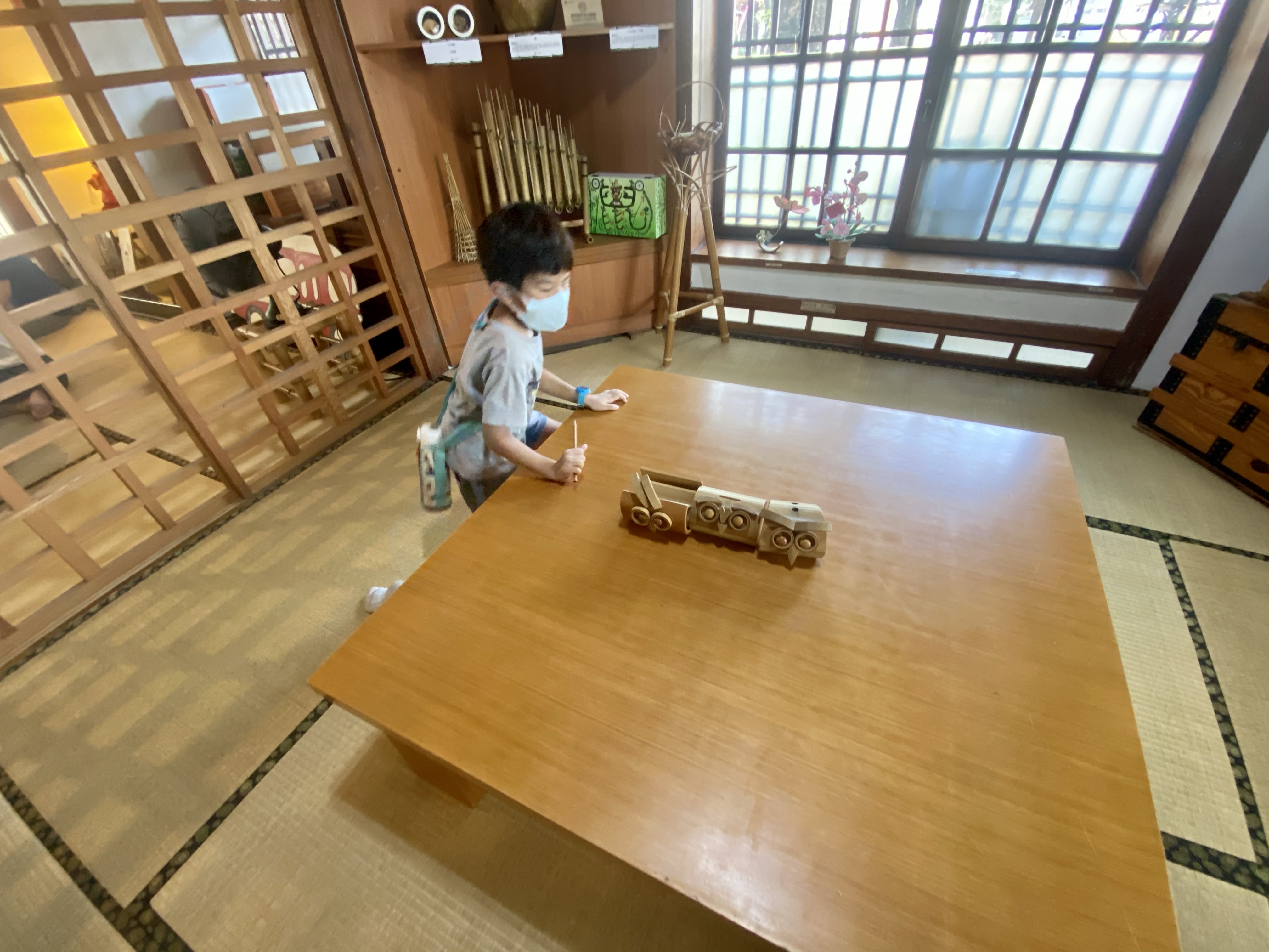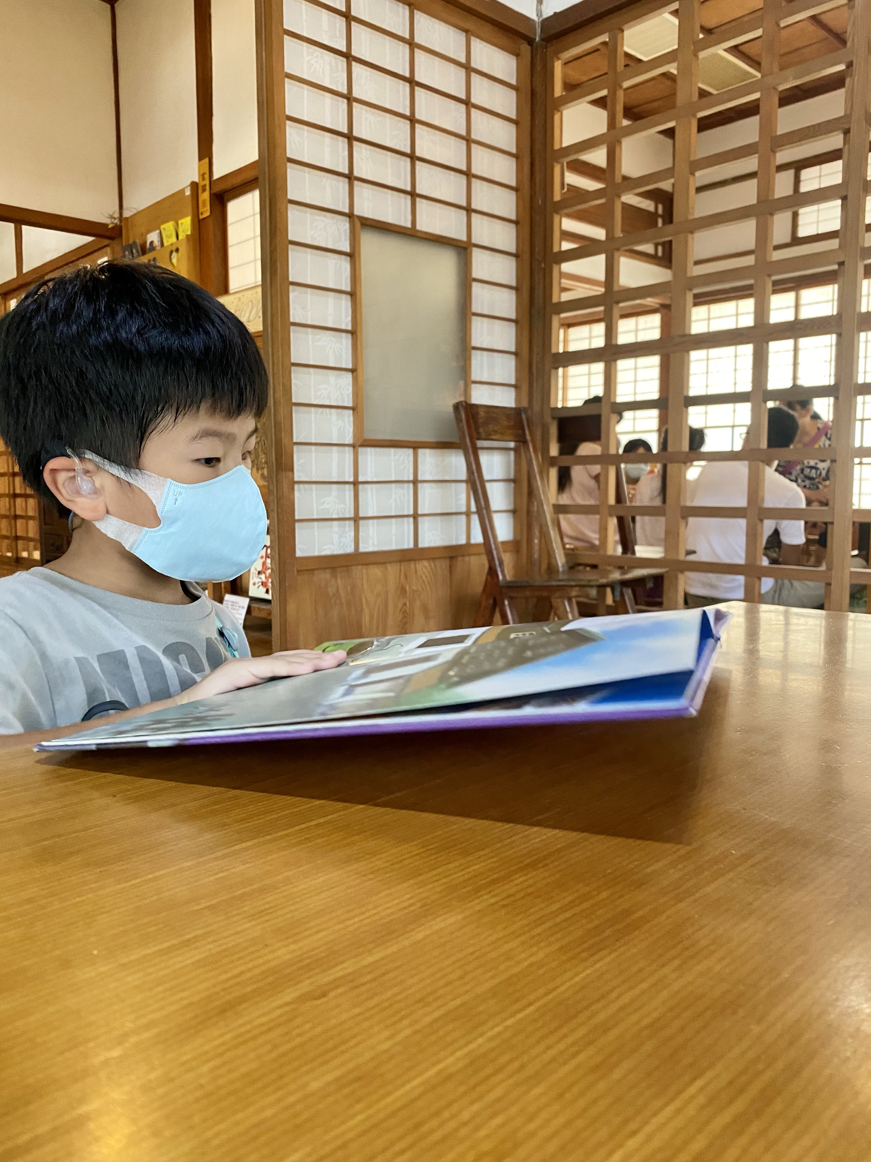 進去館內參觀,裡面都是榻榻米,好日式的感覺,剛好遇到演戲活動,大沐沐看了一陣子,小沐沐則不想在裡面,反而在另一個區域看到一些繪本,便坐下來看書,我們待了一會,也就出去了!