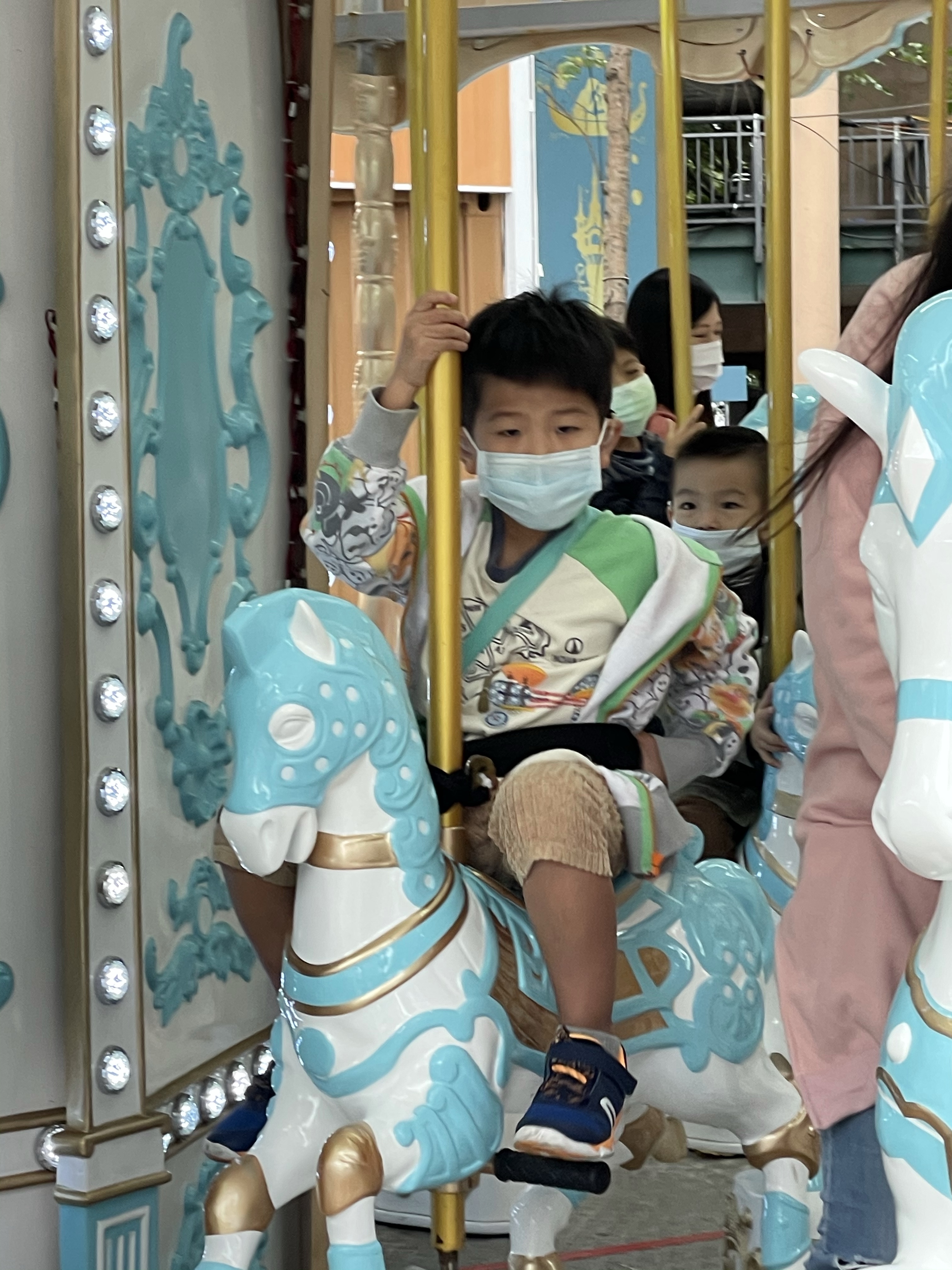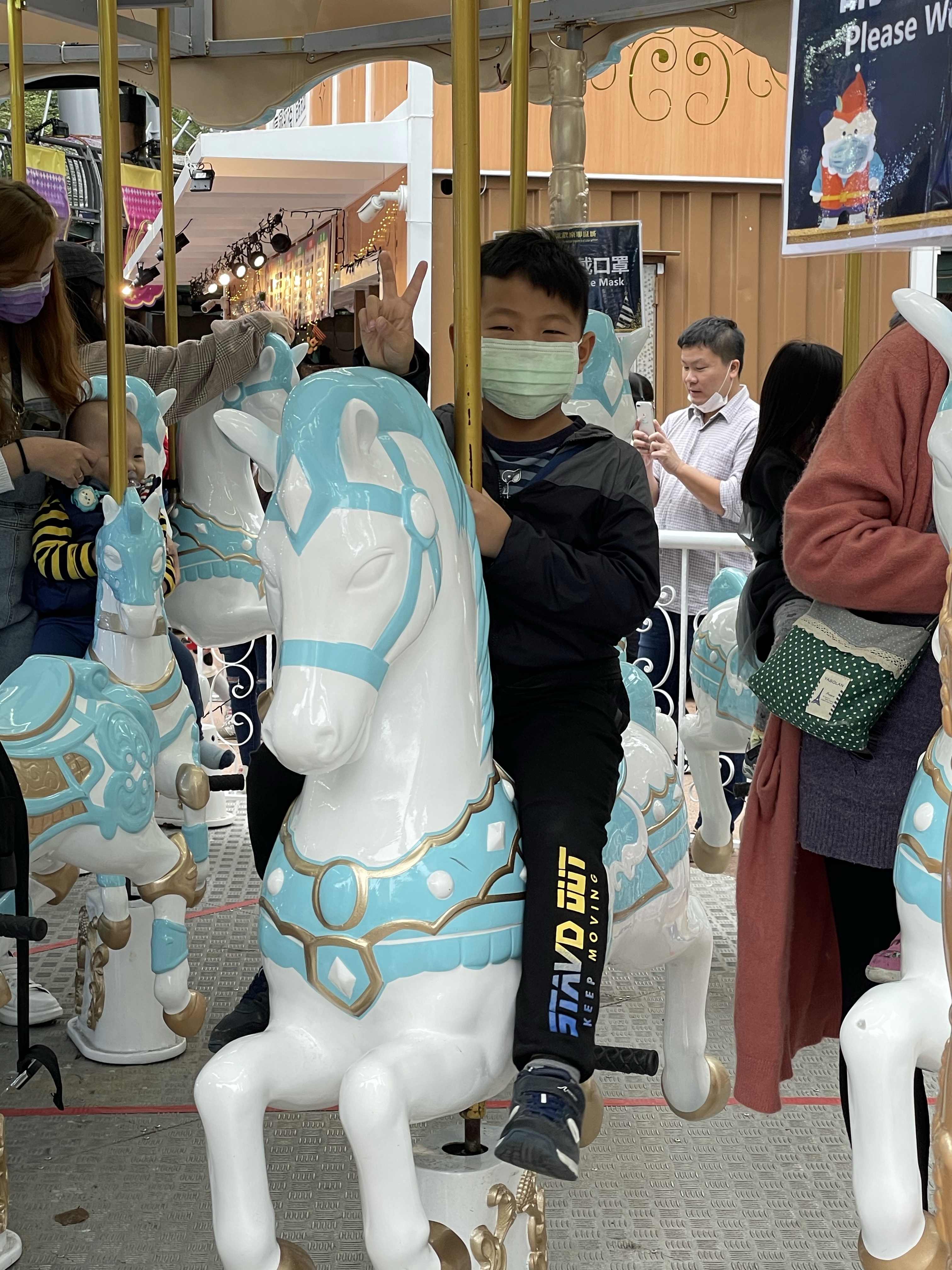 從板橋火車站一邊,再走到另一邊(靠近市政府),一樣有很多遊樂設施跟攤位,跟往年不同,遊樂設施分散了,也可以分散人流。大小沐沐就去排隊做一下旋轉木馬,也有規定陪同人數,所以自己可以座跟身高達標準都可以上去。