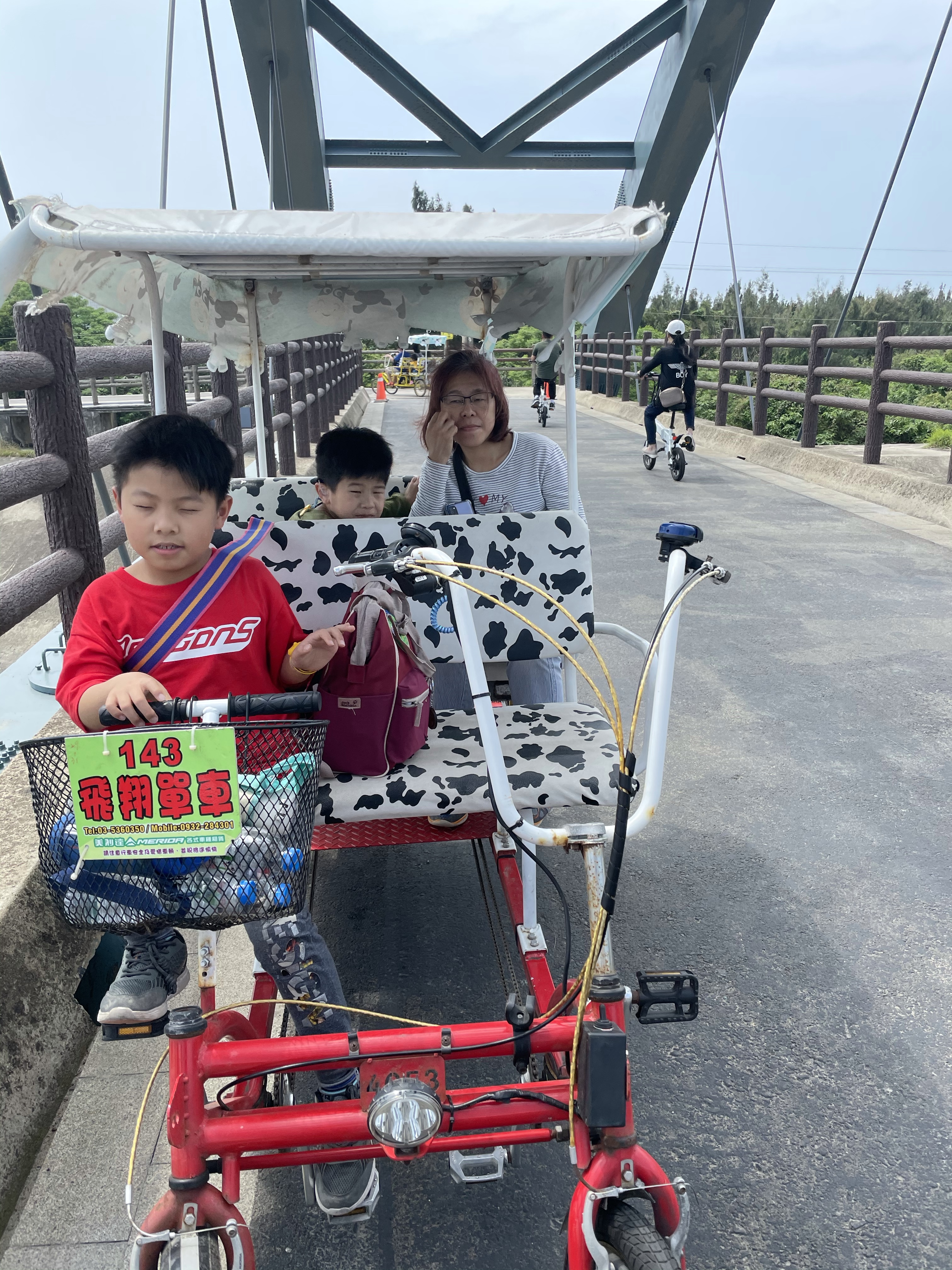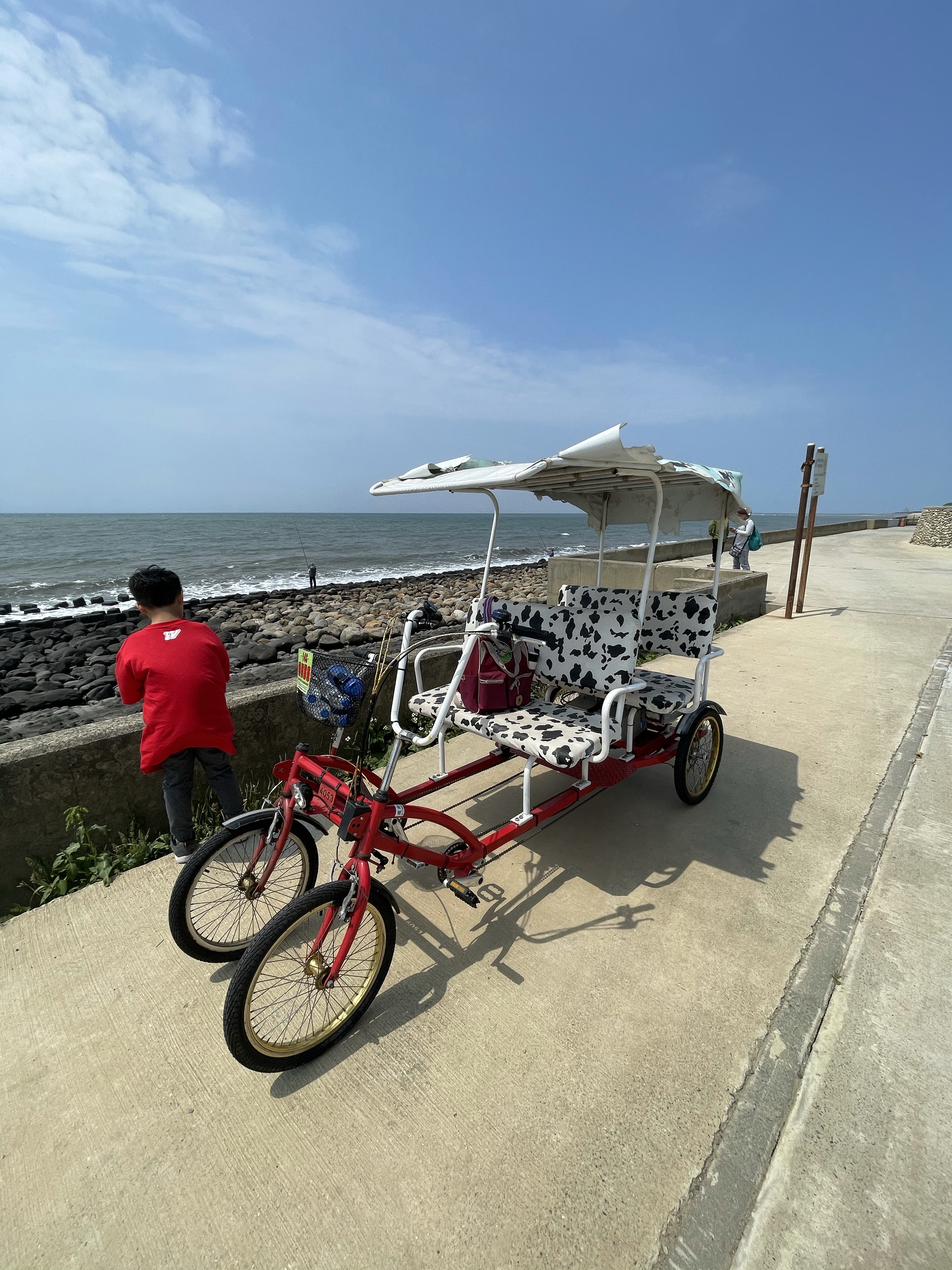 早上搭乘竹塹輕便車(小火車)之後,沐沐一家就往南寮漁港,主要是距離不遠,也剛好中午可以去這邊吃午餐,沐沐一家的找了一家牛排店吃午餐,完全不是去漁港應該吃海產的方式,由於大小沐沐沒有來過,所以我們就找了一家腳踏車店,租了一台四人座的電動踏車,兩個小時600元,開始這次海岸線之旅,由於我們走走停停,最遠只有到香山溼地。