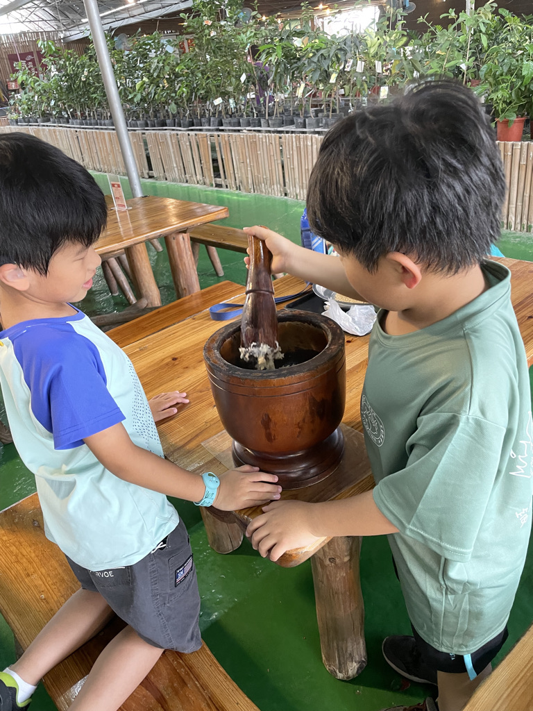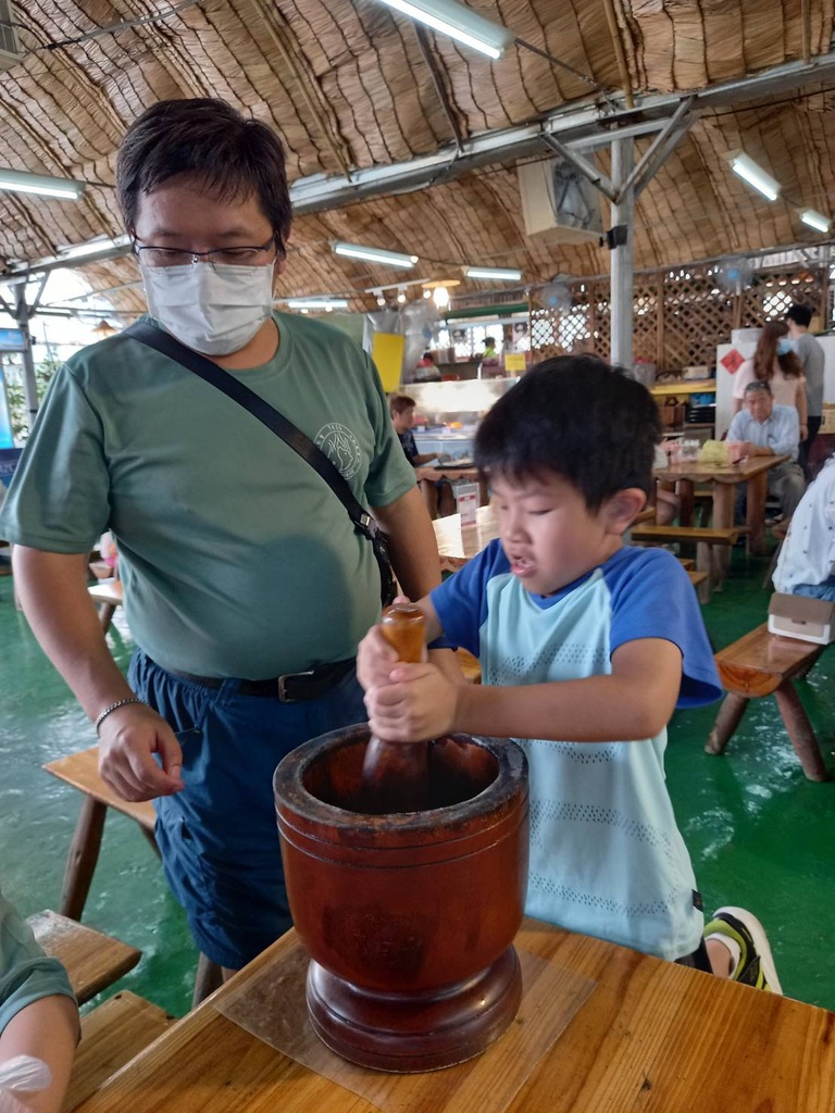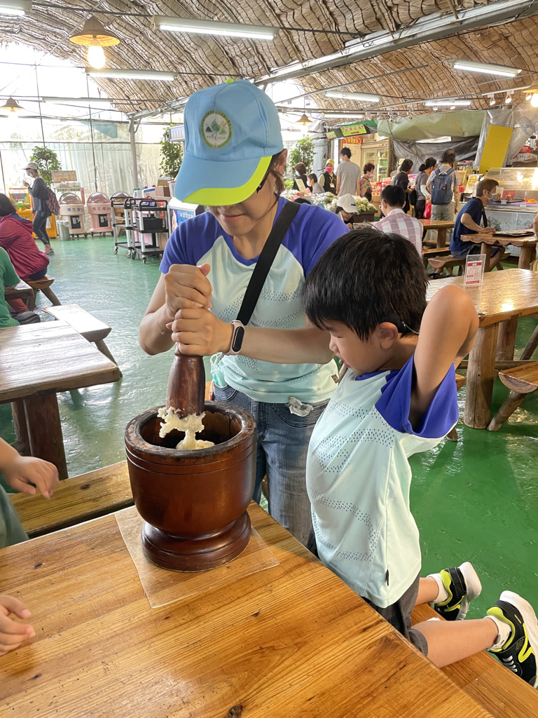 這邊還有很多東西有吃有玩,沐沐一家則是做手工麻糬,一家人在一起搗麻糬,真的很好玩,真的很有意思,弄完之後,沐沐一家也吃的津津有味。