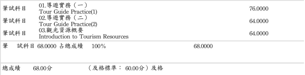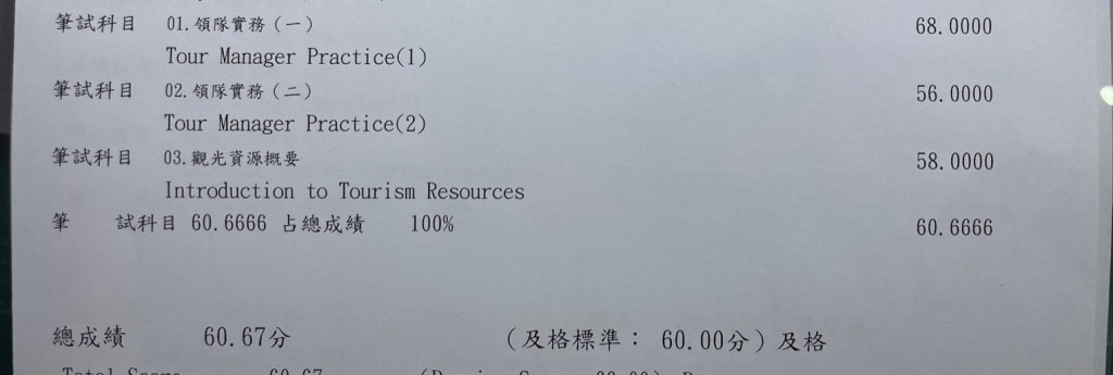 2020年考華語導遊跟華語領隊,剛好遇到COVID19,考試時間延後了,就在2020年幾乎沒有準備之下去考試,先看一下外面補習班發的考前猜題,臨時抱一下佛腳,看能不能矇到。兩天考完,我也沒有對答案,考完的想法是,華語領隊還算會寫,因為幾個題目都算有把握,而華語導遊就覺得寫不順,主要是因為問很多台灣史中關於日據時代的人物,因為都沒有讀過,就只能用猜的。最後放榜,華語領隊在低空飛過,所以順利取得,而華語導遊好像差了8分,所以沒有過關。