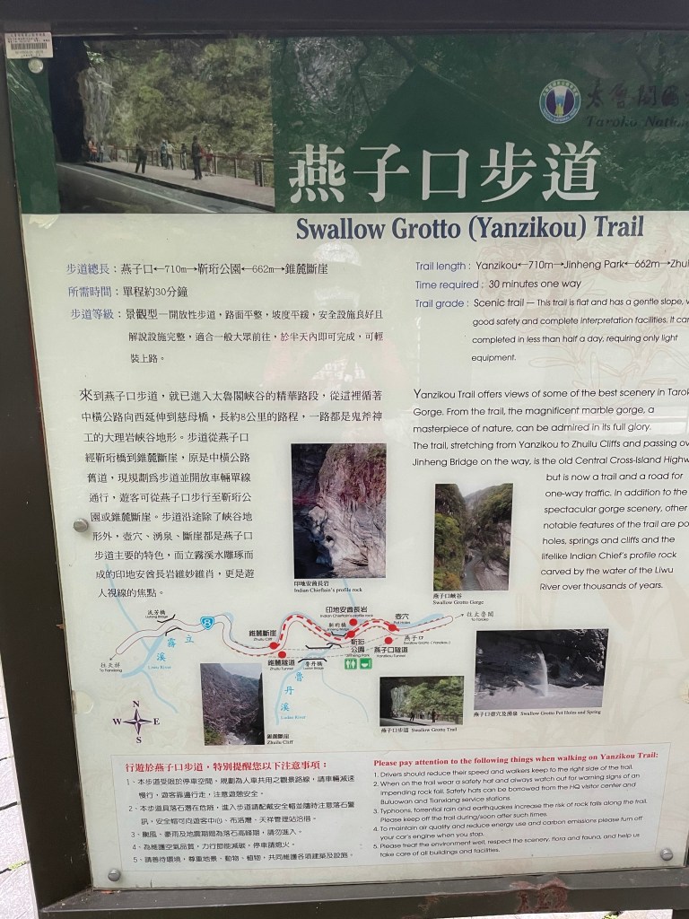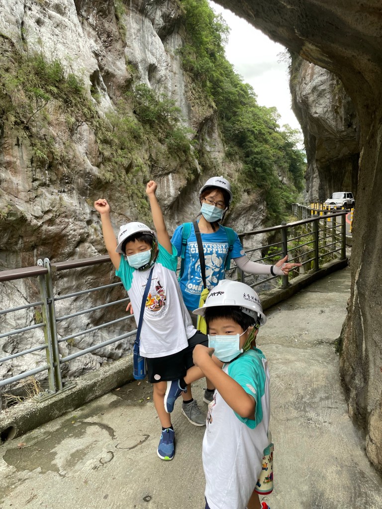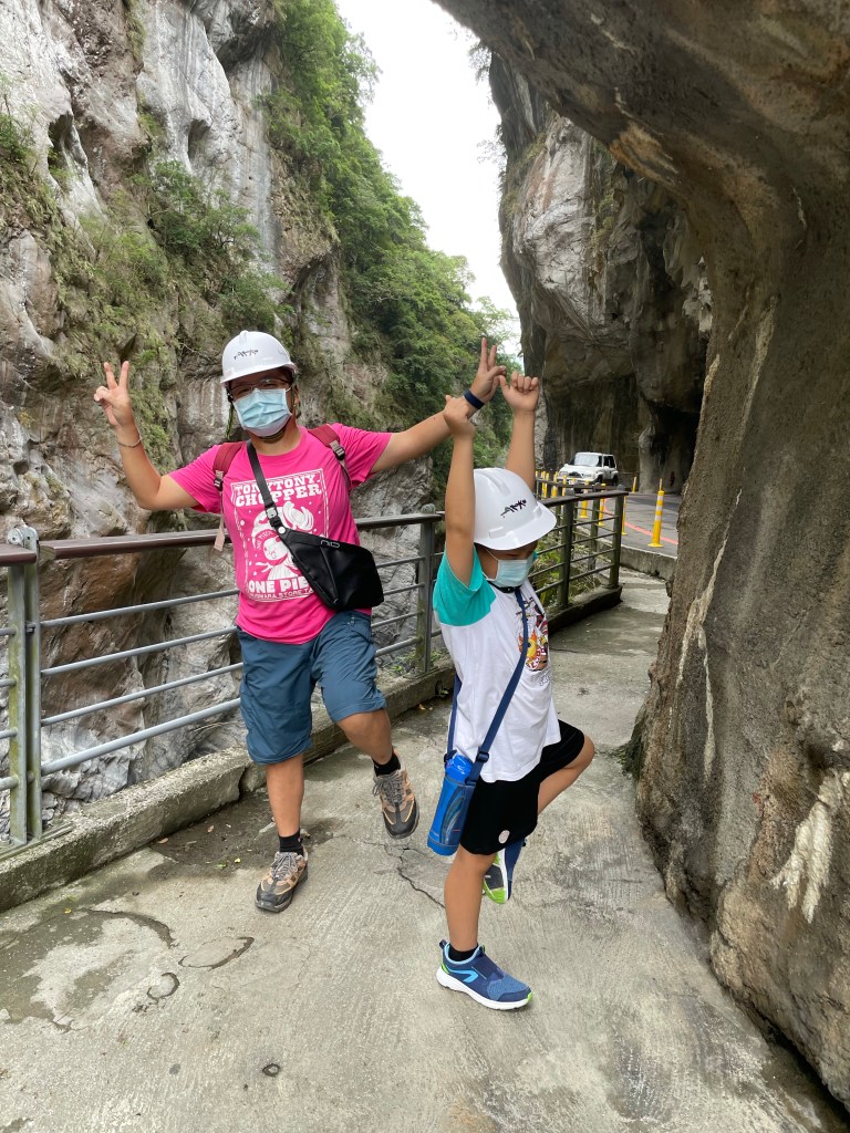 太魯閣國家公園著名的就是燕子口,所以沐沐一家還是來這邊朝聖一下,因為畢竟這邊落石多,還是去借安全帽,我們家就小小的走一段,這邊原則上在上山的方向進入,下山可能要在布洛灣入口迴轉比較安全,其實這邊就是以往的舊道,而這舊道就成為以往的觀光景點。在步道內大部分人都會到後段去停車,那邊相關安全,而且有廁所跟補給站(還沒有廠商進駐),沐沐一家就從這邊往回走,看看這一個美麗的風景,這邊主要是看風景,步道其實不太長,我們也幾乎走了一半了!