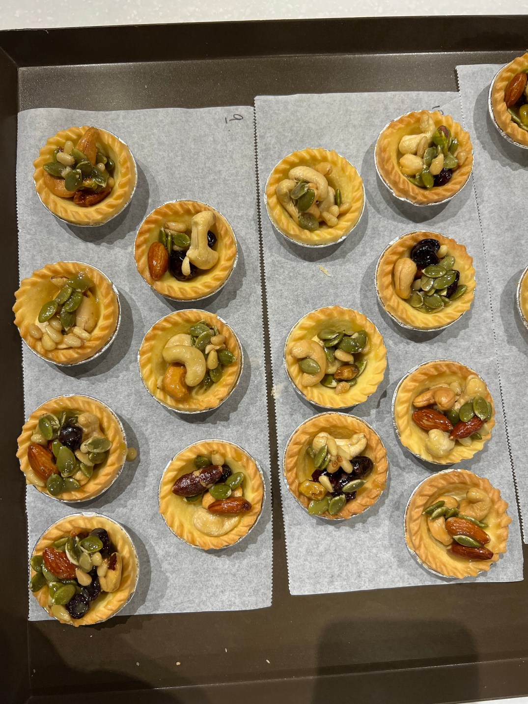 在將堅果放入烘培過的餅皮,(餅皮是老師提前烘培好的,放置完成後,就可以進入烤箱烘培。