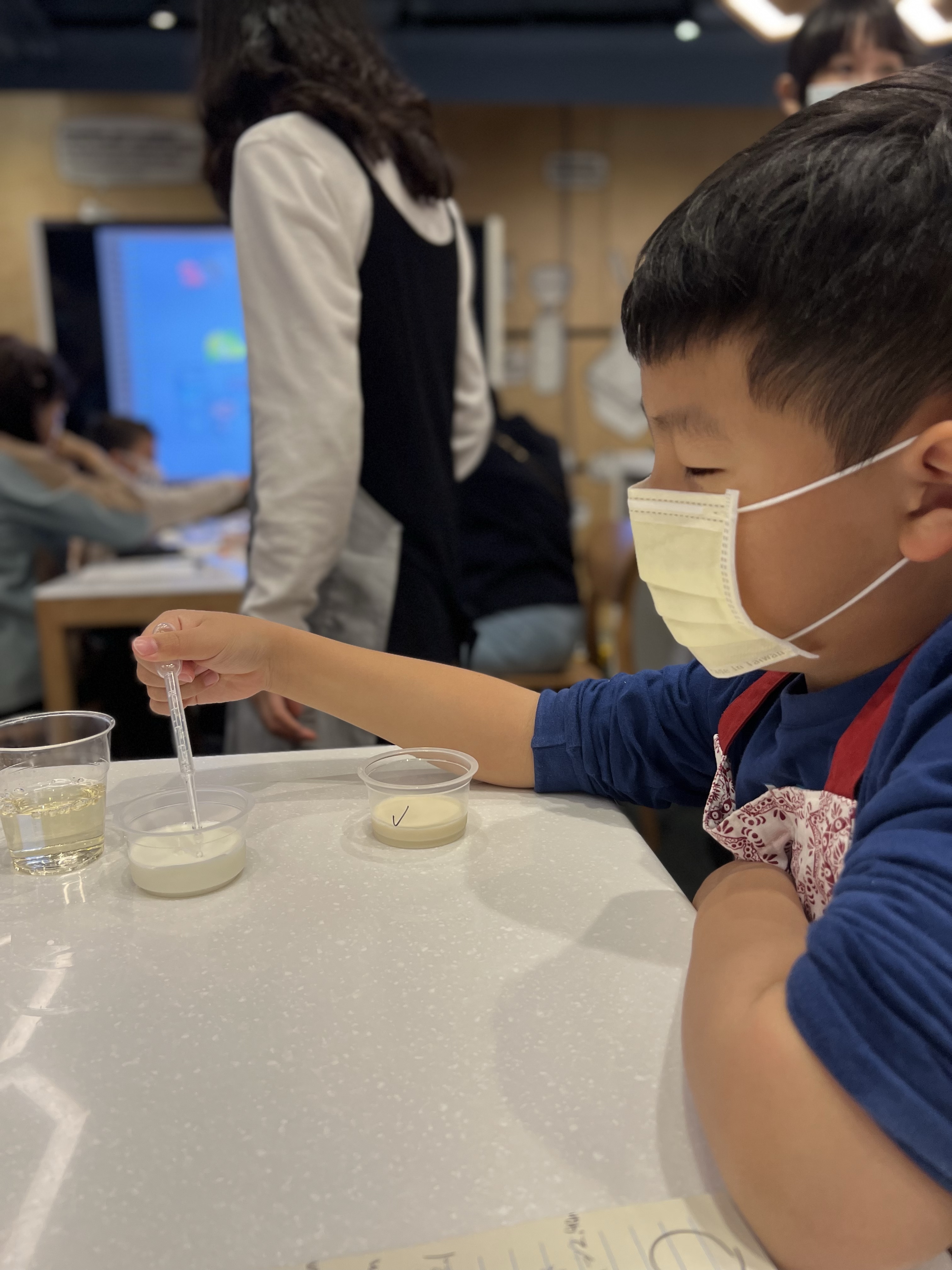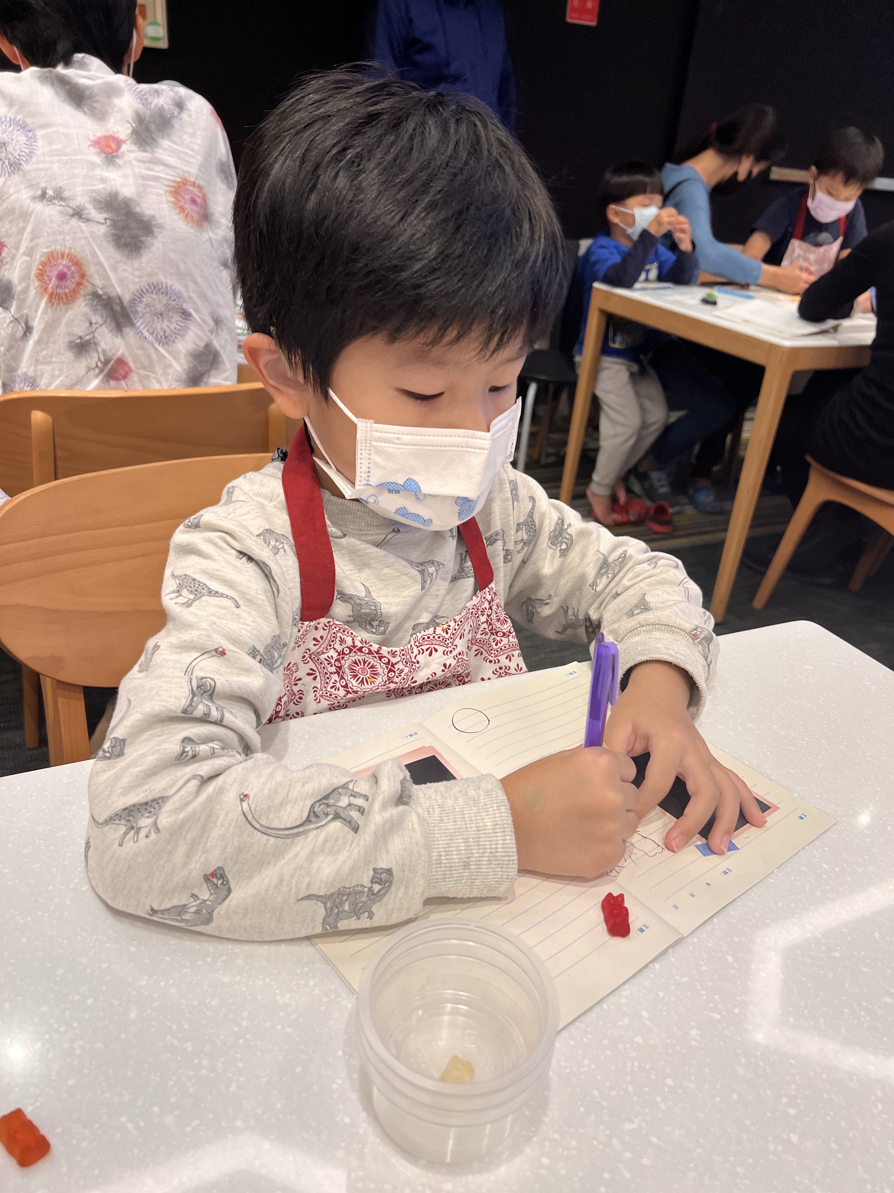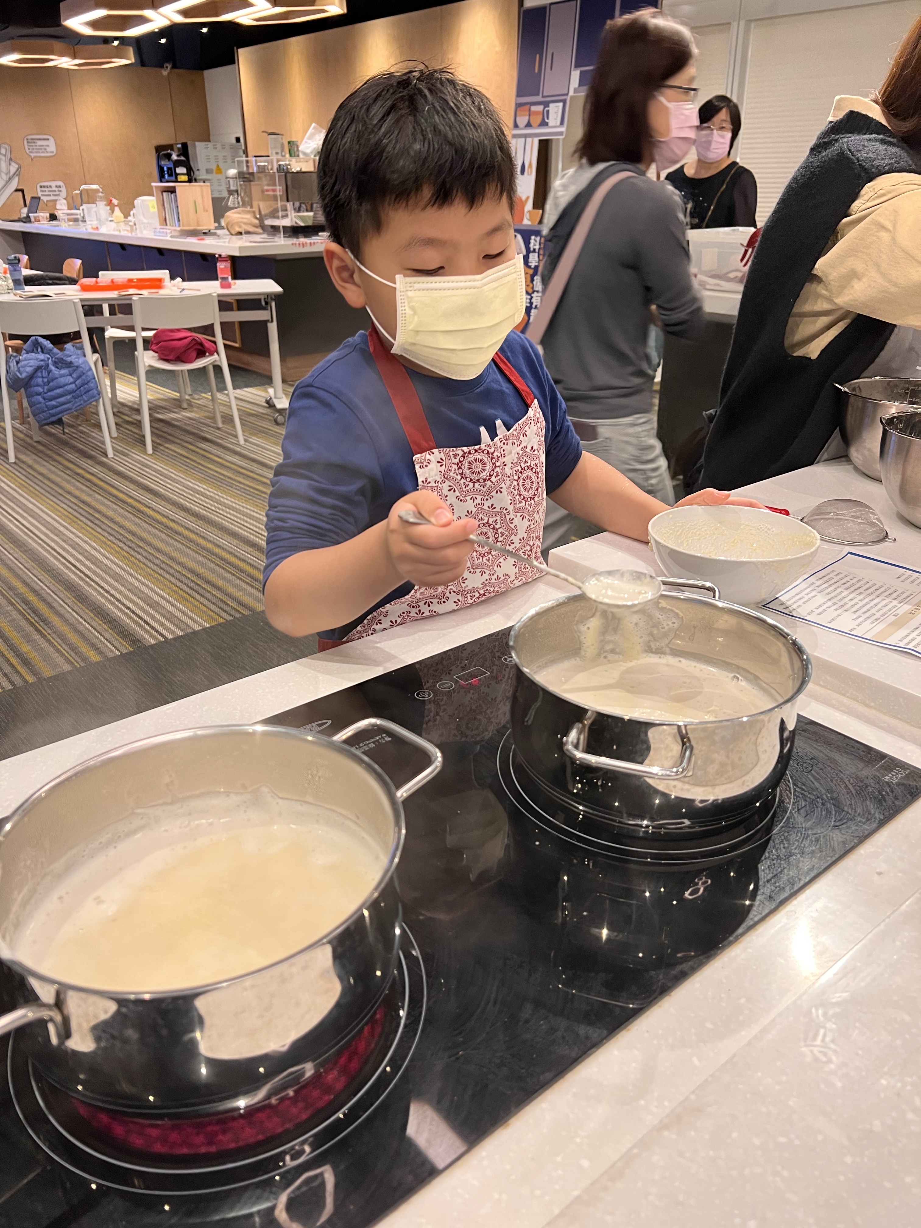 12月份沐沐一家有搶到一堂課,這次是做豆花,活動進行的方式是先進行實驗的設置,然後在去做豆花,在等待豆花完成凝固時,在回來實驗的部分。一開始開始進行實驗的紀錄,然後將小熊軟糖浸泡在清水、糖水及鹽水中,因為浸泡需要一些時間,物體才會有變化,於是大家就轉戰至做豆花的廚房。