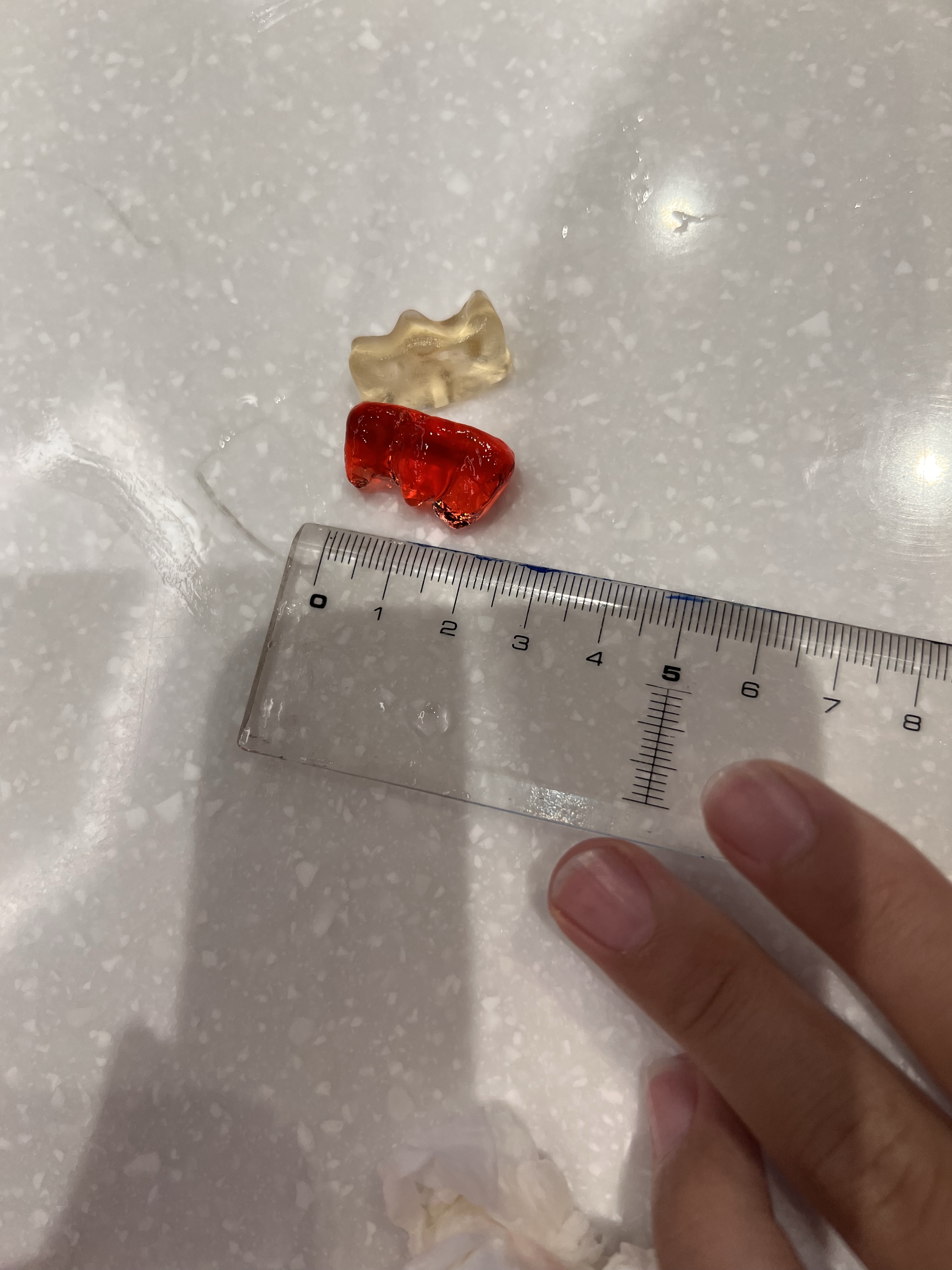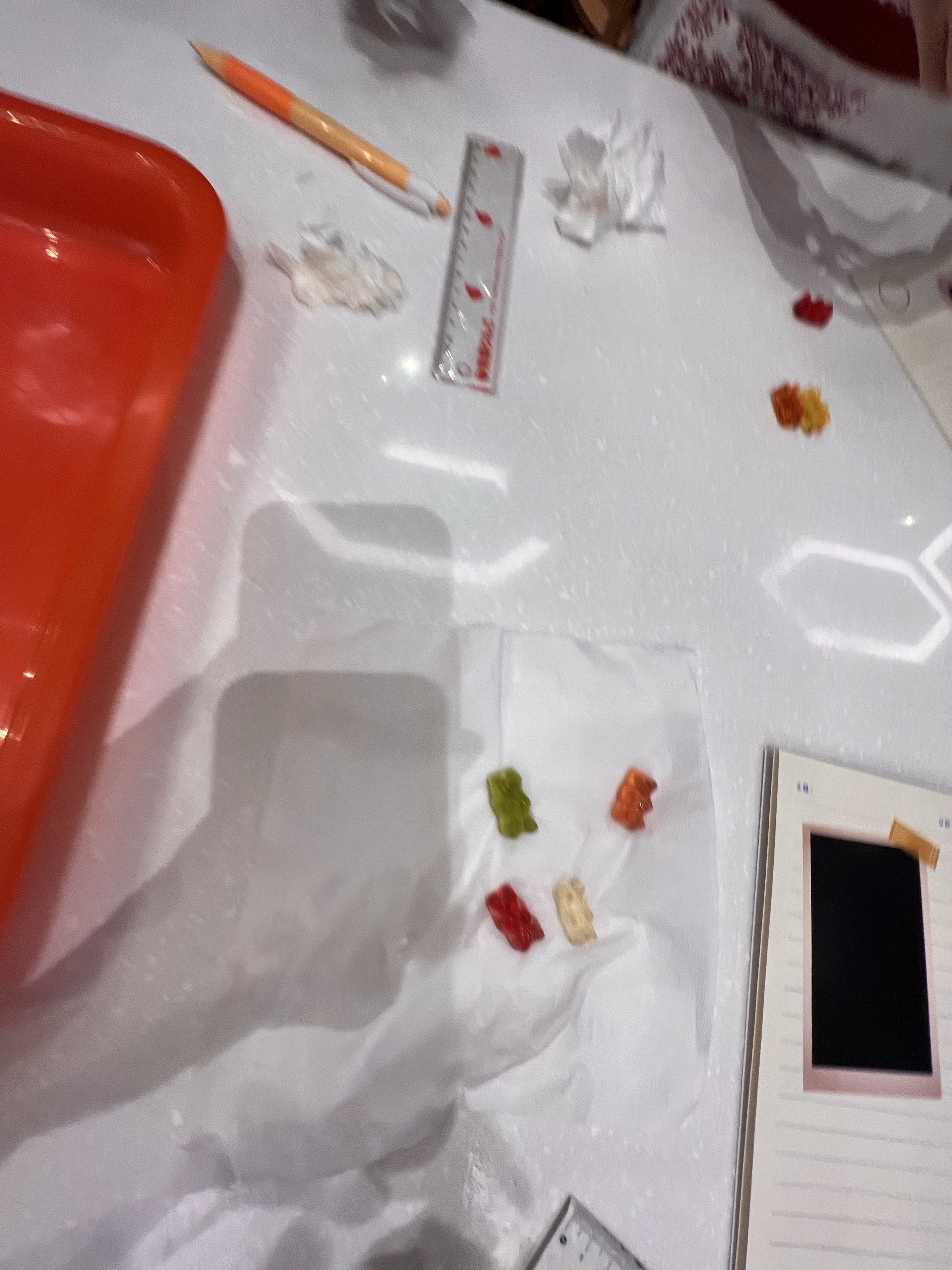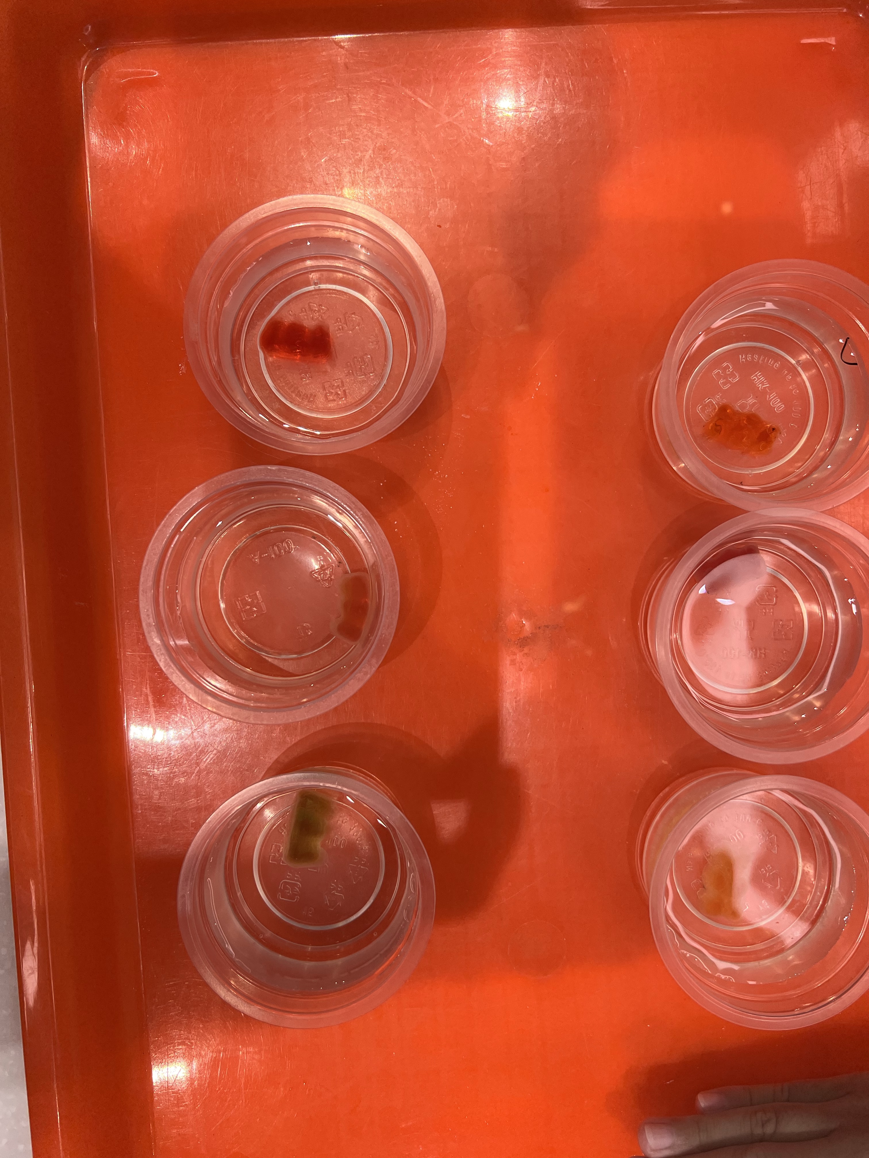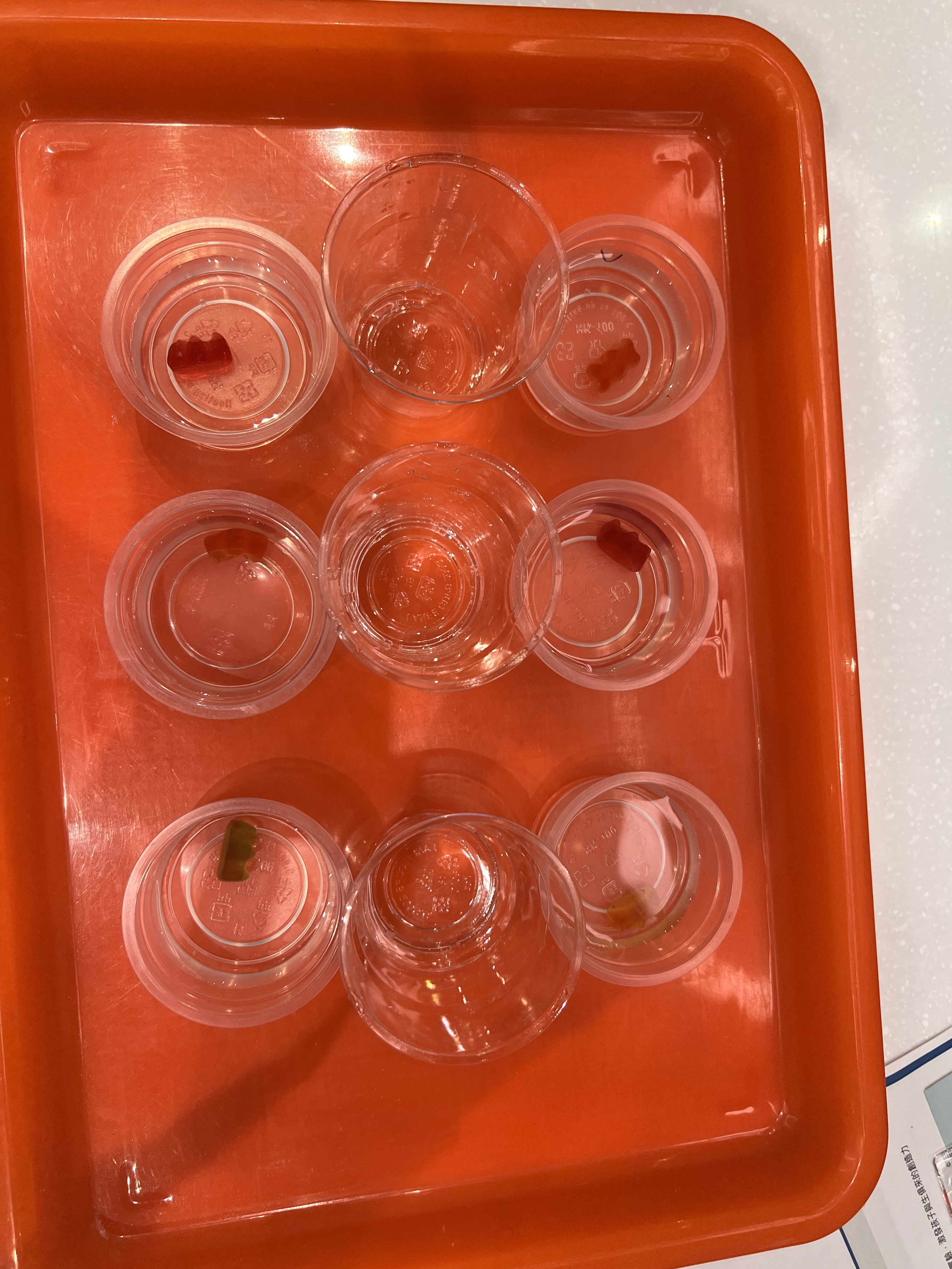 在等待豆花時,回來看剛剛放置的實驗,看一下小熊軟糖的變化,在不同的水下,導致小熊軟糖變大變小呢!然後也說明小熊軟糖跟布丁是一樣的材料「吉利丁」,也透過熱水沖泡時,小熊軟糖不見了,也就是說小熊軟糖、布丁都不能用熱水沖泡,也就沒有熱的布丁。