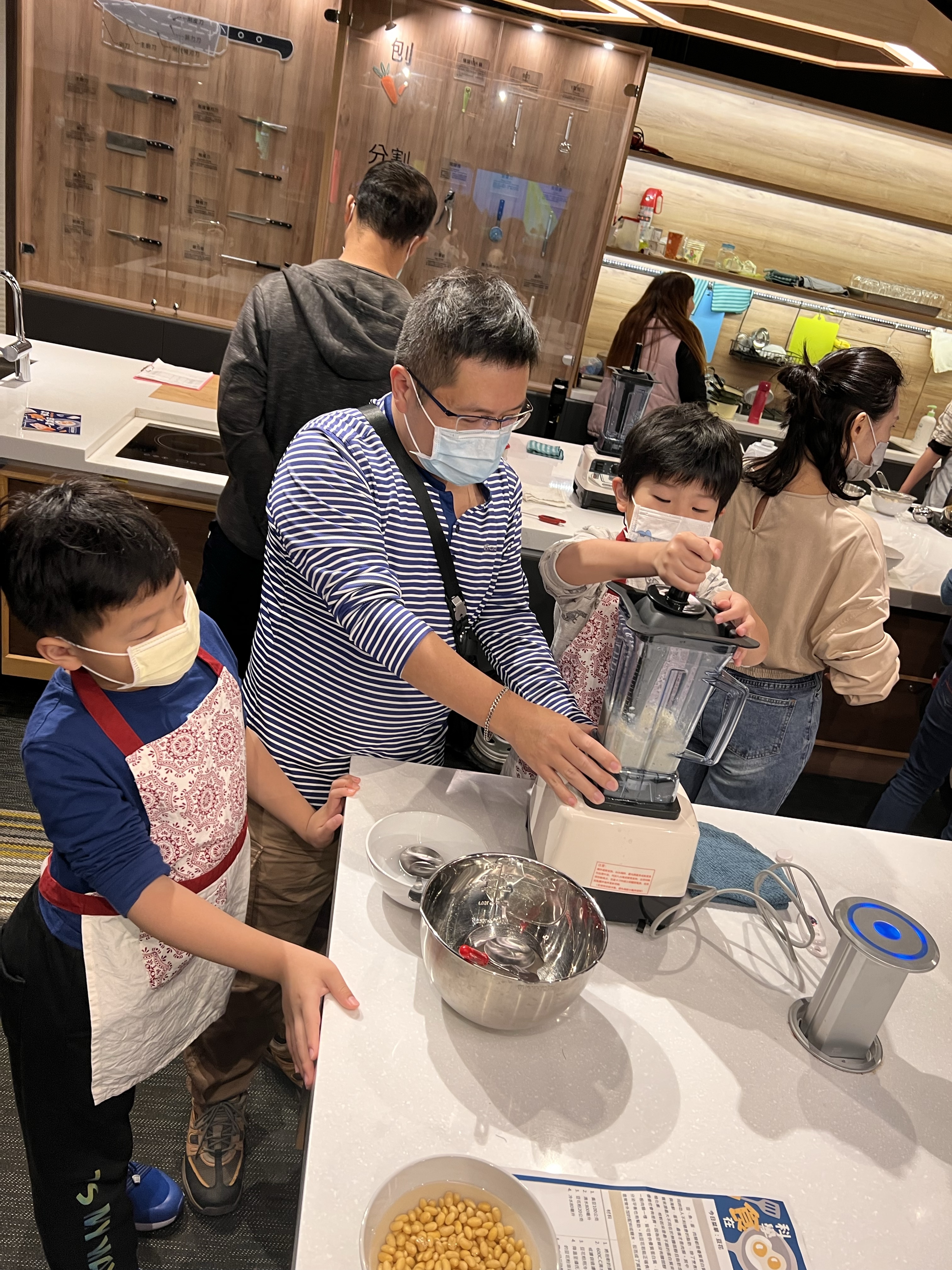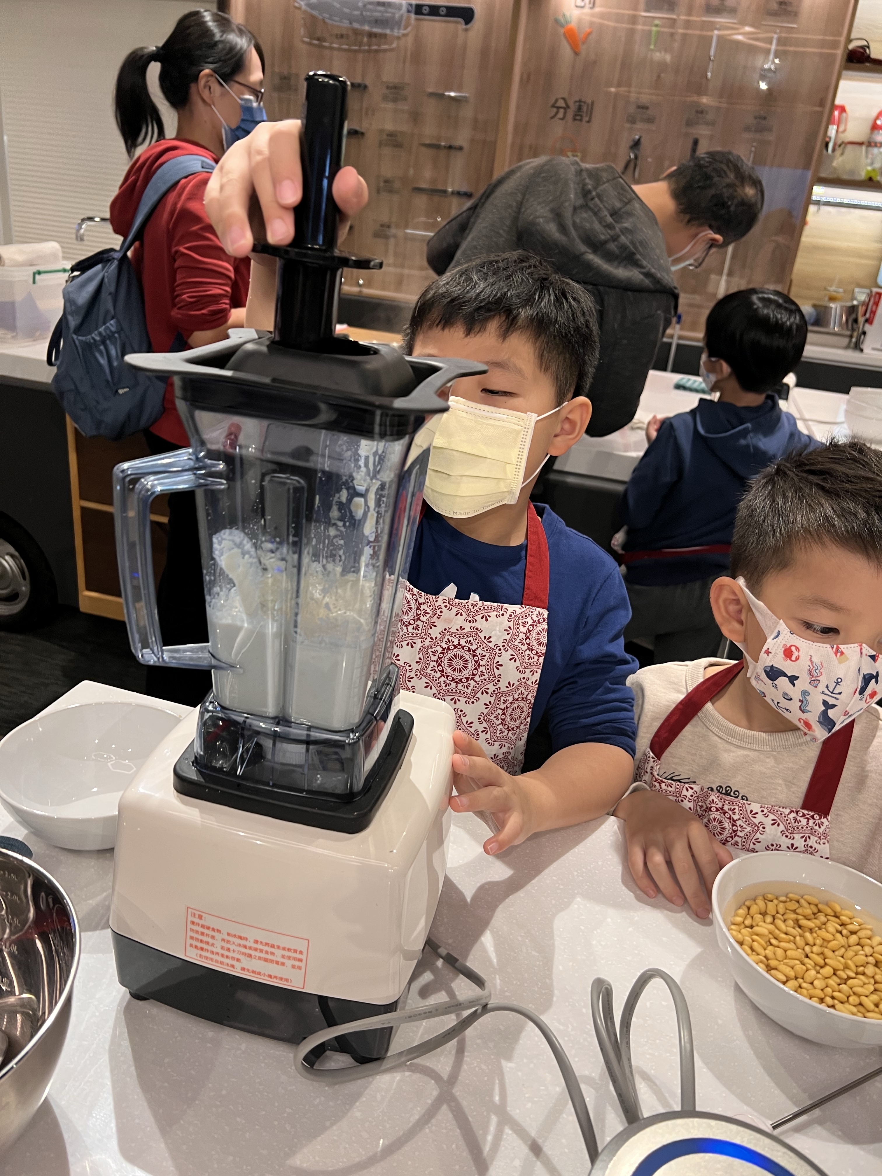 一開始先聽老師製作,老師解說完畢後,就輪到各家庭操作啦,學習單上都有一些介紹,另外還有小幫手可以詢問,所以不太容易出錯,豆花的原料是黃豆,這邊都幫我們將黃豆浸泡6個小時以上,然後透過攪拌機將黃豆打碎成泥,然後倒到鍋子裡面煮沸,煮沸期間,將上面泡泡(雜質)撈起,然後離火過濾,將黃豆渣的濾出,濾出來就是我們熟知的豆漿,然後再進行加熱至75-80度。這時候準備豆花粉,攪拌均勻,等豆漿溫度達到,就進行沖漿,這時候豆花就完成,然後冷卻成型。