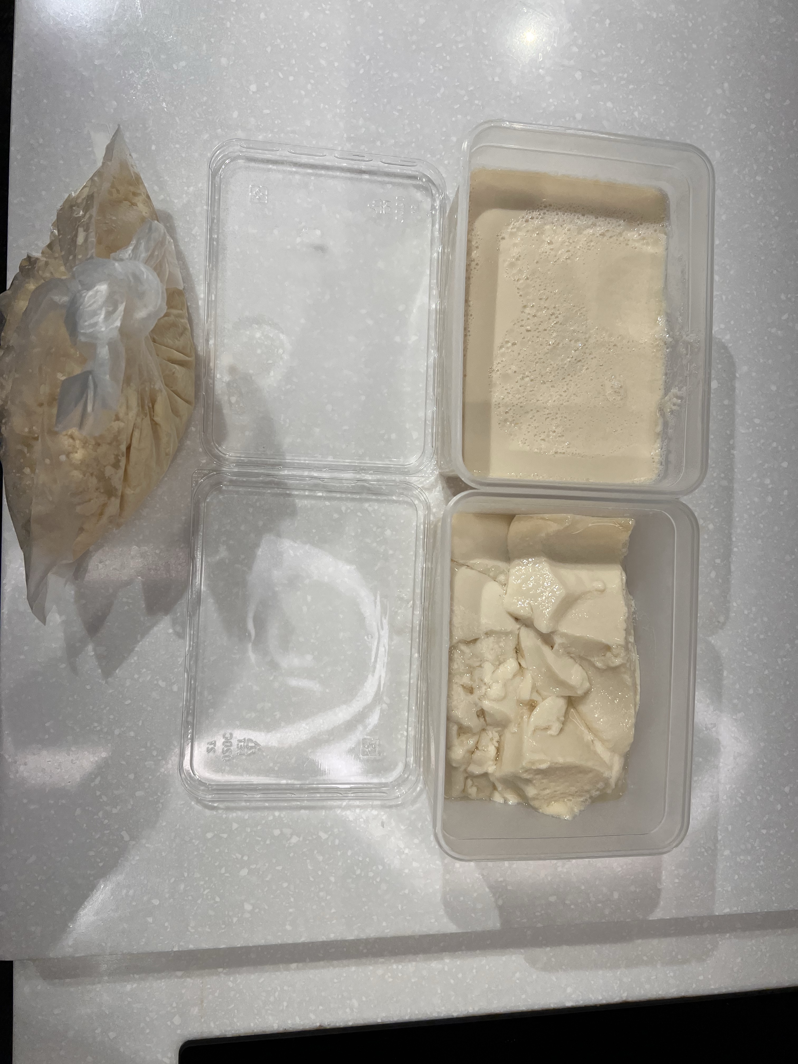 這時候就是拍照留念啦,然後現在不太方便吃,就將在碗裡面的弄碎,裝到盒子裡面,不過我們太晚回去冰起來,豆花出水就蠻嚴重的。