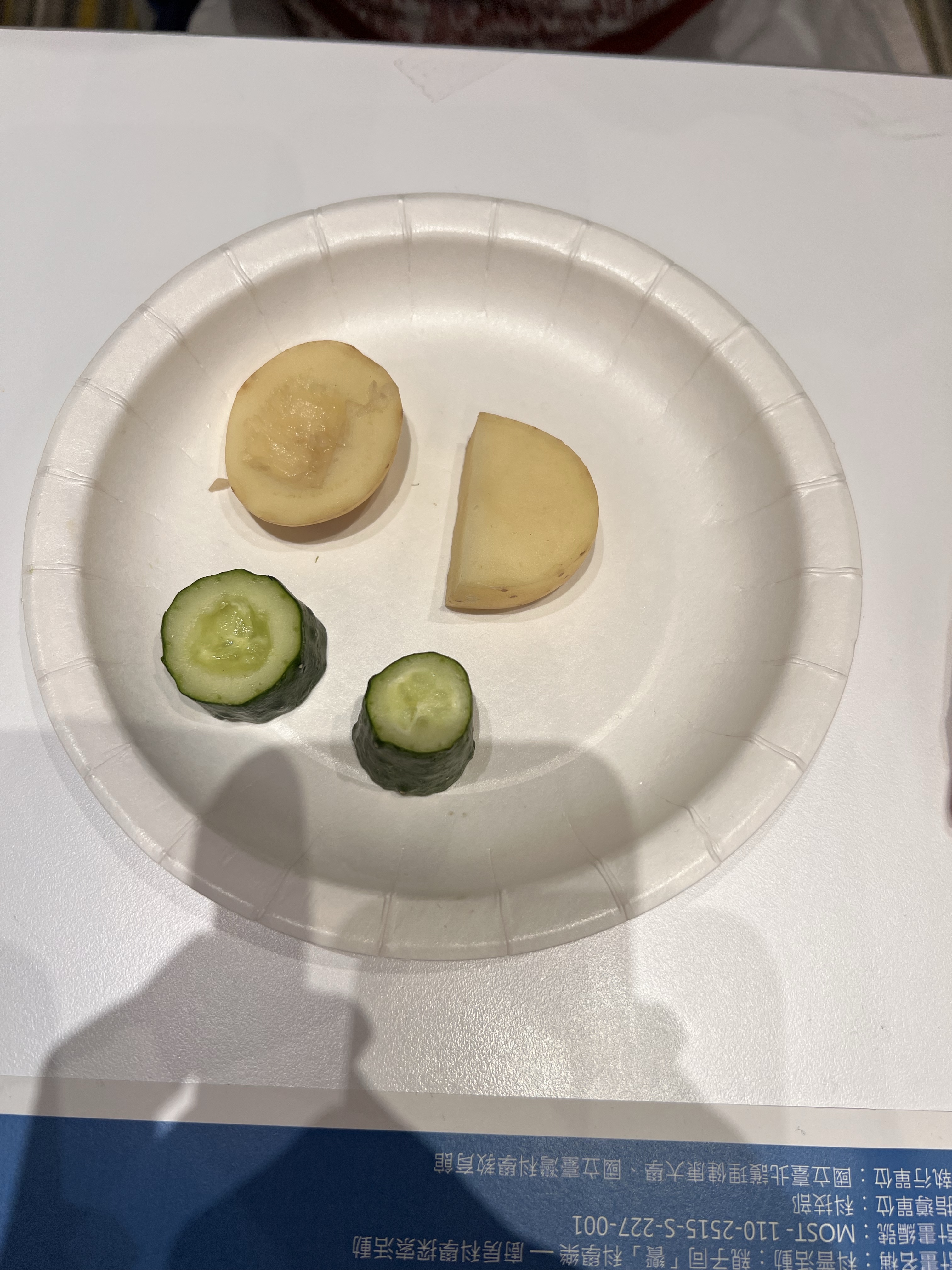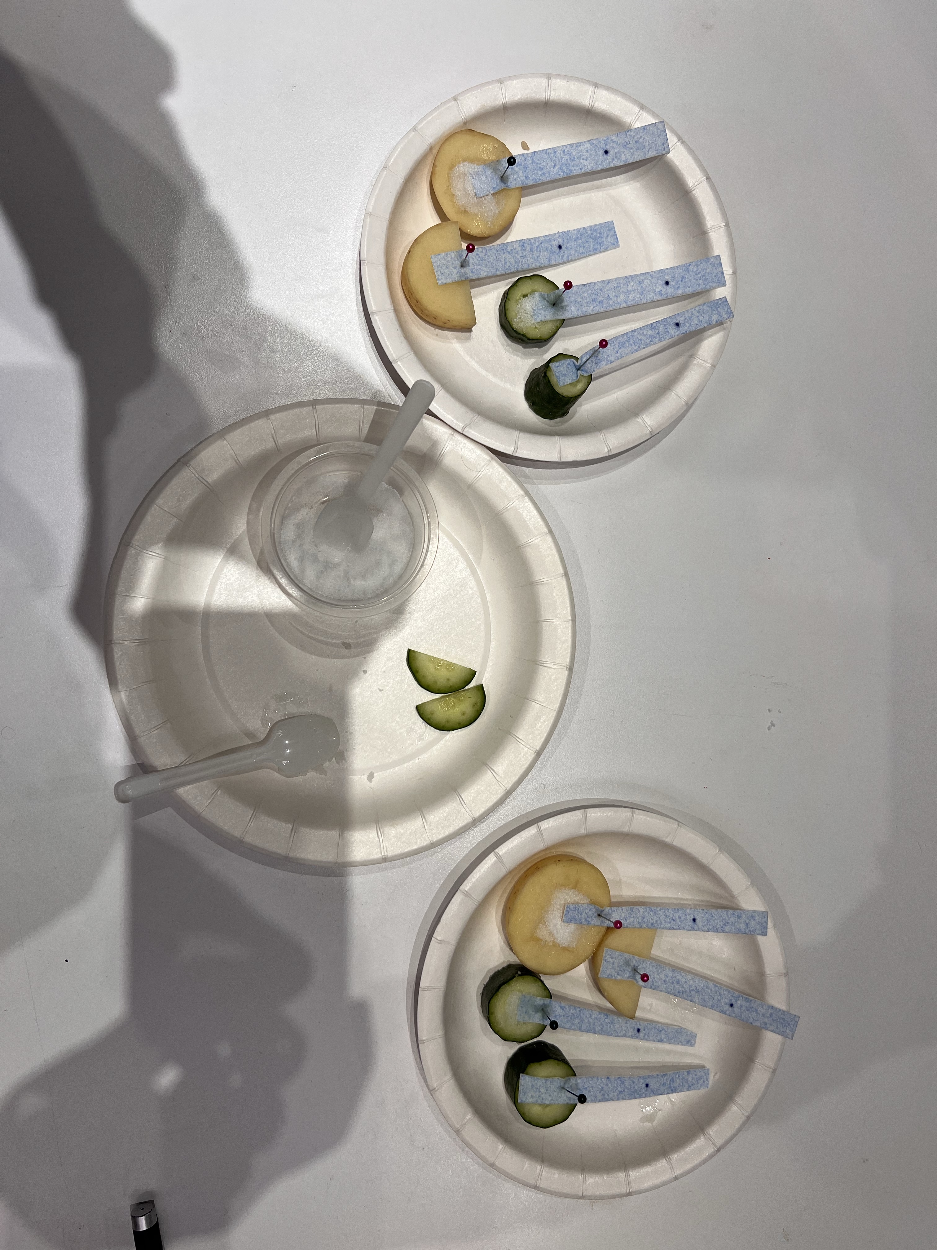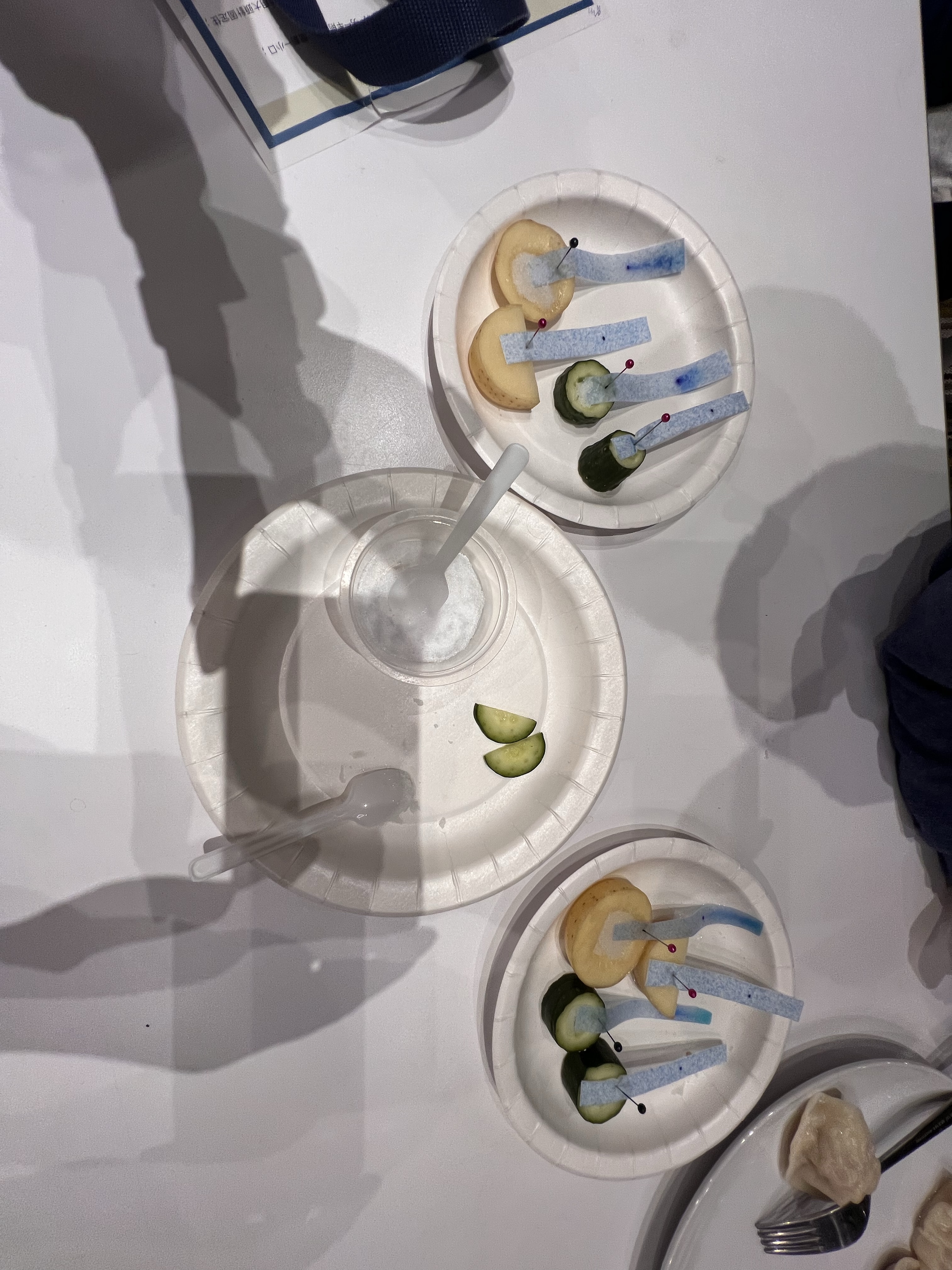 還是先設定實驗,拿了小黃瓜及馬鈴薯,一個有挖洞,然後放鹽,之後每個放入吸水試紙,就完成實驗設定,要去看製作水餃了。