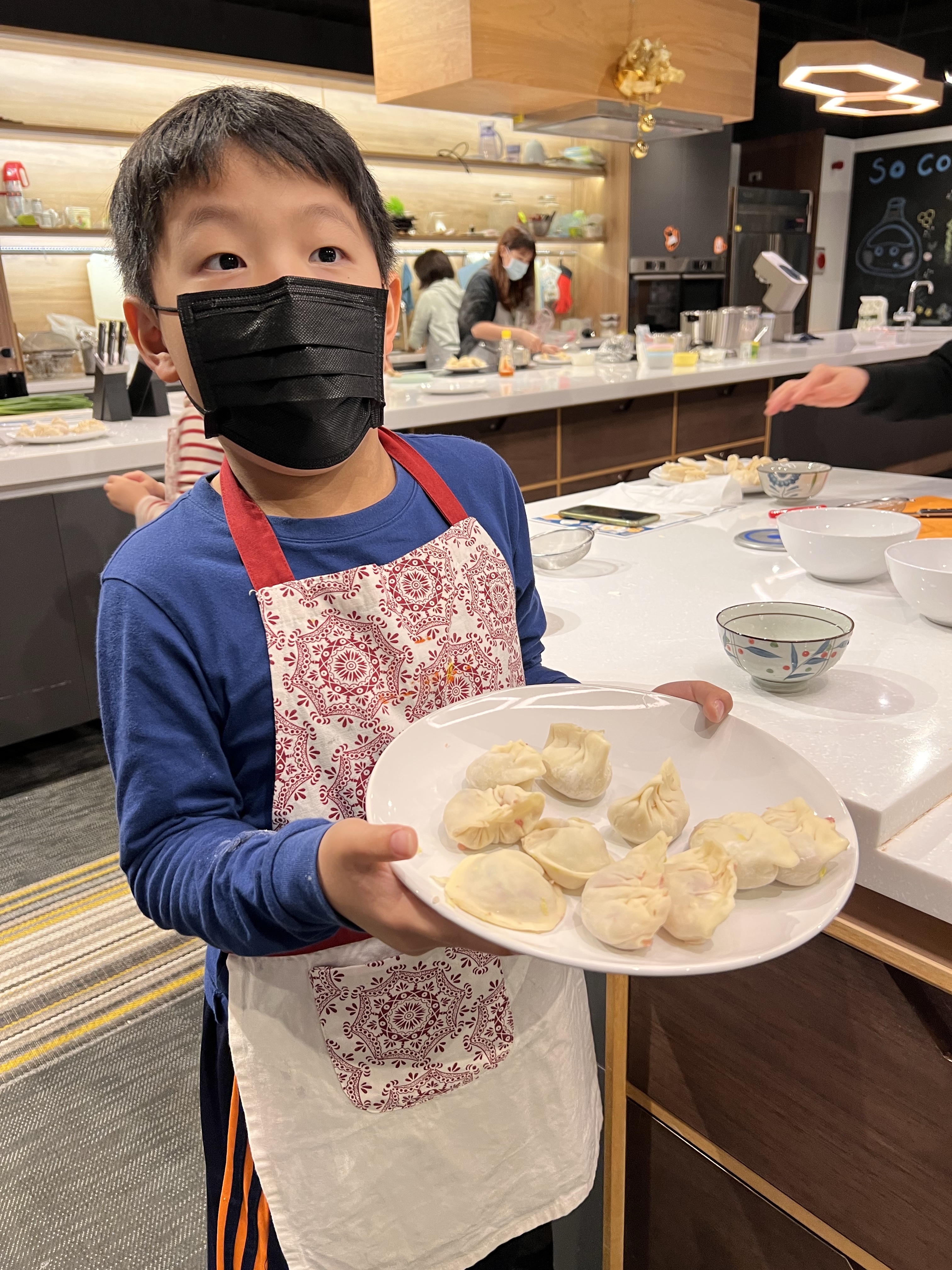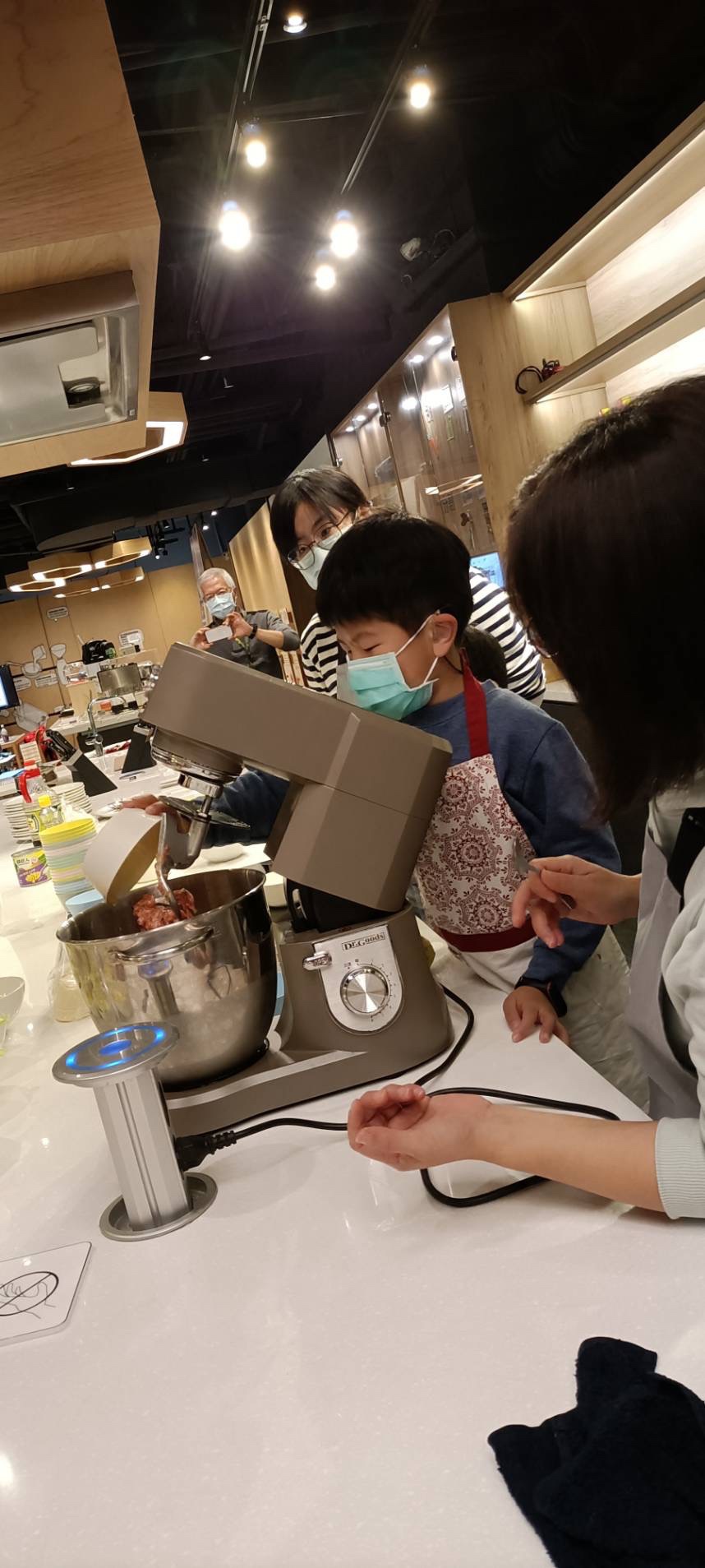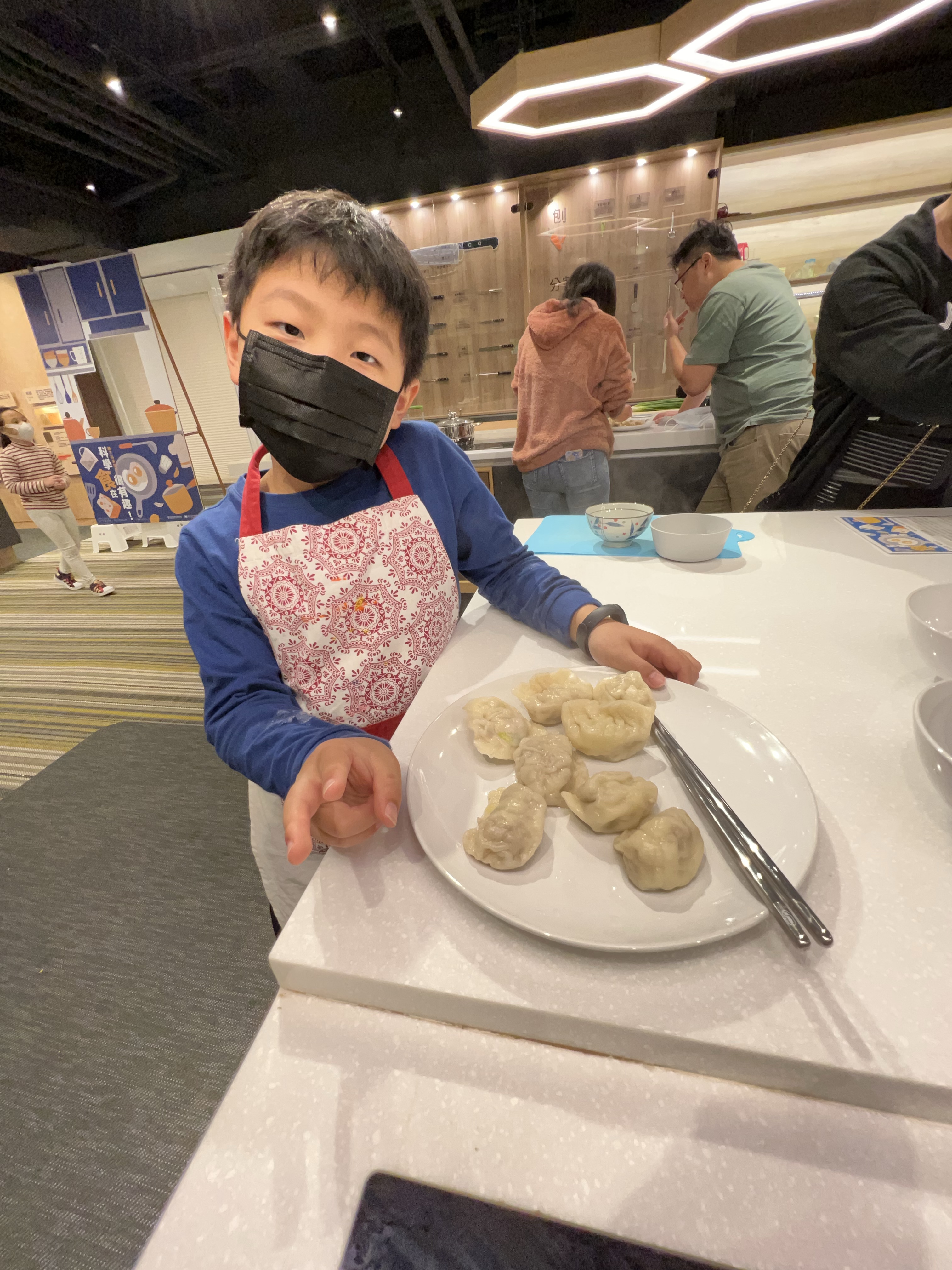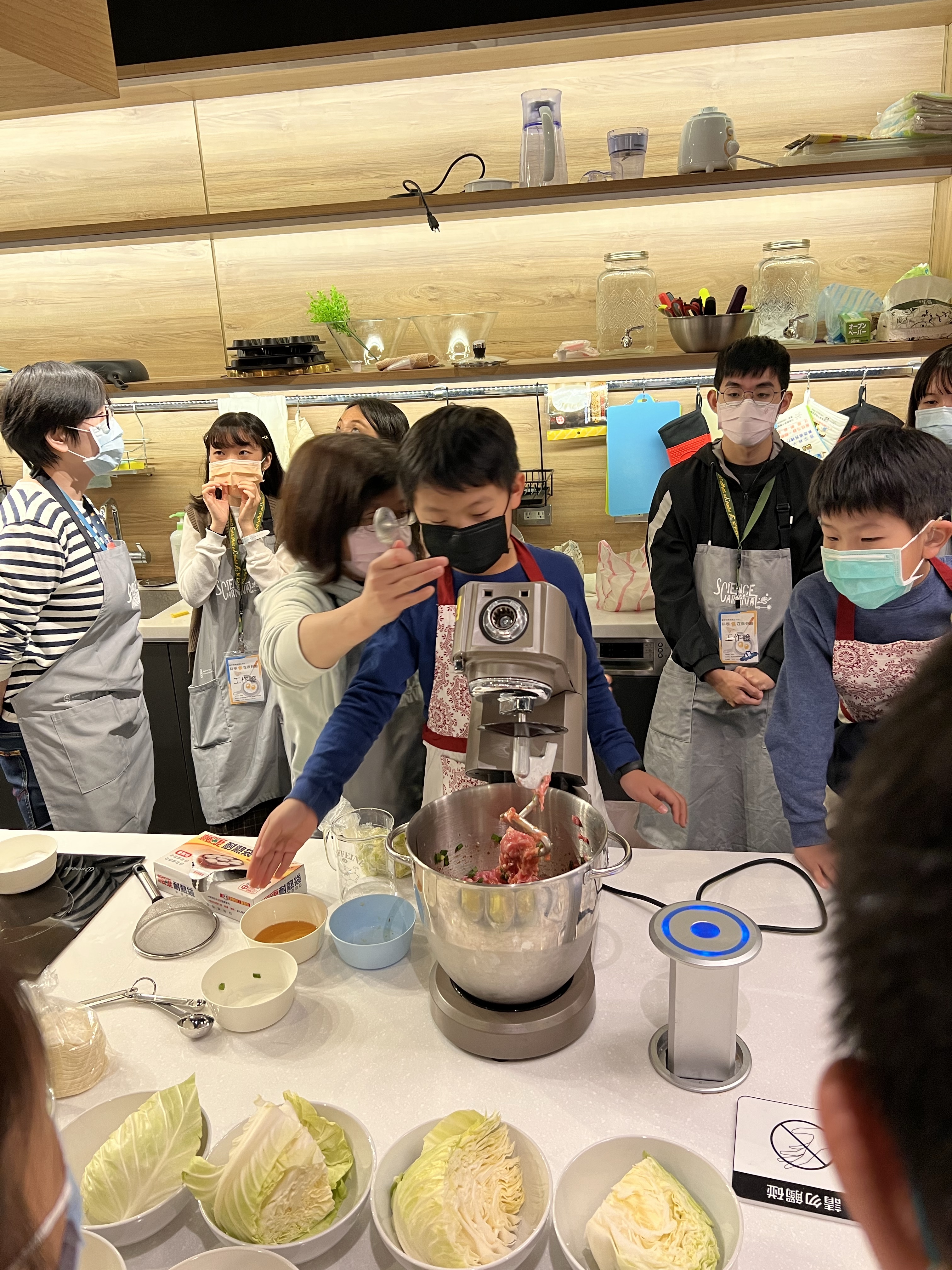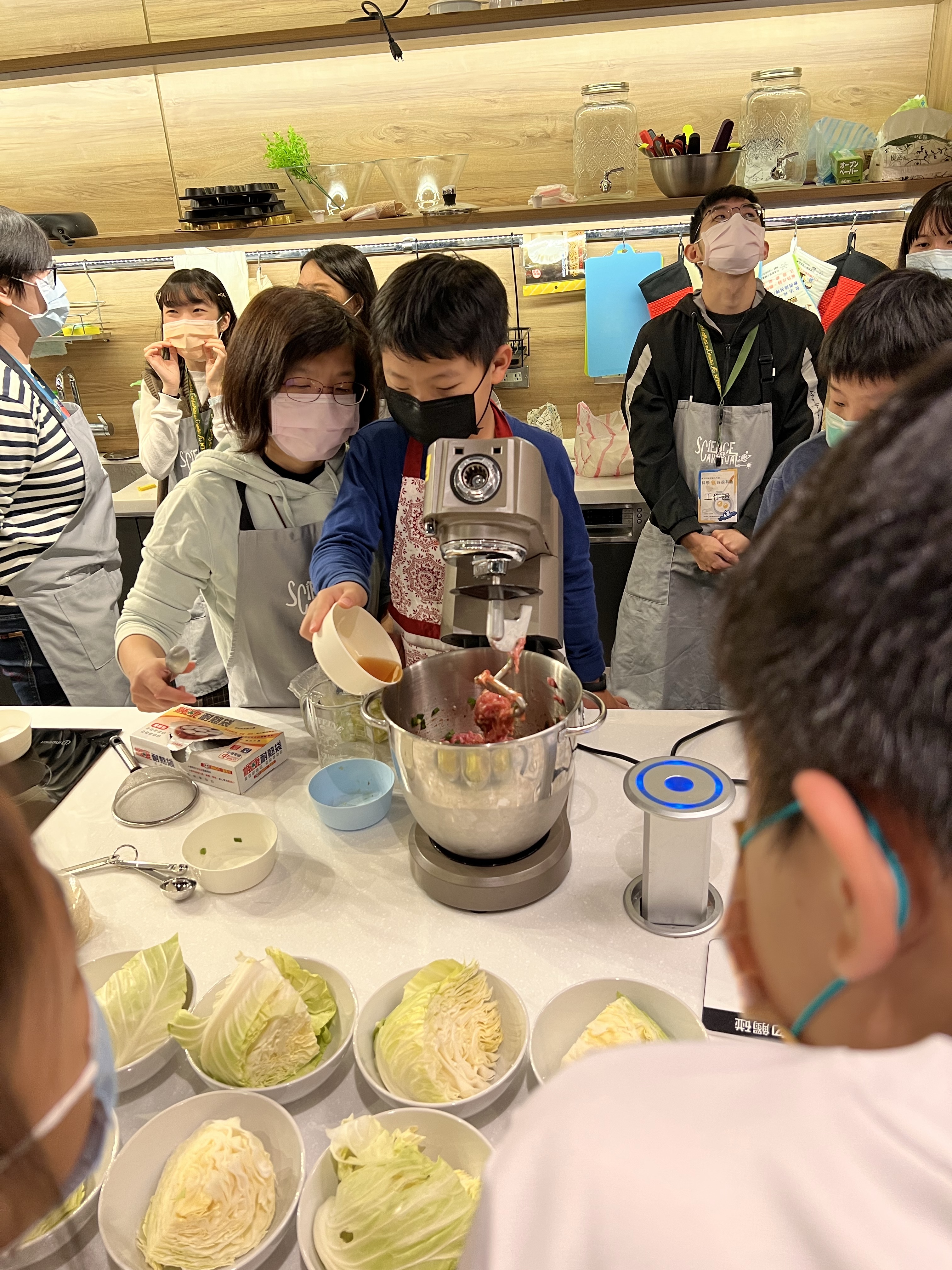 一開始是介紹水餃的準備材料,當然是買好現成的水餃皮,再來是高麗菜切碎,然後加鹽脫水,再來是絞肉的製作,當然是買現成的絞肉,然後開始添加鹽、薑、蔥的材料,還加入水跟香油等,完成絞肉後,就跟高麗菜拌在一起,就完成水餃的餡料,接下來就是教如何包水餃,再來就是煮水餃,因為是常溫,所以水餃浮起來就好了,不用在加水。大小沐沐運氣很好,有去幫老師添加材料。
