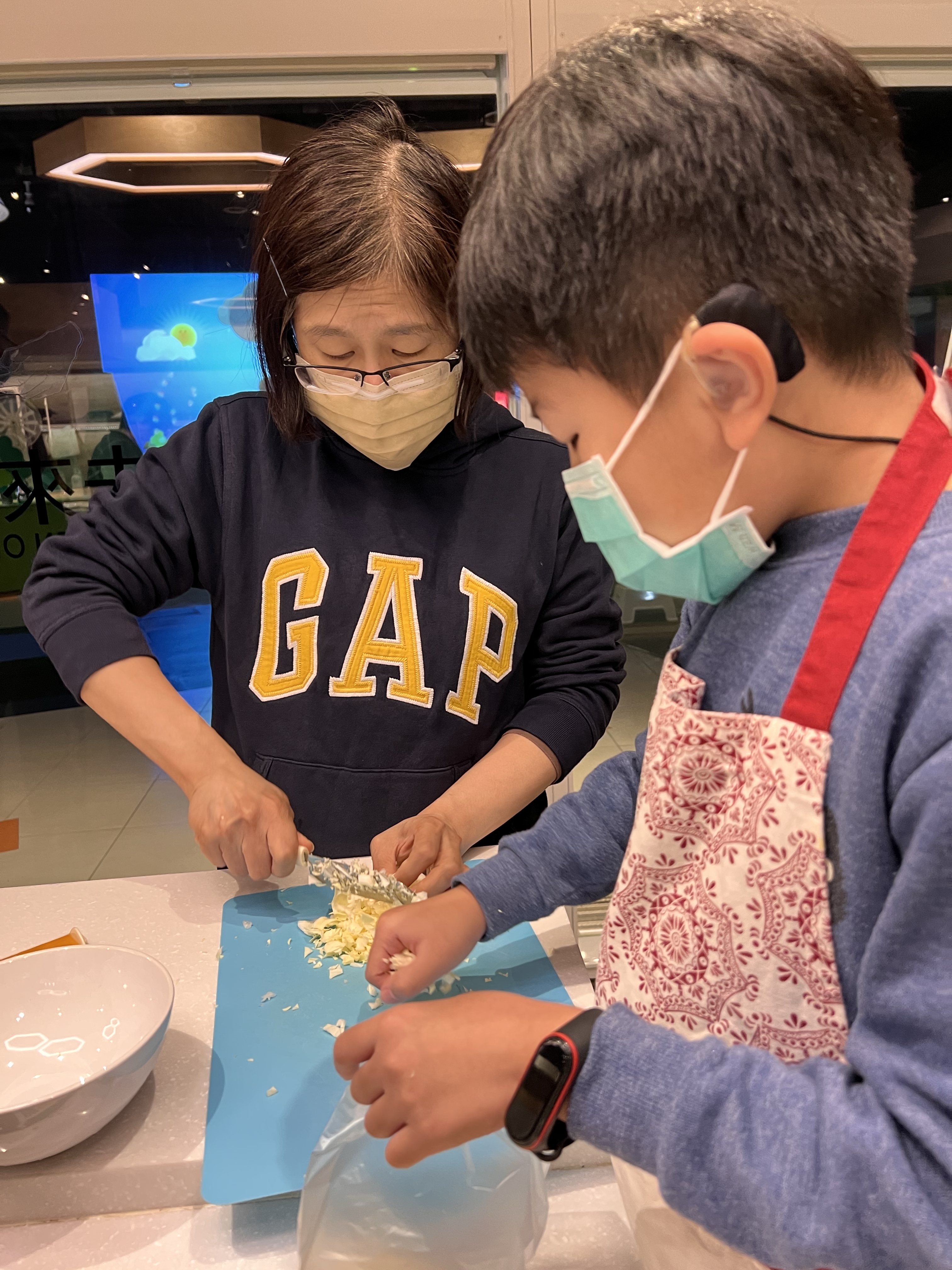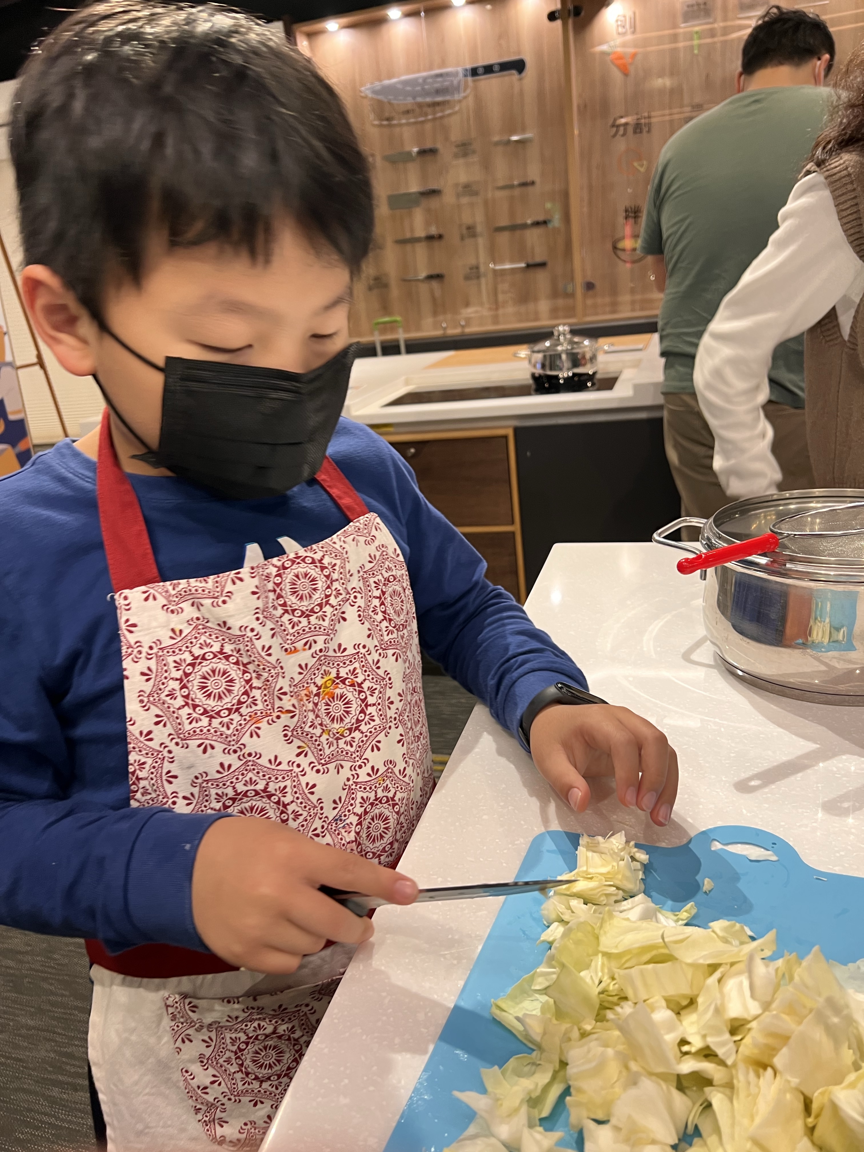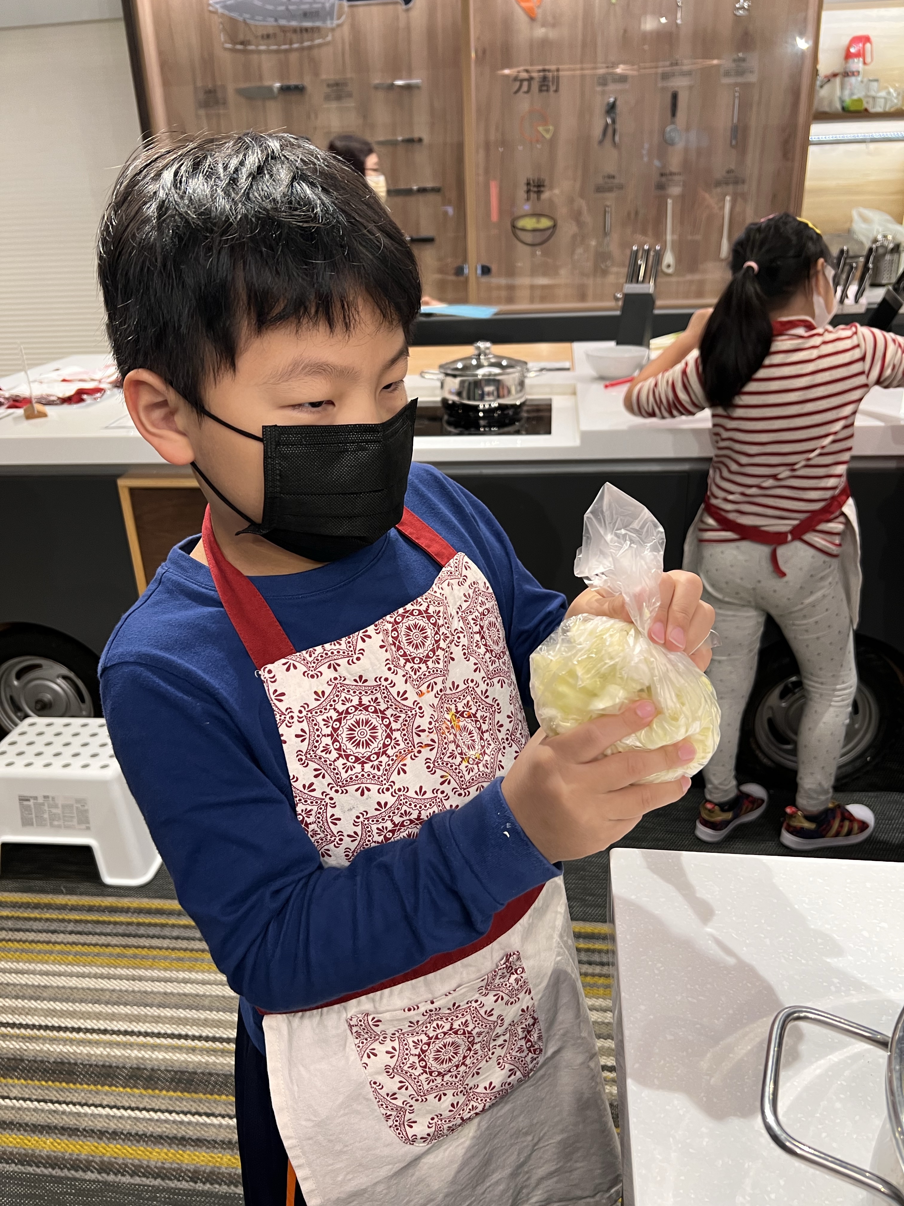 自己開始製作,切高麗菜,後面還是沐爸沐媽幫忙再切碎一點,然後加鹽脫水。