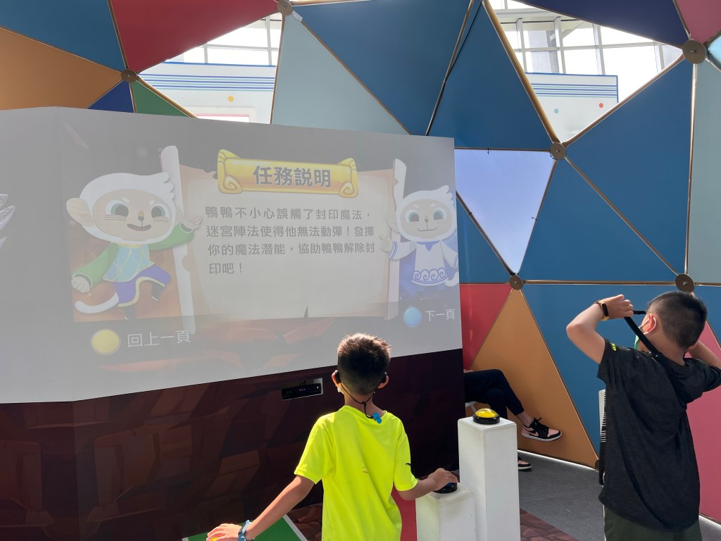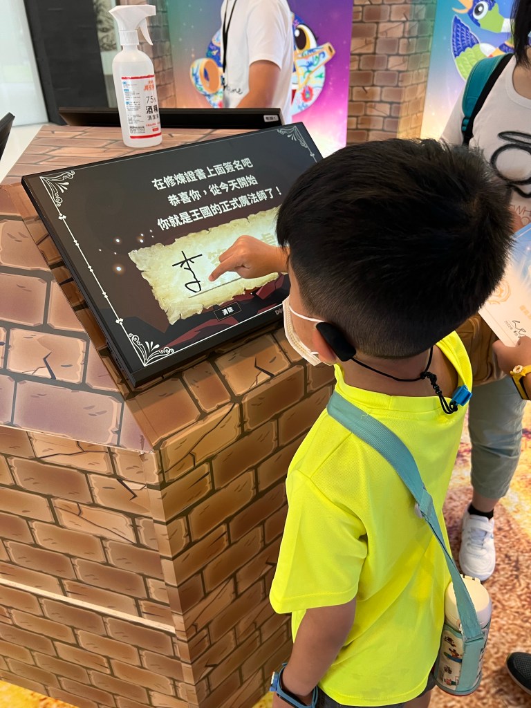 大小沐沐從三樓開始闖關,慢慢地往二樓闖關,最後到一樓的《煉成魔法陣》進階試煉場,取得最後的證書,再返回二樓出發處,拿到獎品(拼圖)。