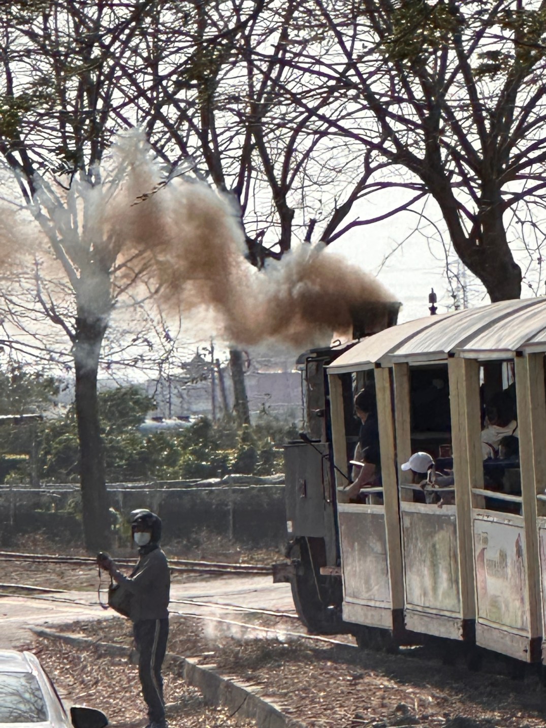 後續我們跟著排隊,順利搭上小火車,也有看到一群人無法上車。接下來就就是搭著短暫的火車到一個地方,底下拍的視頻,可以看到蒸氣冒出的樣子,相當難得,也可以聞到濃濃的氣味。