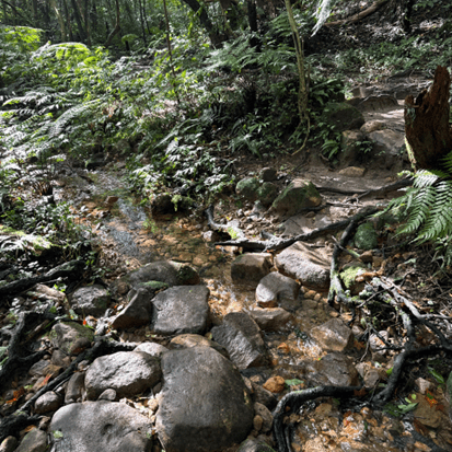 整體行程幾乎都是下坡,雖然聽起來輕鬆,但不少路段滿是濕滑的泥地,得步步小心。這一段的風景變化多端,讓人走得既放鬆又驚喜。
