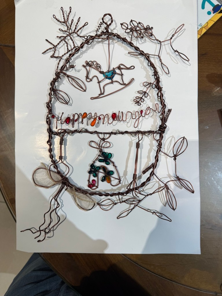 這是我的第一件鋁線作品!利用金屬線條彎折出「Happy New Year」與旋轉木馬,再點綴上繽紛串珠,將冰冷的線條轉化為有溫度的工藝品。