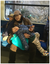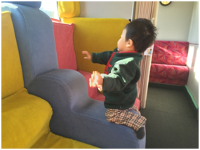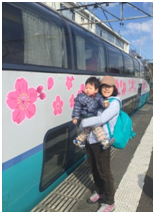 本次日本之旅最大重點就是去伊豆玩耍、泡溫泉。一樣還是起了一個大早,因為要趕車去,因為火車不等人的。由於今天日本放假(日本的建國紀念之日),所以地鐵的人潮少了許多,讓我們可以稍微輕鬆的搭車。先搭車從大井町到新宿,然後在新宿搭"超景踴子(Super View Odoriko)"號到伊豆,下車車站為伊豆高原站,搭車時間約為2個小時,"超景踴子(Super View Odoriko)"一共有十節車廂,中間有販賣部,當然他也會推車過來,或是你跟服務人員點餐。最特別的是,第十節車廂為親子車廂,屬於上下層的車廂,上層為座位與觀景座位(因為是最後一節,所以是看車尾風景),下層為親子活動與哺乳室的空間,設計相當貼心,一個讓媽咪可以安心餵奶,另一個是小朋友可以到處走動,不會打擾到休息的乘客。由於妹妹很厲害,就幫我們全部都訂位在這一個車廂。