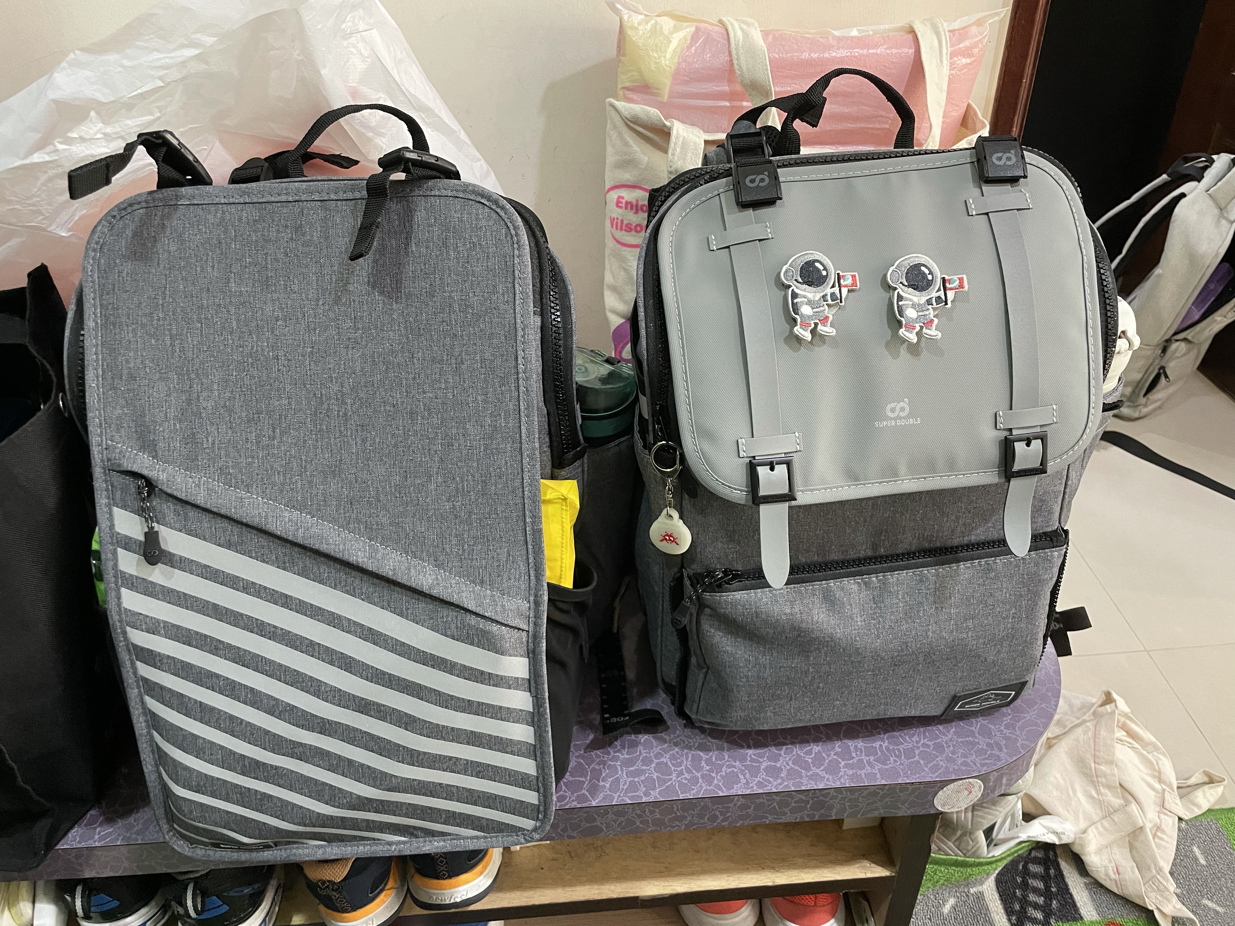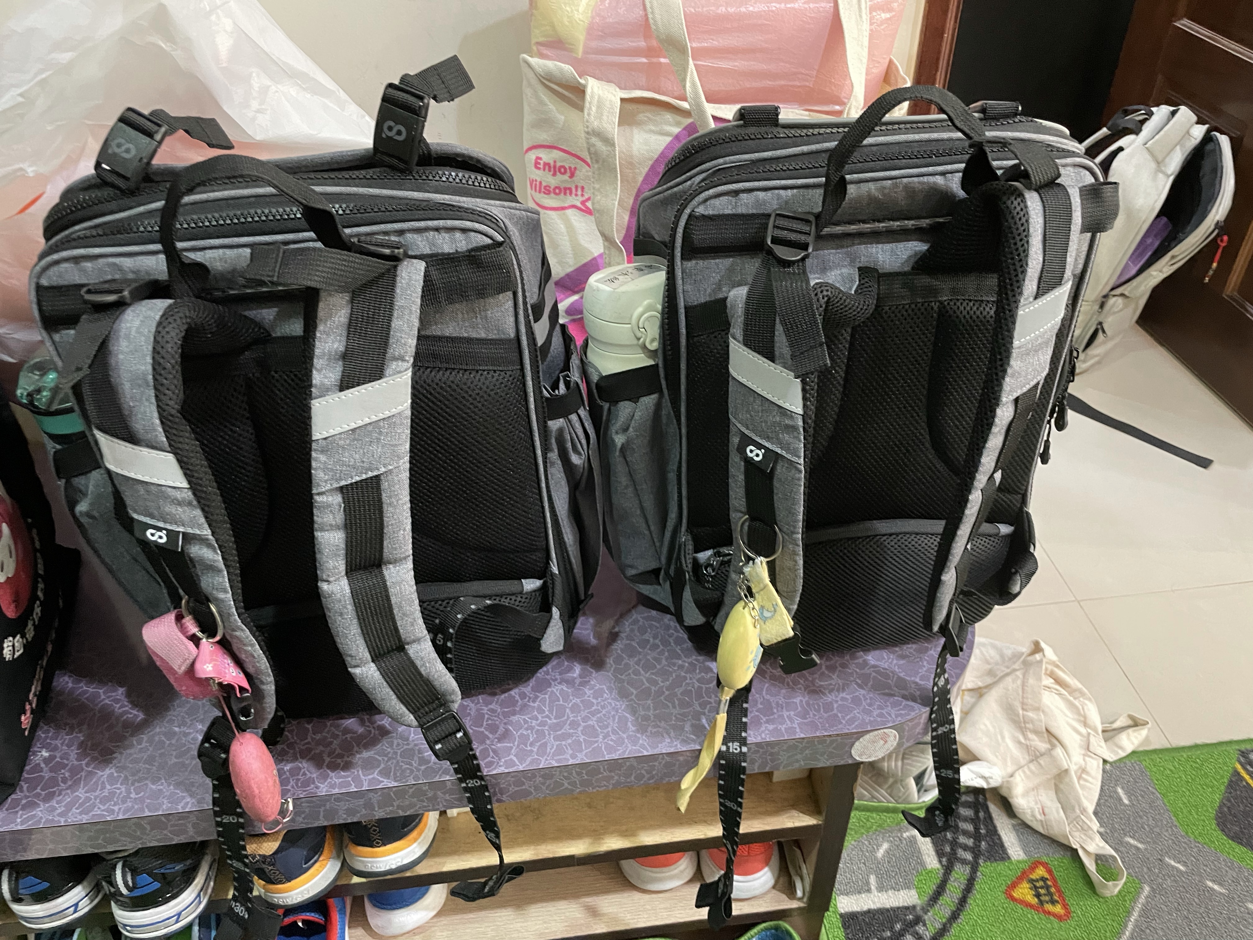 9/8紀錄使用一週後,1.持續拆除橫向繩子 2.包包用防水袋沒有使用,主要是小學生都是用雨衣,所以包包都在雨衣內。3. 布作圖樣已經弄掉1個,主要給的背膠黏於短版上容易掉落。4.小孩持續不跟我感覺如何,大人在背的時候,原則上蠻舒服的。