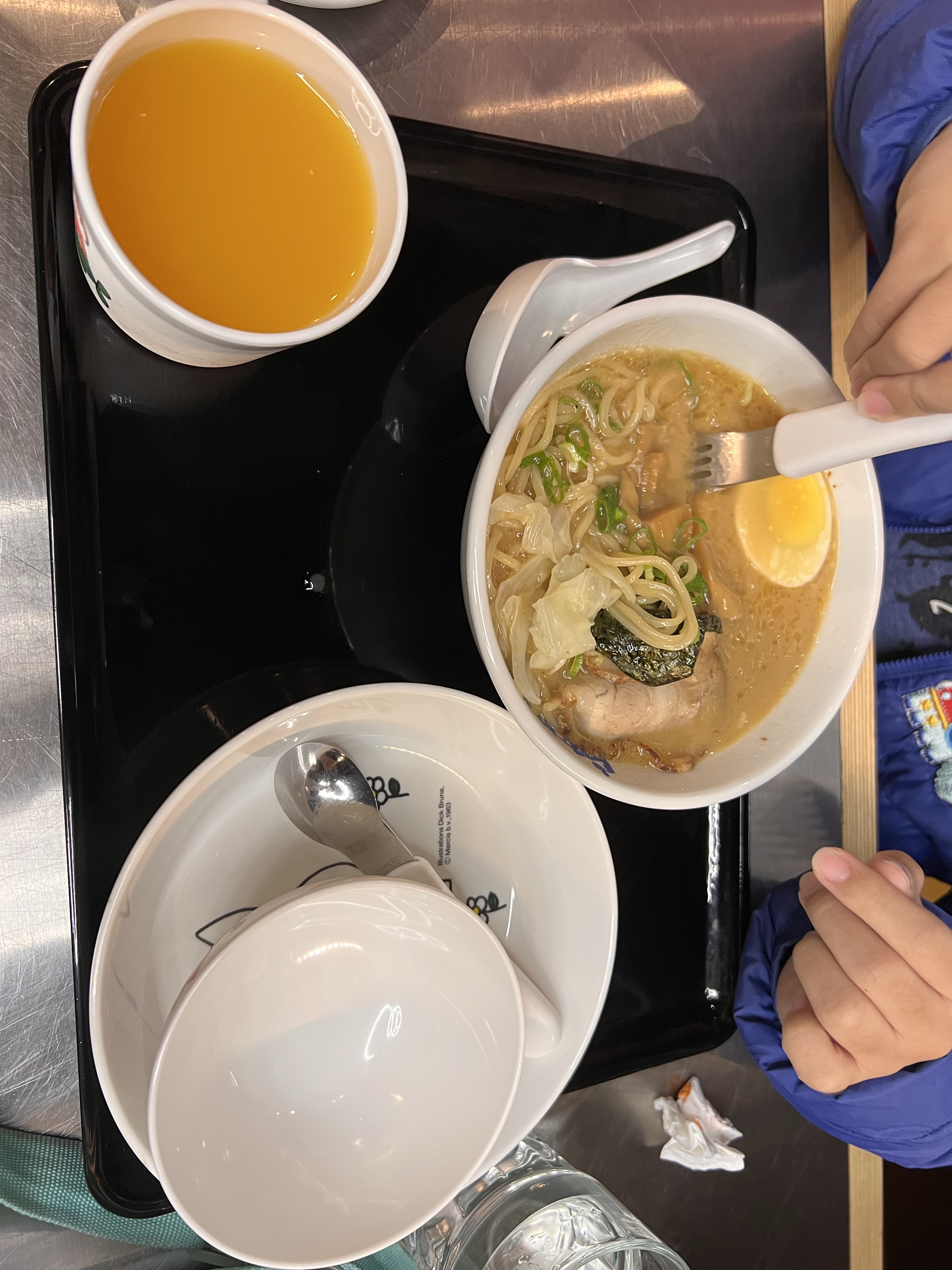 這邊由於重新改裝,很多店都更新了,我們這次選擇らあめん花月嵐吃午餐,其實也超過好幾次,這次是一個兒童餐、一個鐵板的醬油炒飯與一個期間限定的拉麵,依序是小沐沐、大沐沐跟沐媽想吃的東西,沐爸則跟沐媽共吃一碗,因為小孩會剩食,另外有一個家一個套餐的部分。