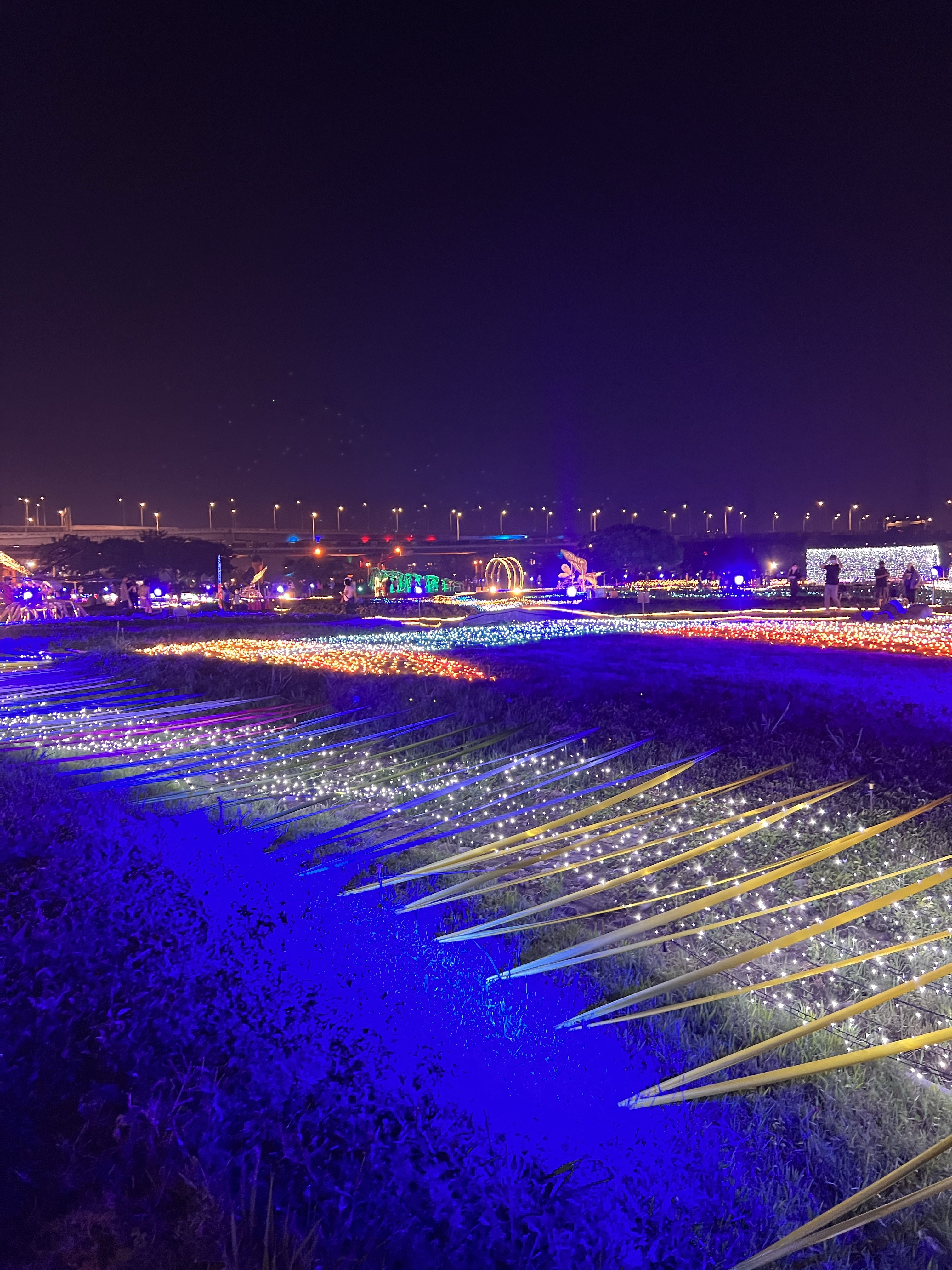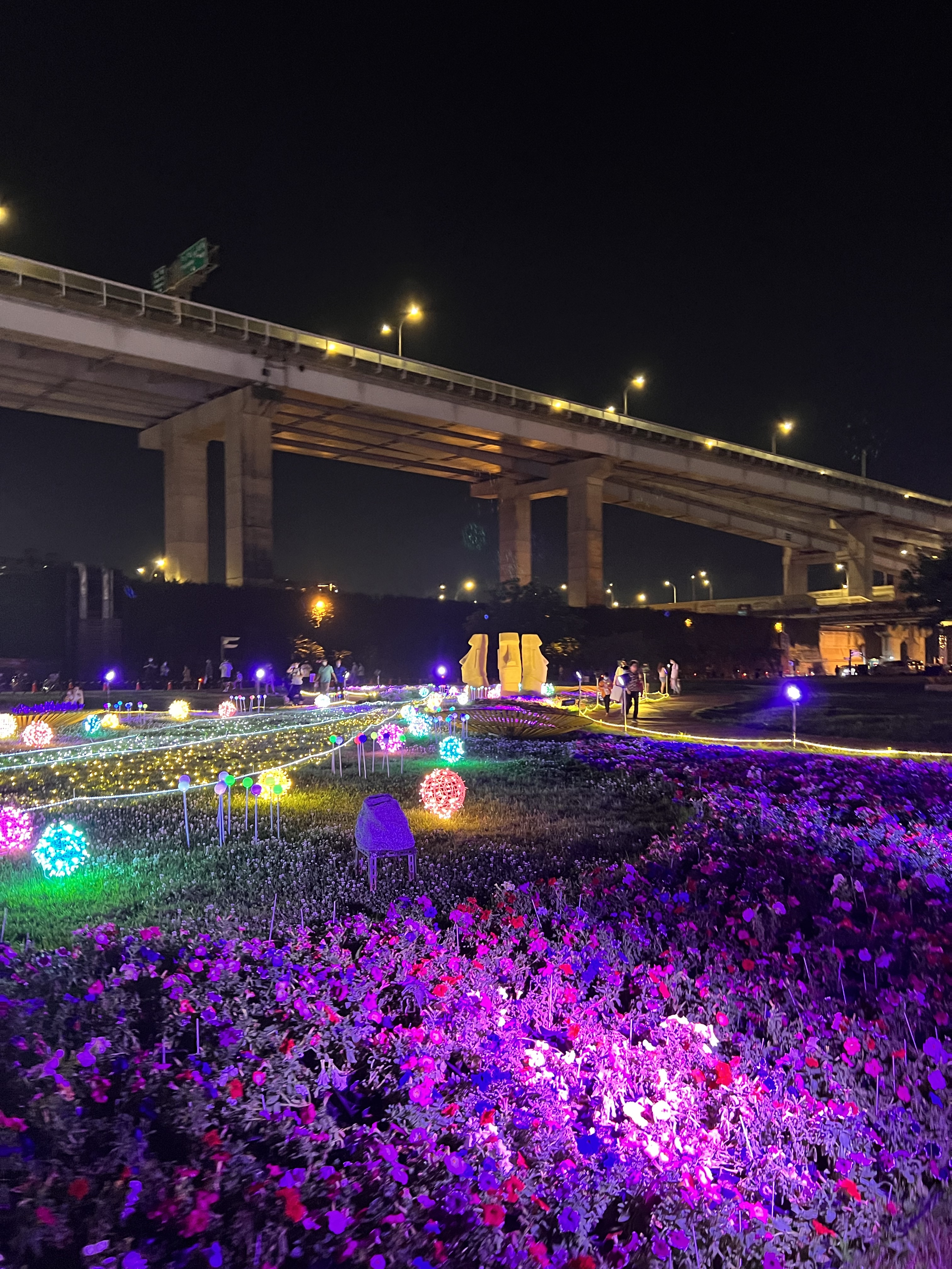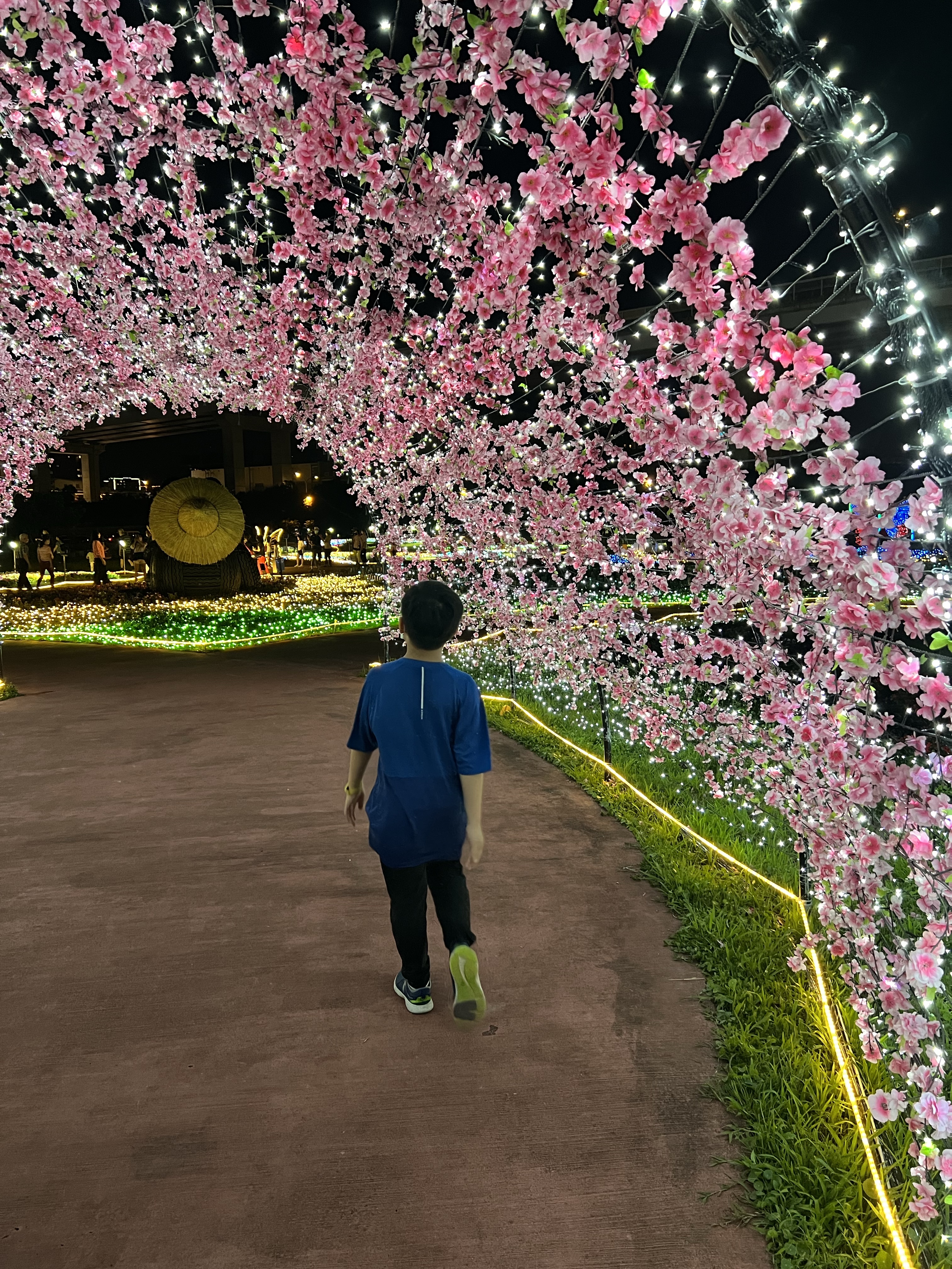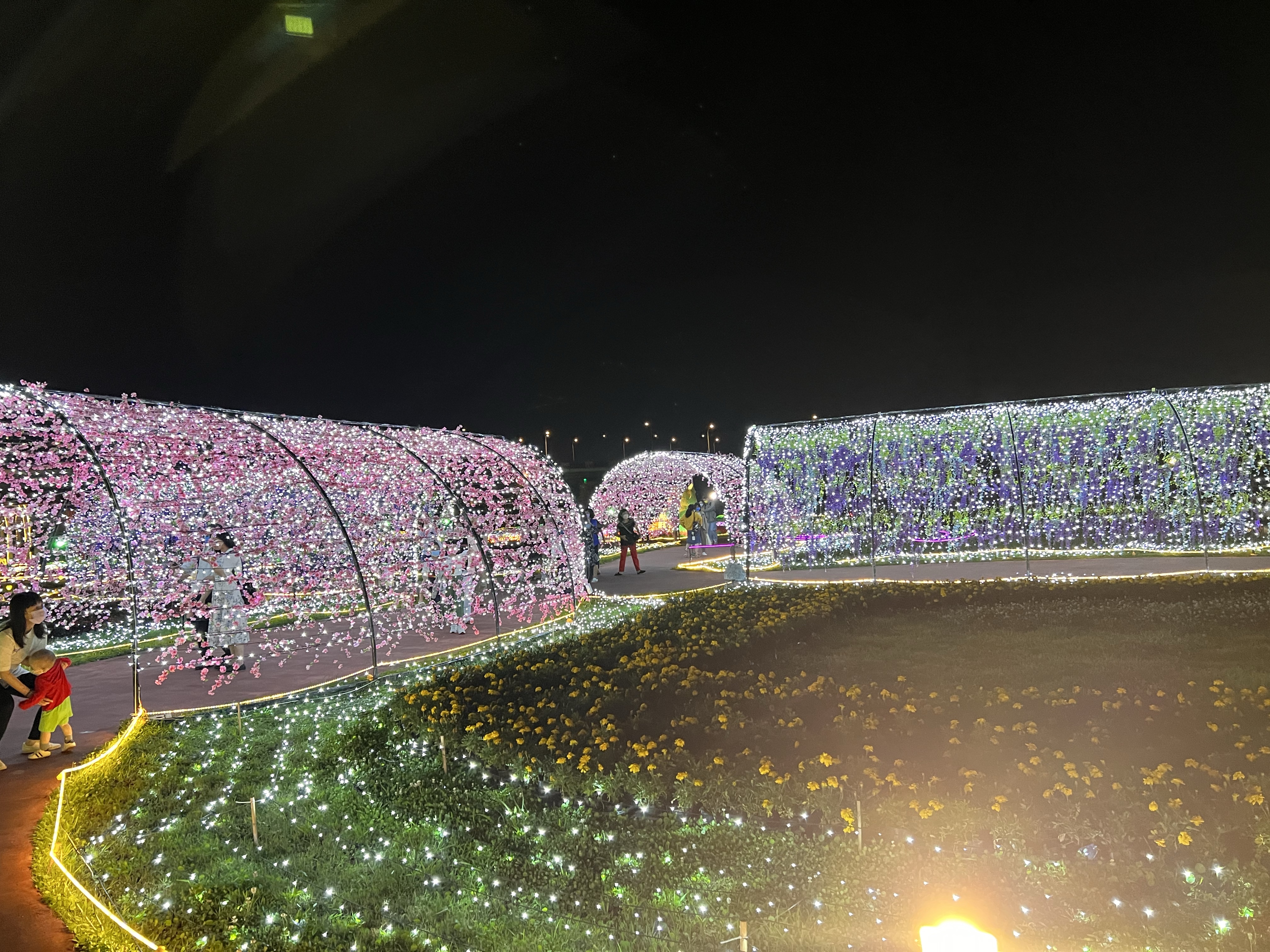 以往這邊許多人最愛的部分,就是燈海的部分,今年有四條燈海,兩個不同的形式,一個是粉色系的花-櫻花,另一個紫色系的花-紫藤花,兩邊晚上都各具特色。