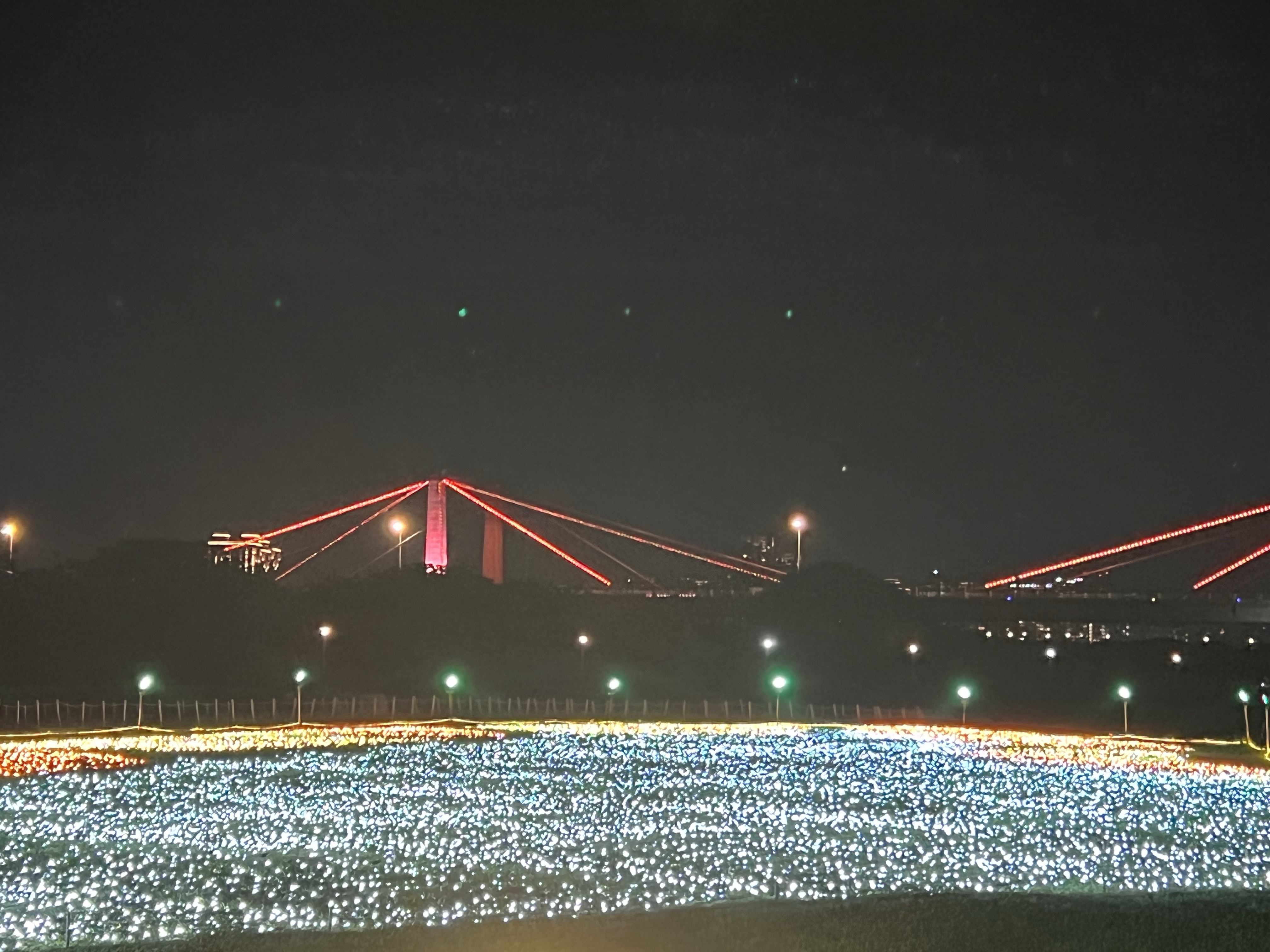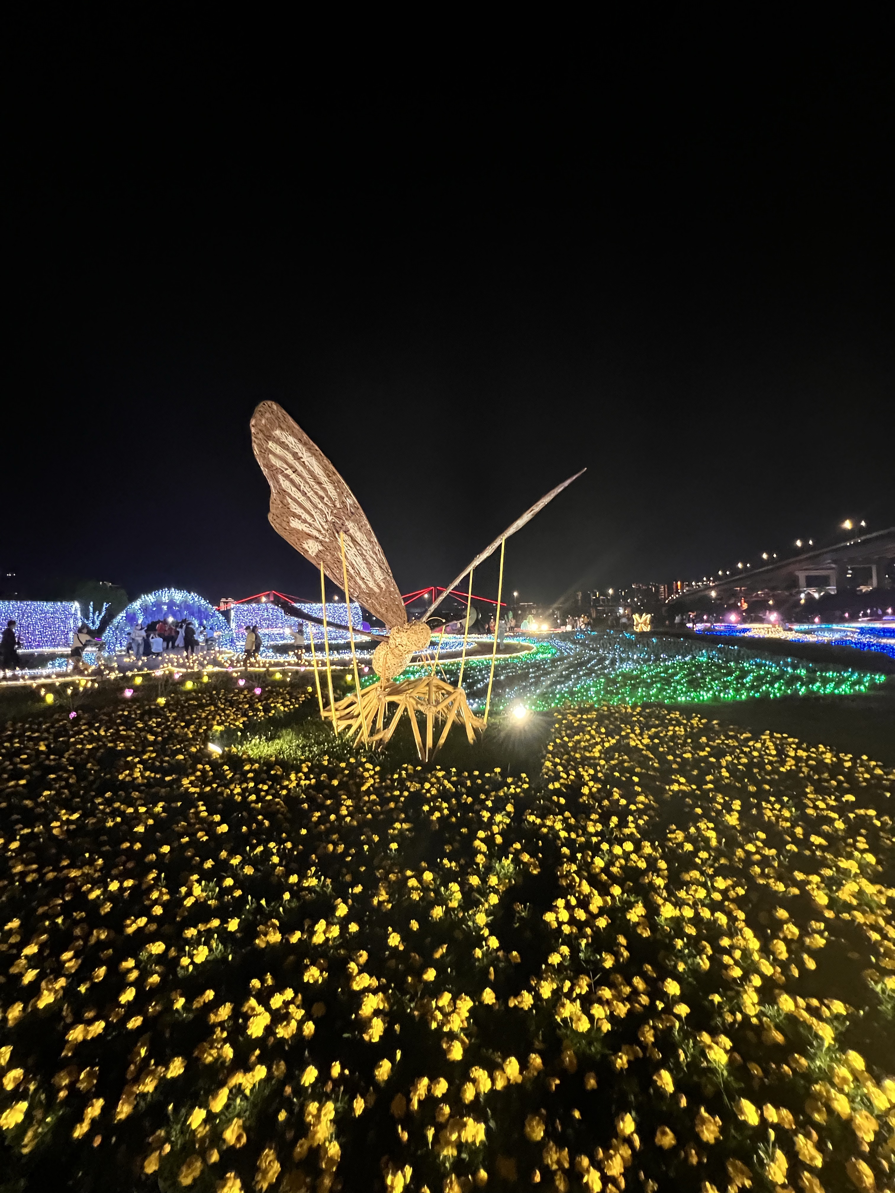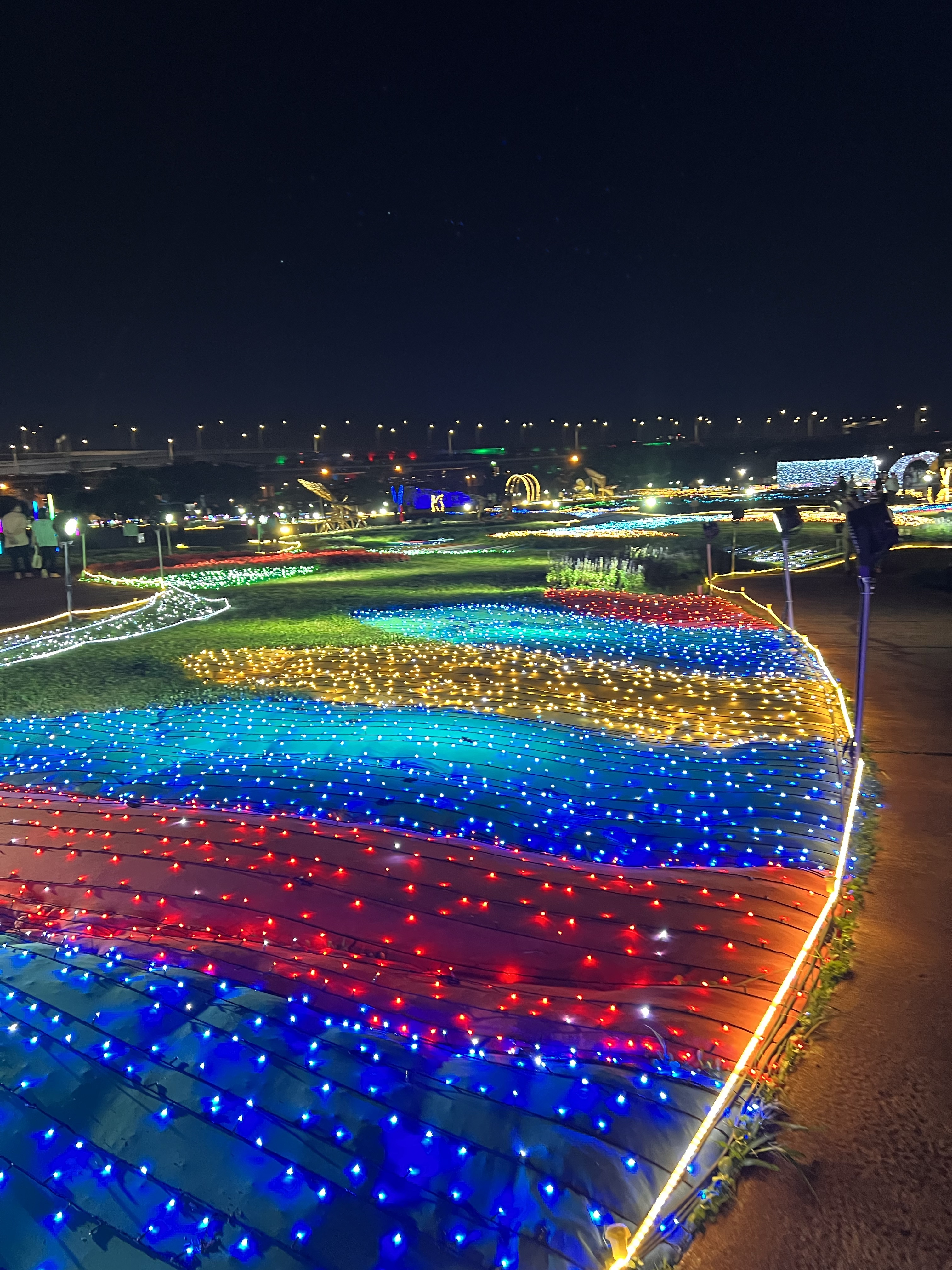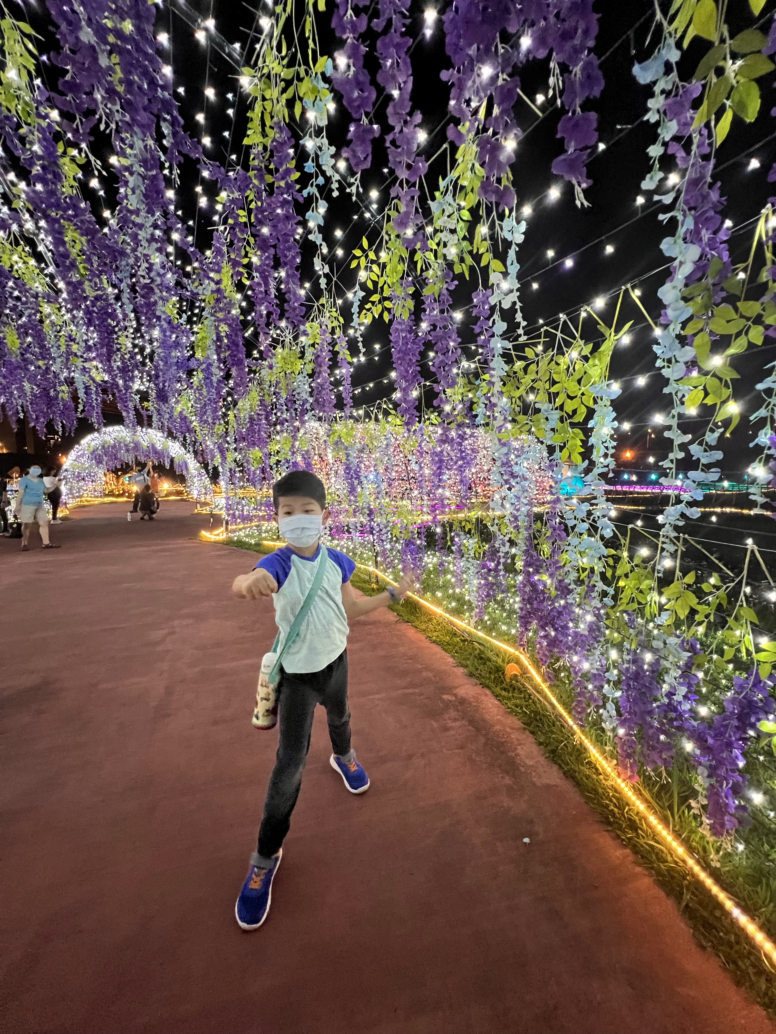 以往這邊許多人最愛的部分,就是燈海的部分,今年有四條燈海,兩個不同的形式,一個是粉色系的花-櫻花,另一個紫色系的花-紫藤花,兩邊晚上都各具特色。