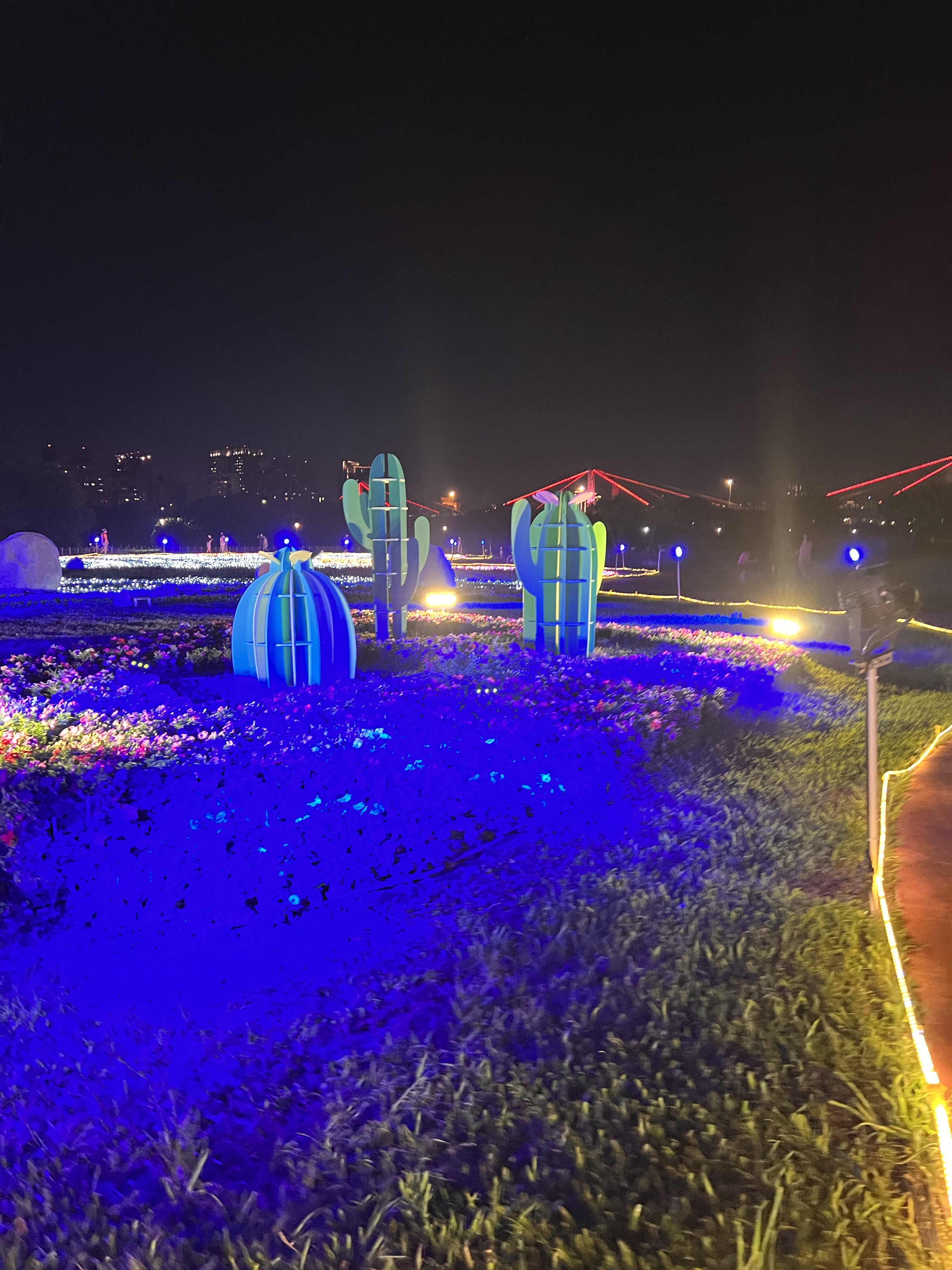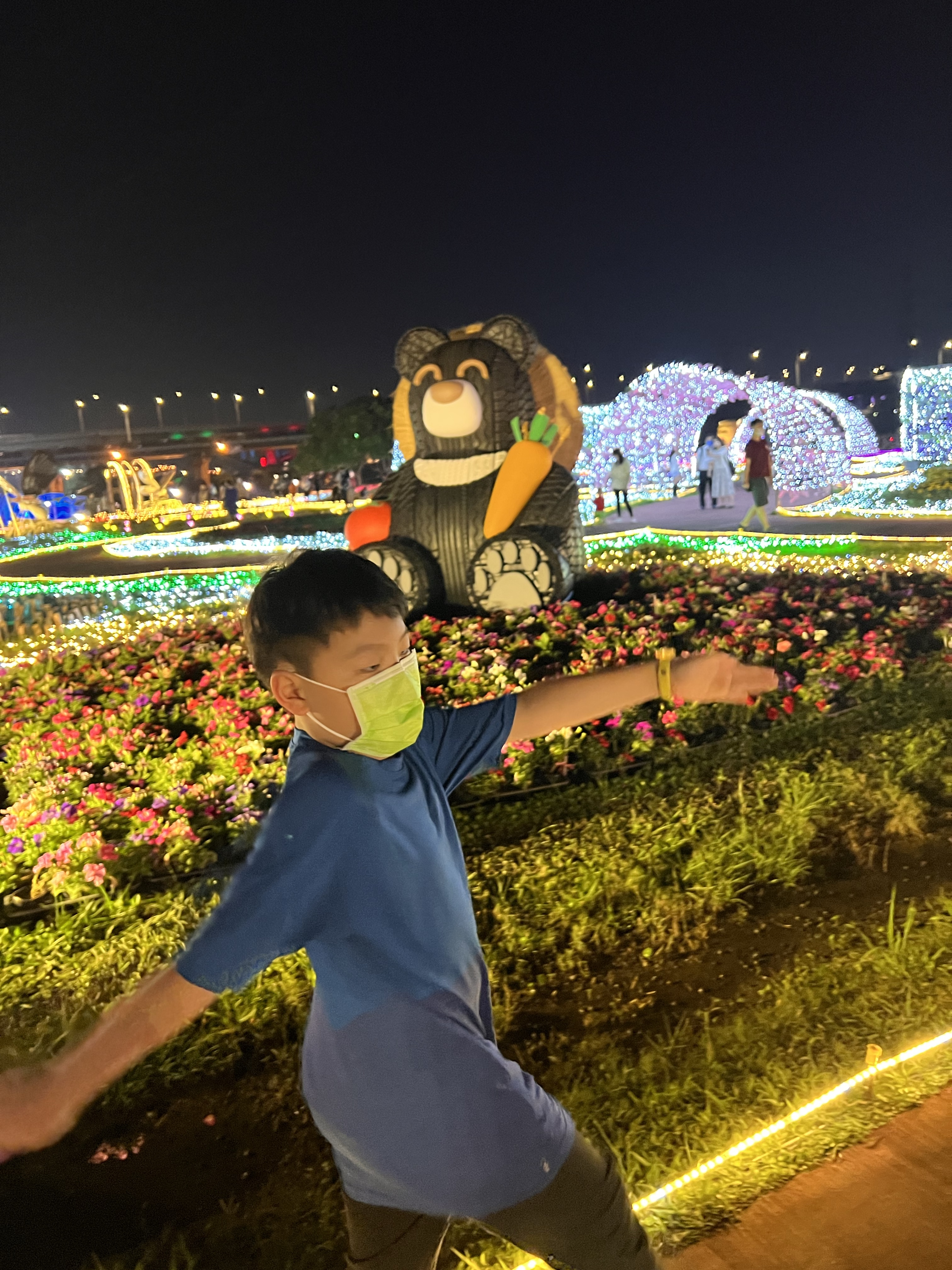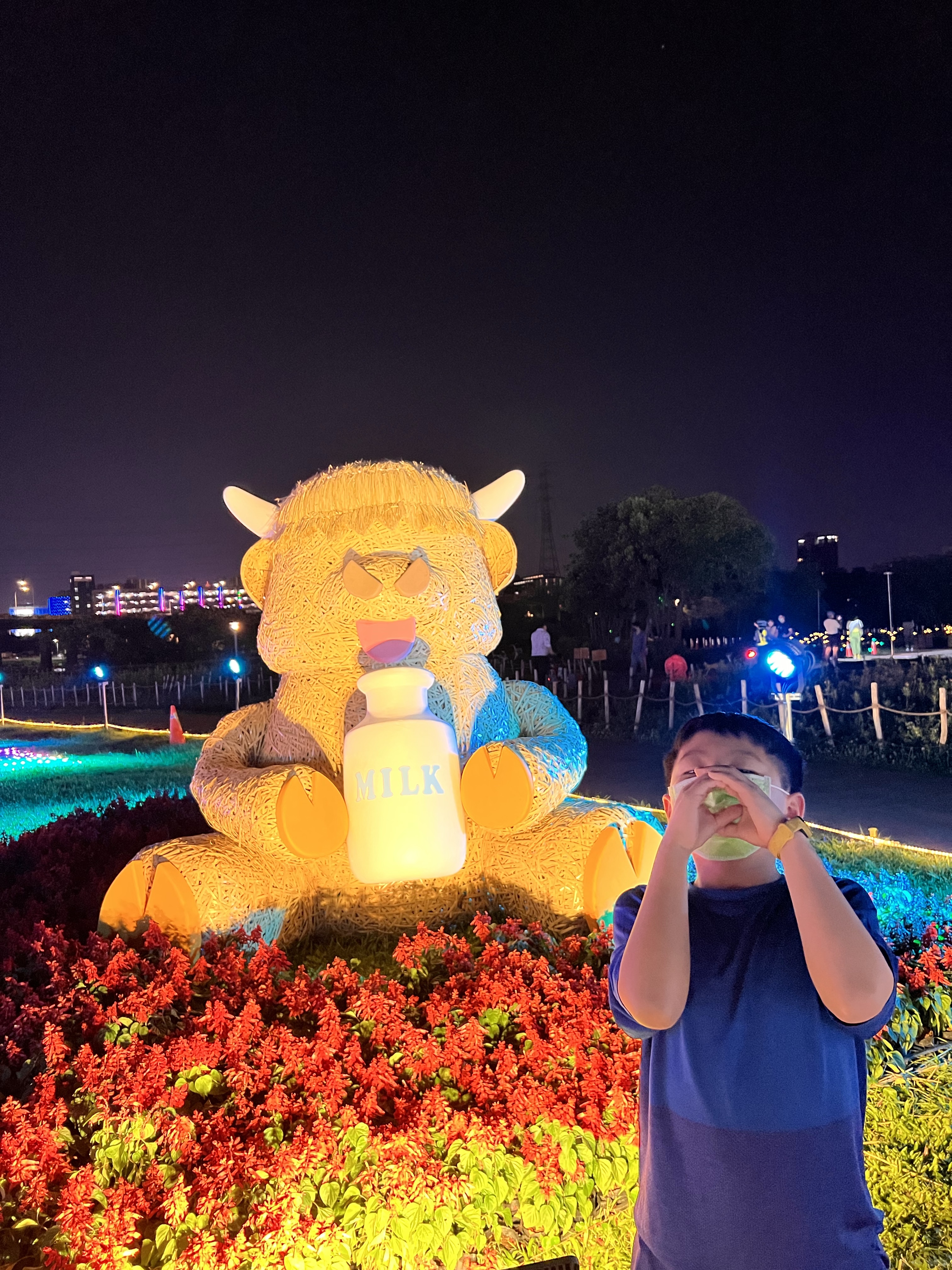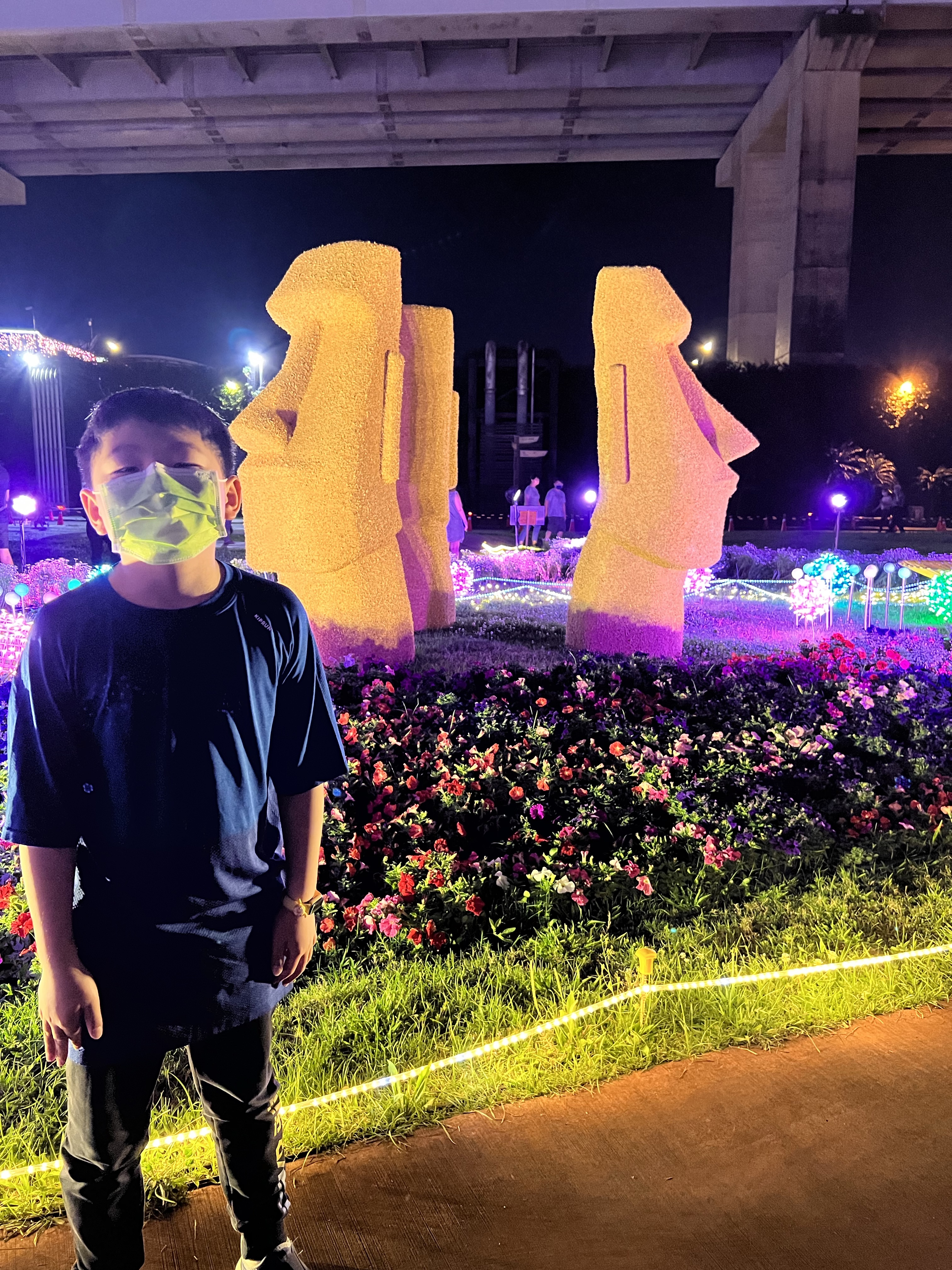 昨天就看到這邊在亮燈,每年這一個時候都會有這一個活動,今天晚上就過來這邊散步(快閃),因為小孩想要回家,大人想要散步,這邊有主要幾個景點,就是這幾個大型的造景,如台灣黑熊、摩艾石像、歐洲高地小牛等,應該是很多人想要跟他們拍照留念。