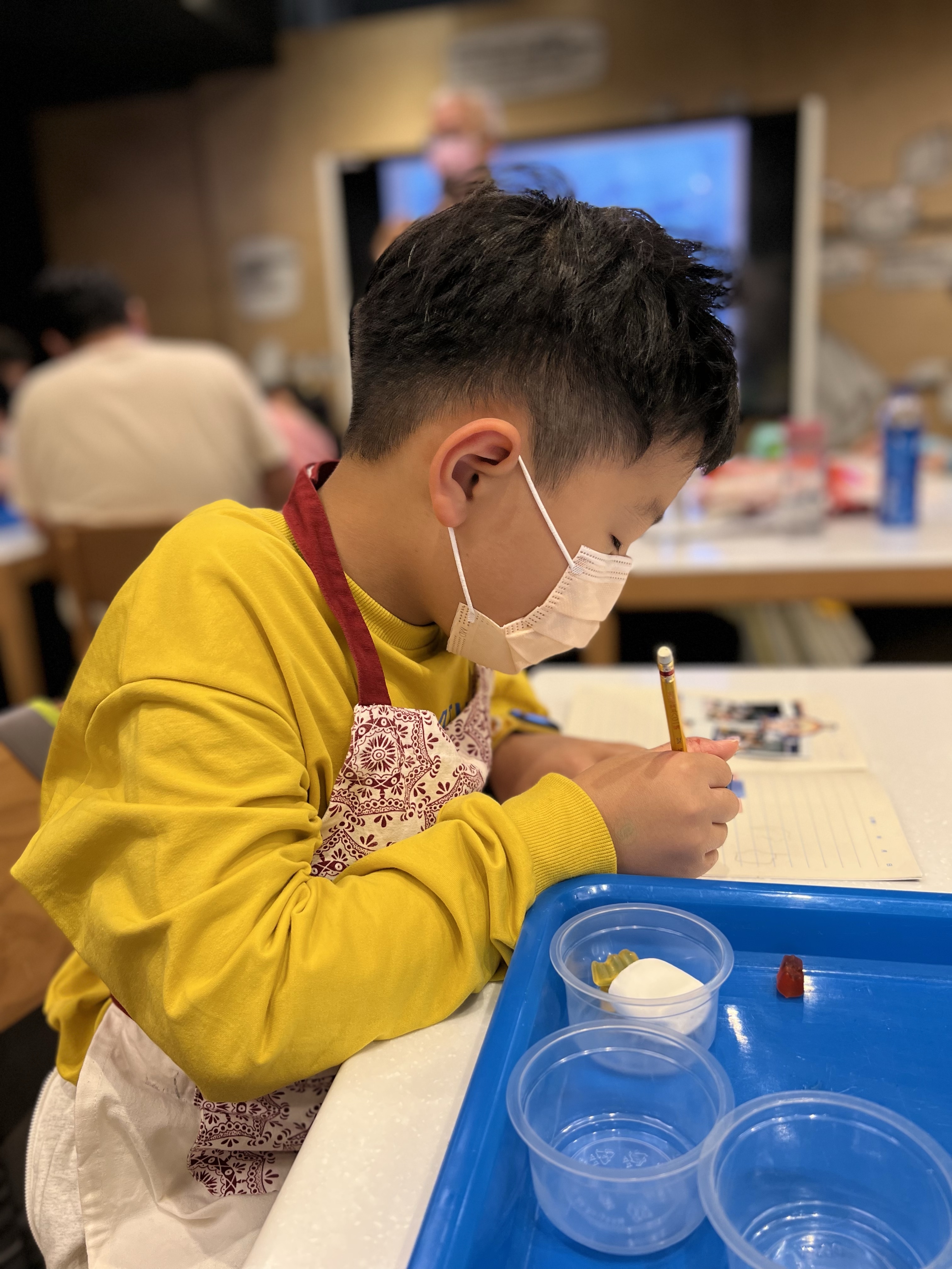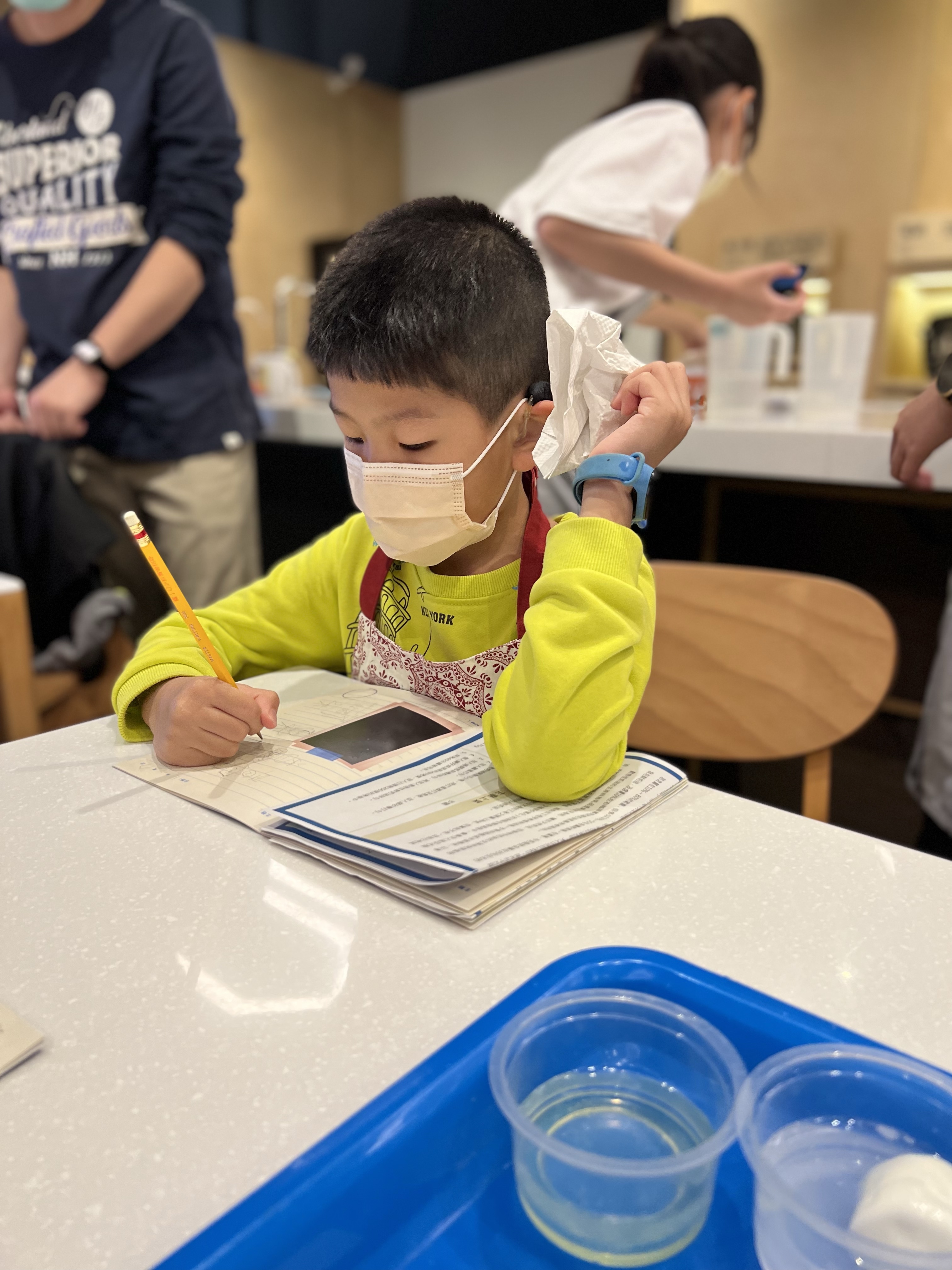 沐沐一家很順利有搶到一次活動,這一次算是第6次活動了,在活動開始還是會介紹一下,不過由於都不是第一次參加,所以講述的內容進行一些抽換。這次看小熊軟糖、檸檬糖、棉花糖等放到水裡的變化,而小熊軟糖還有一個放到糖水中,過一會會有什麼變化,大小沐沐用心紀錄著。