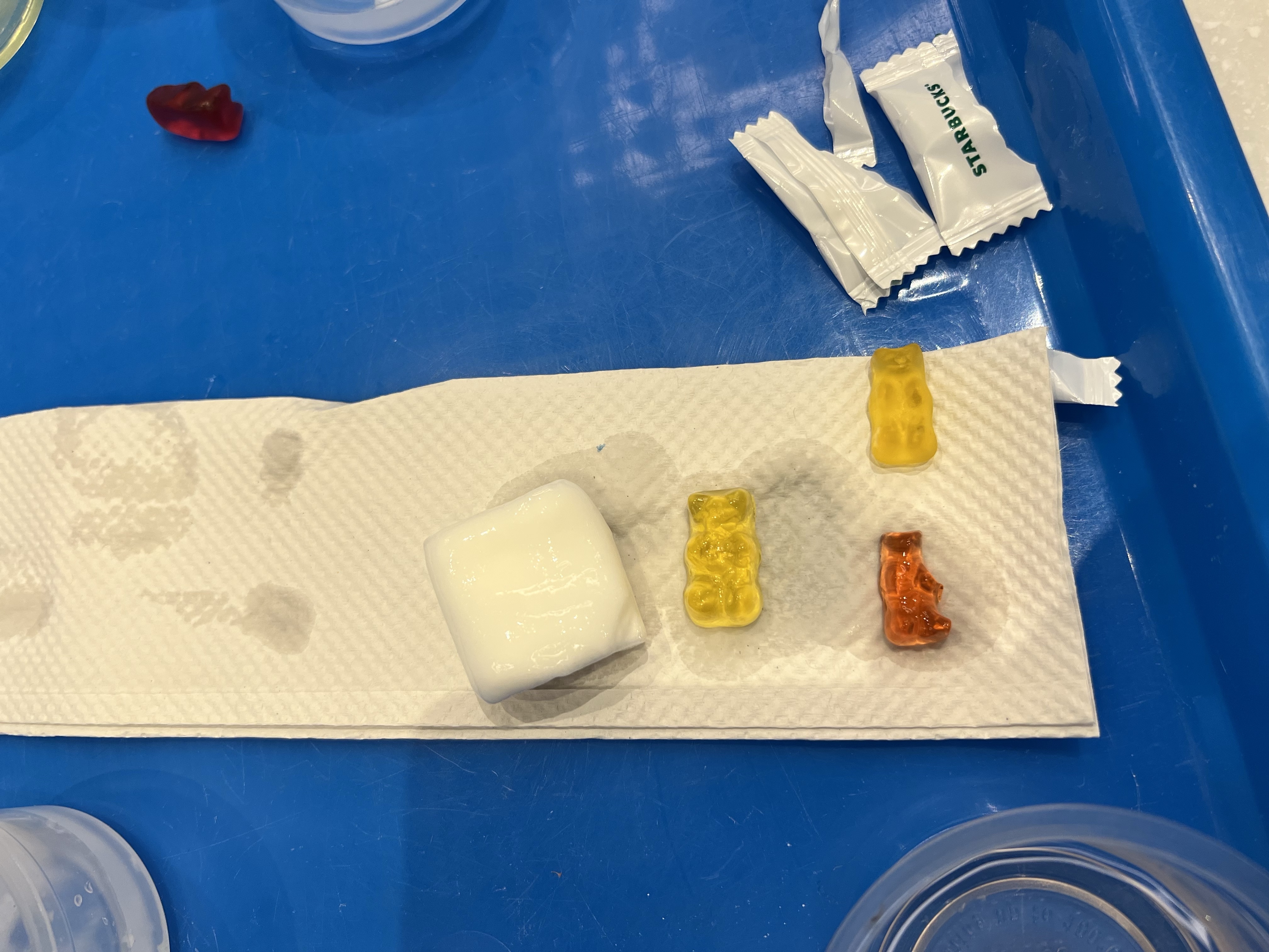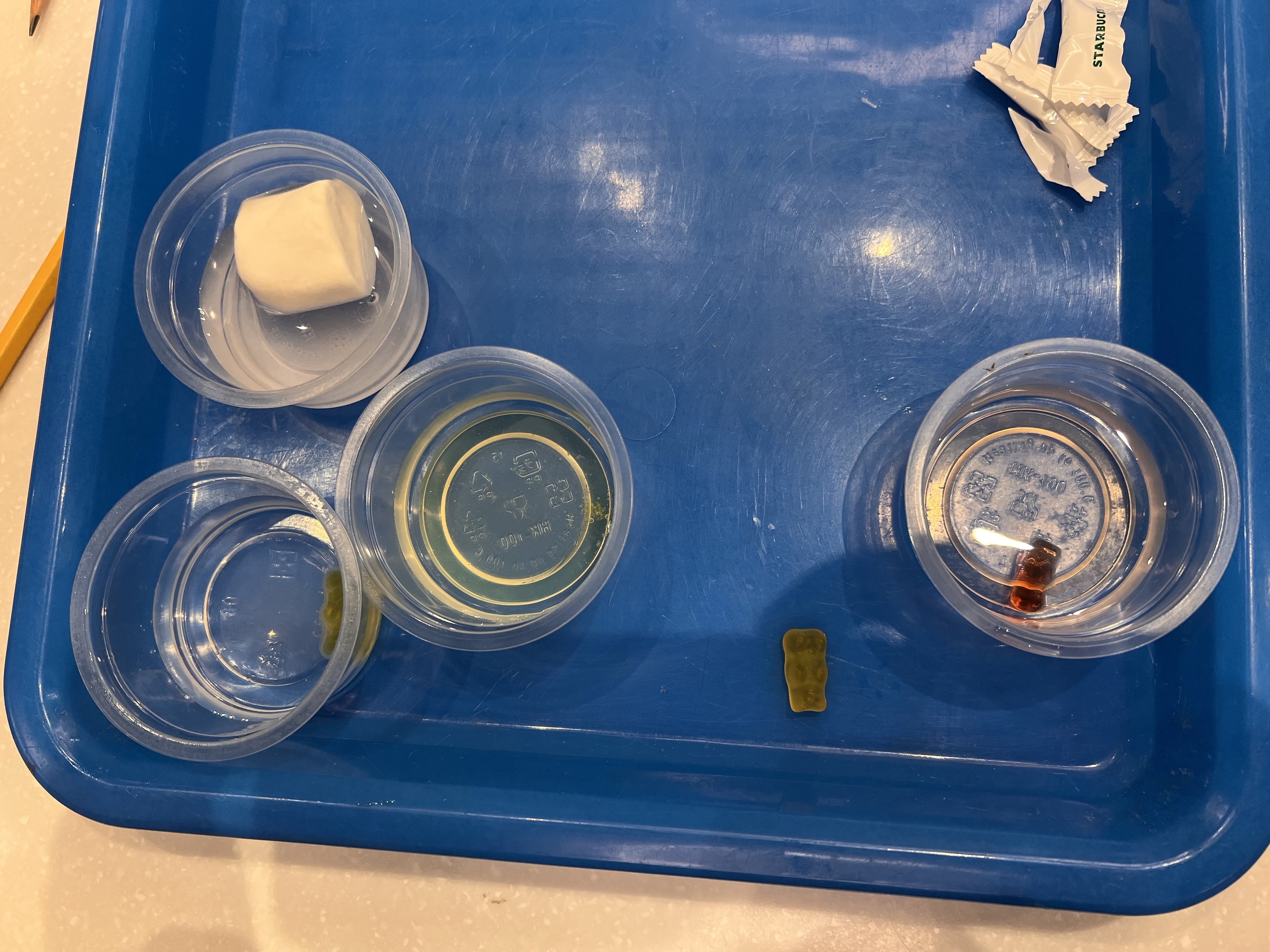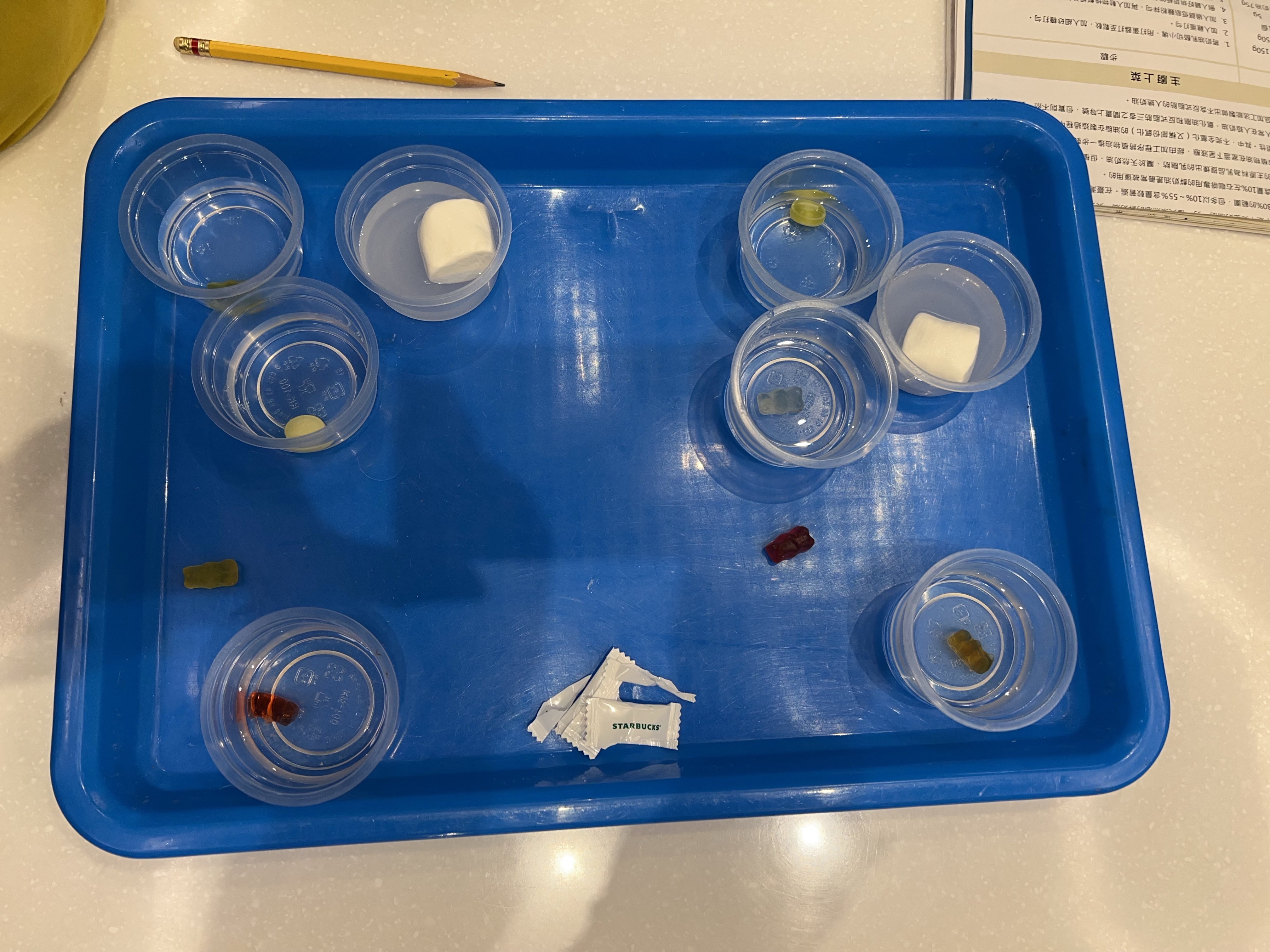 回到剛剛泡水的實驗,可以看到檸檬糖不見了,也就是全部溶化在水中;棉花糖則是變滑滑的,水變混濁,本體也變小,也就是有融化在水中,至於小熊軟糖,則是一個變大一個變小,相當有趣。