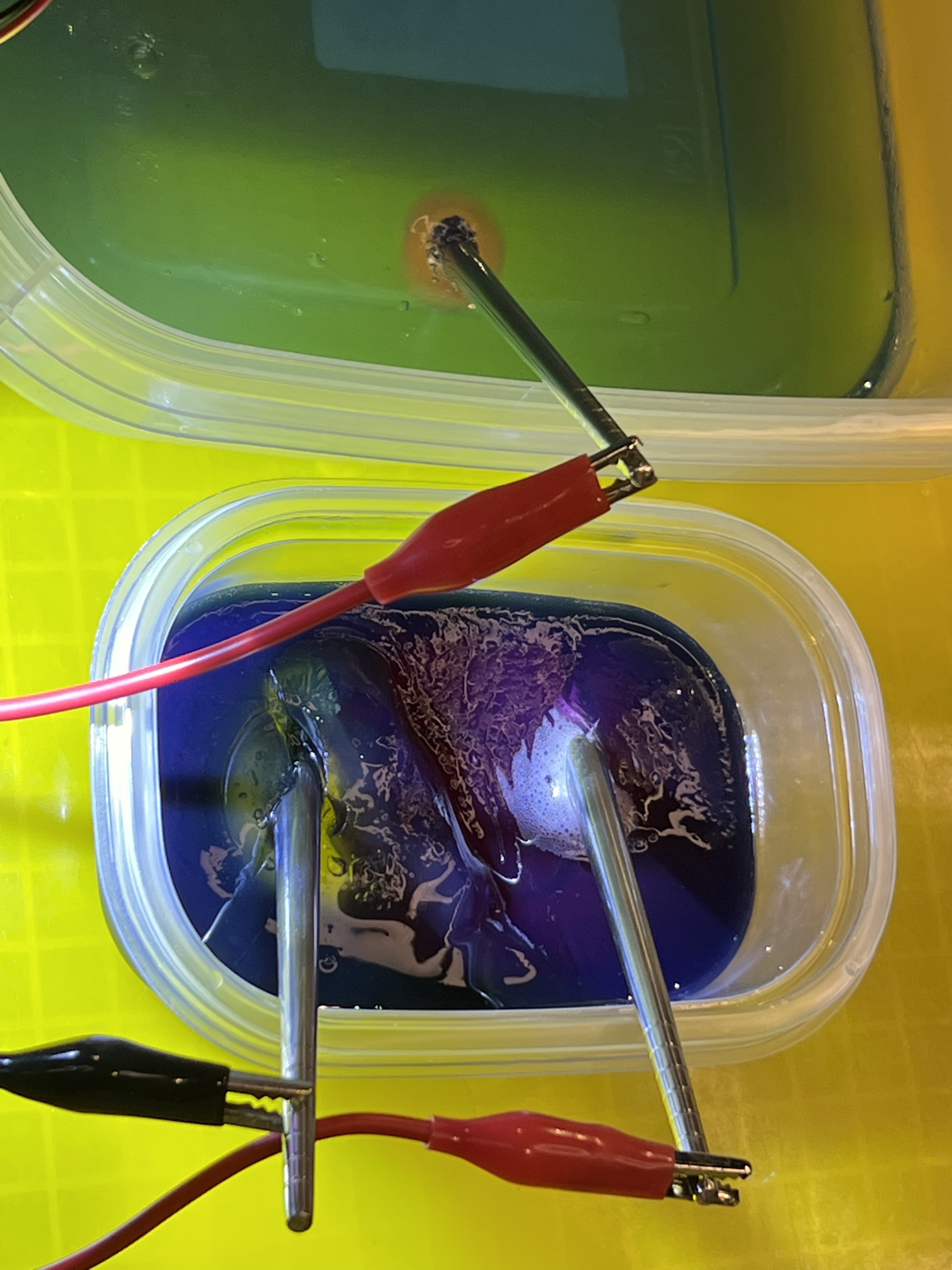 在製作過程中,老師也將彩色果凍實驗的反應,讓小朋友觀察,可以看到正負極的位置開始變色了!十分有趣的現象!
