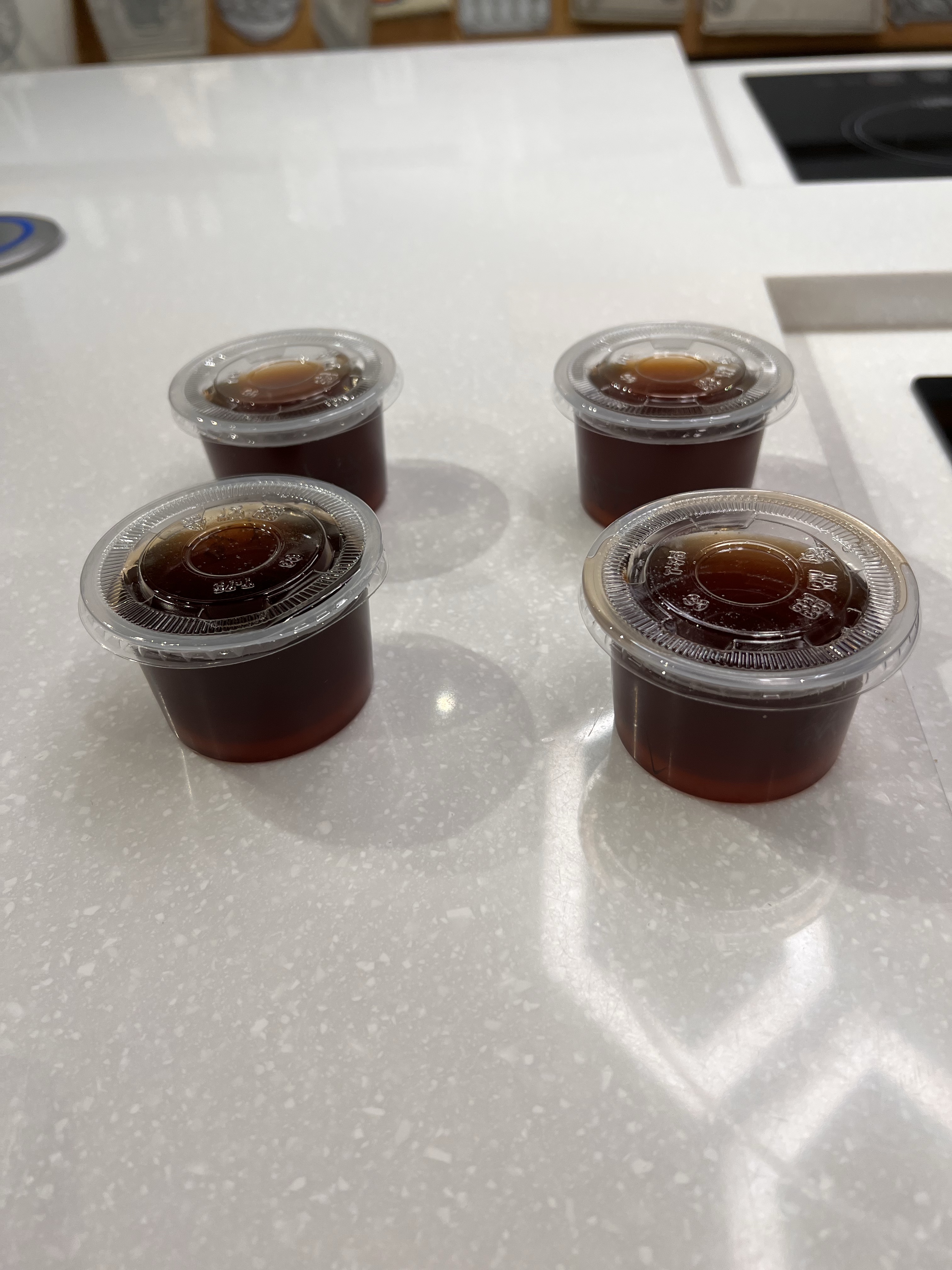 接下來換果凍,這次是做紅茶果凍,量好數量,然後慢慢加熱,小冒泡之後,加入果凍粉,然後將結塊攪拌去除,去除完畢就可以倒到容器中,然後放到冰箱,讓他凝固。