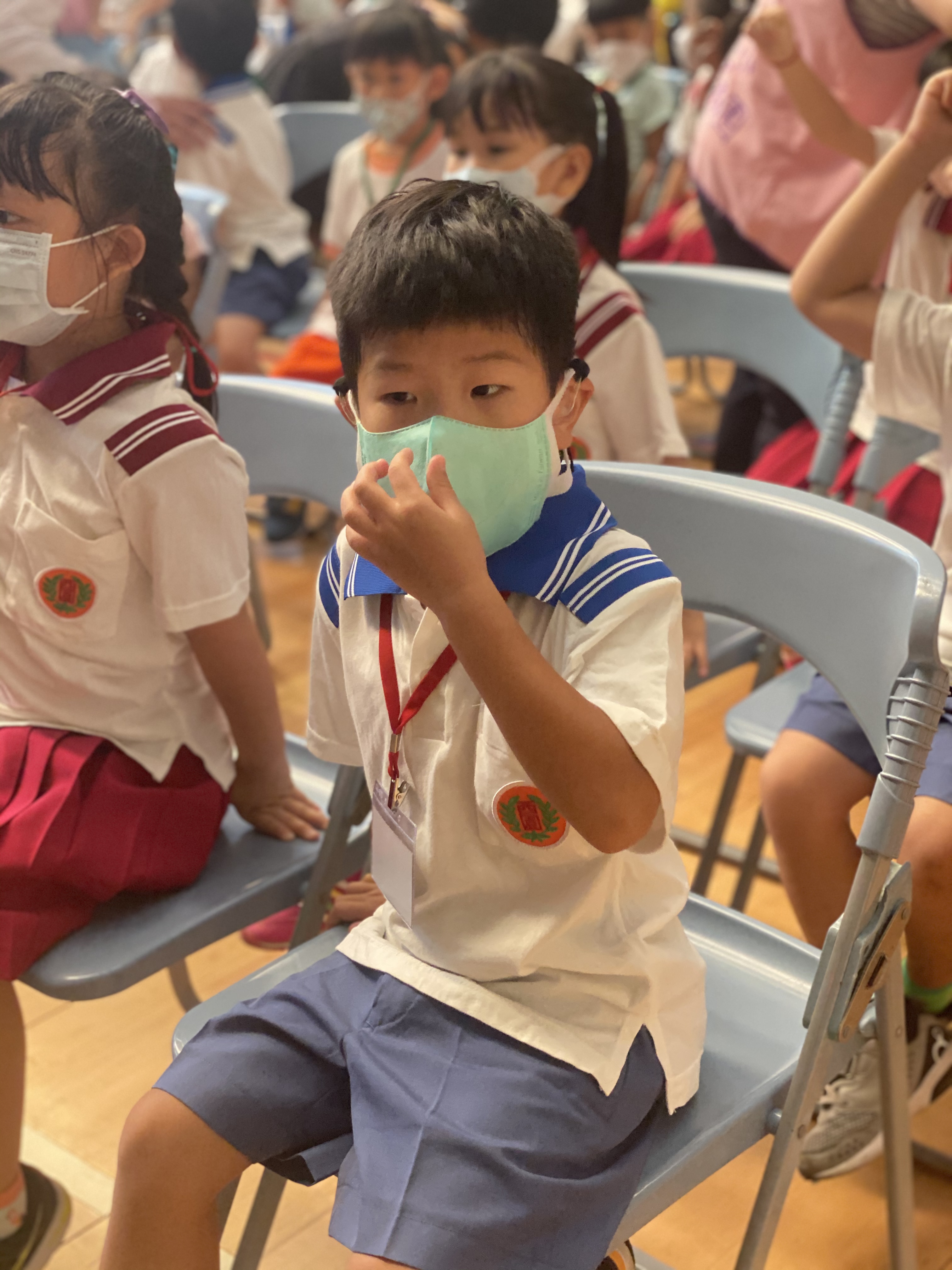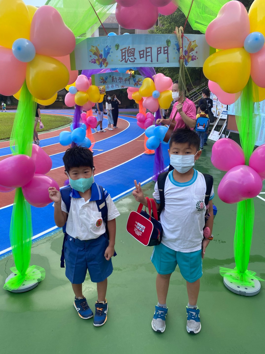 小學門口還是跟以往一樣,只是多了很多檢驗體溫的部分,然後進入拱門內,然後拍照打卡。我們就一起去教室,大沐沐就自己去找自己的教室,沐爸就陪著小沐沐找教室,在教室認識老師跟同學一下,就出發去活動中心參加新生訓練。